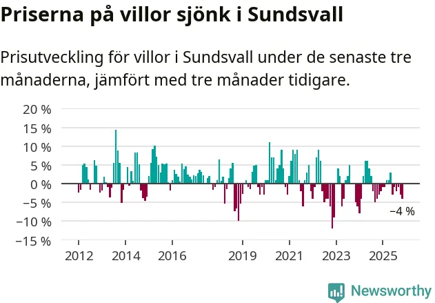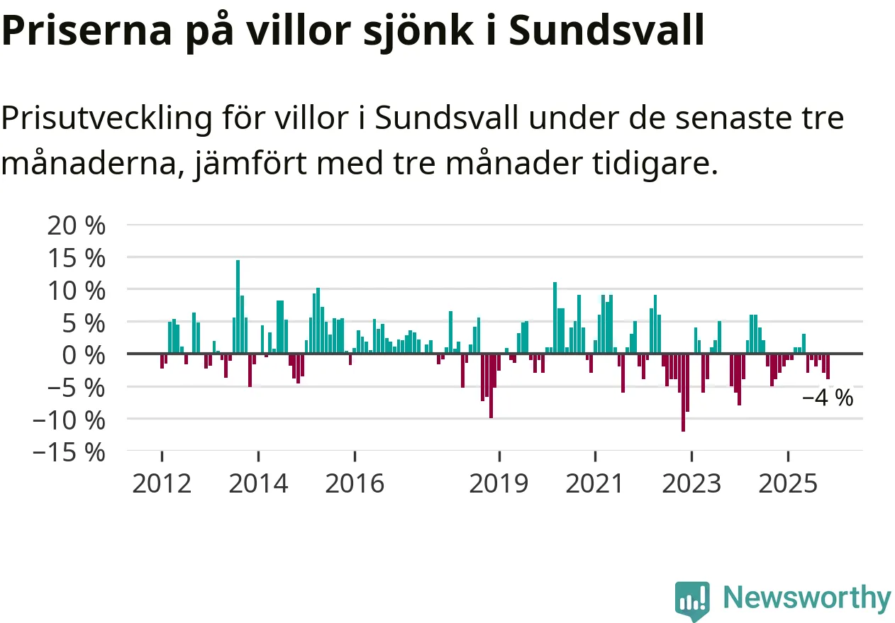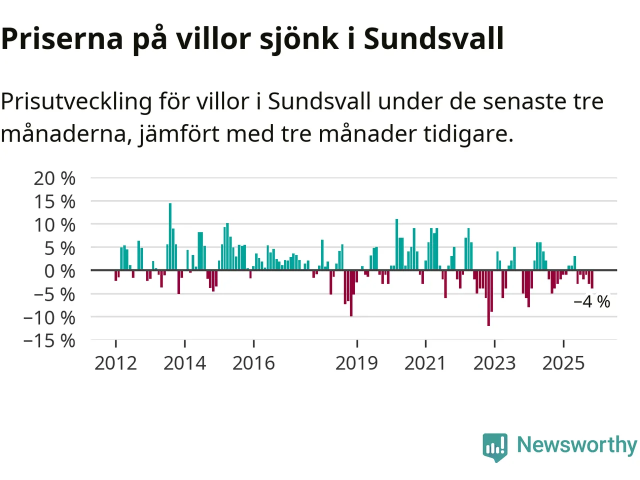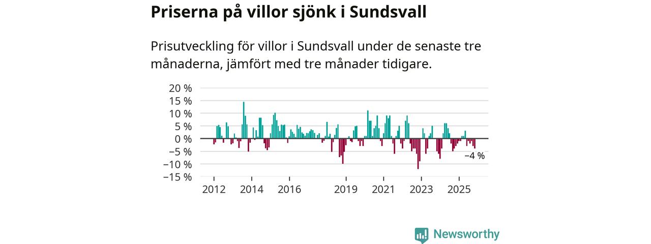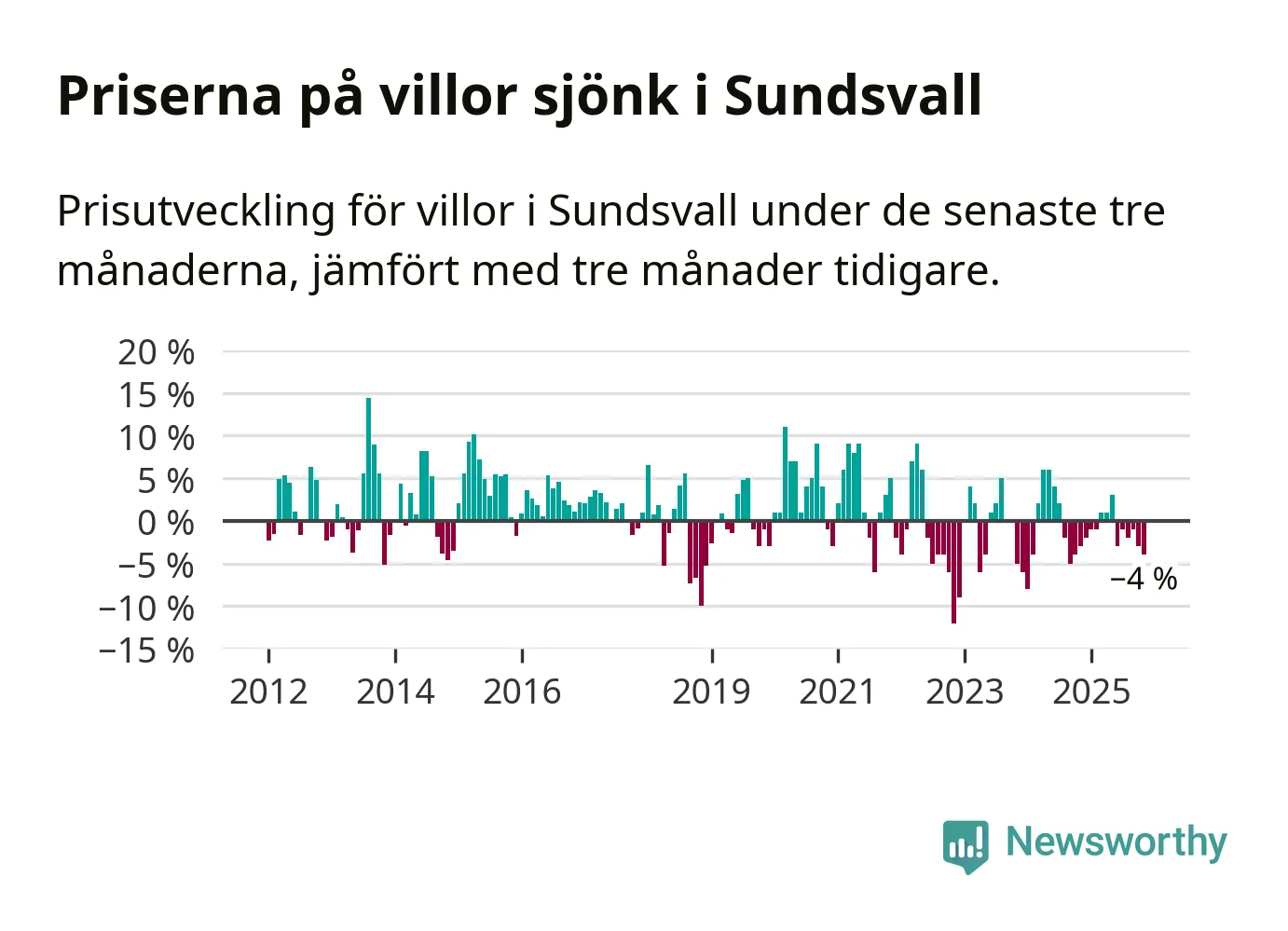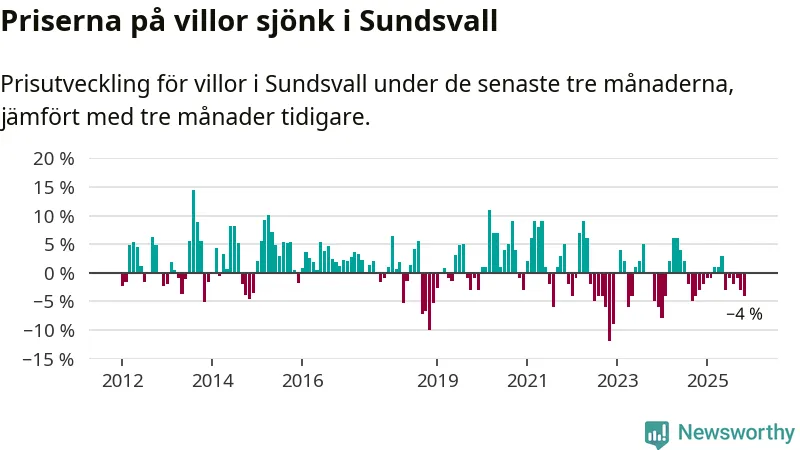 Villapriserna har gått ner i Sundsvalls kommun. Medelpriset på försäljningarna under de senaste tre månaderna visar på en nedgång med 4 procent.