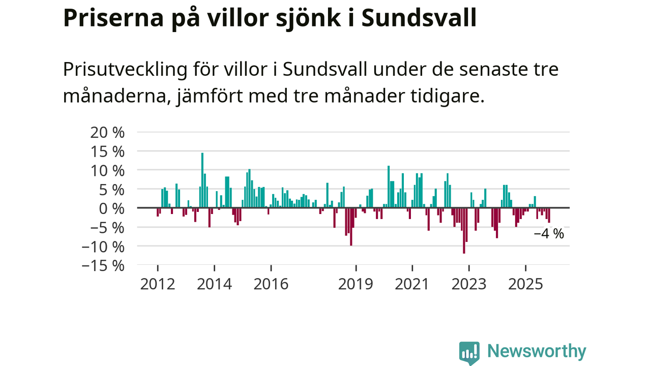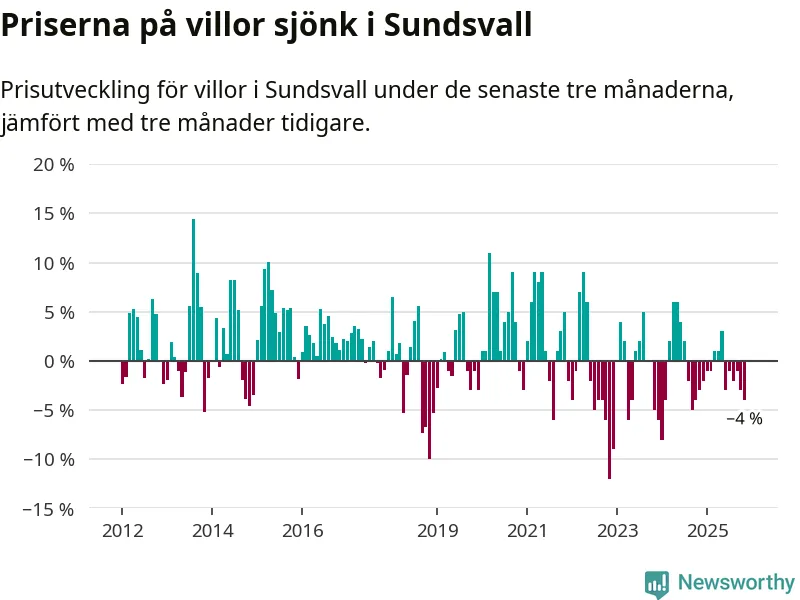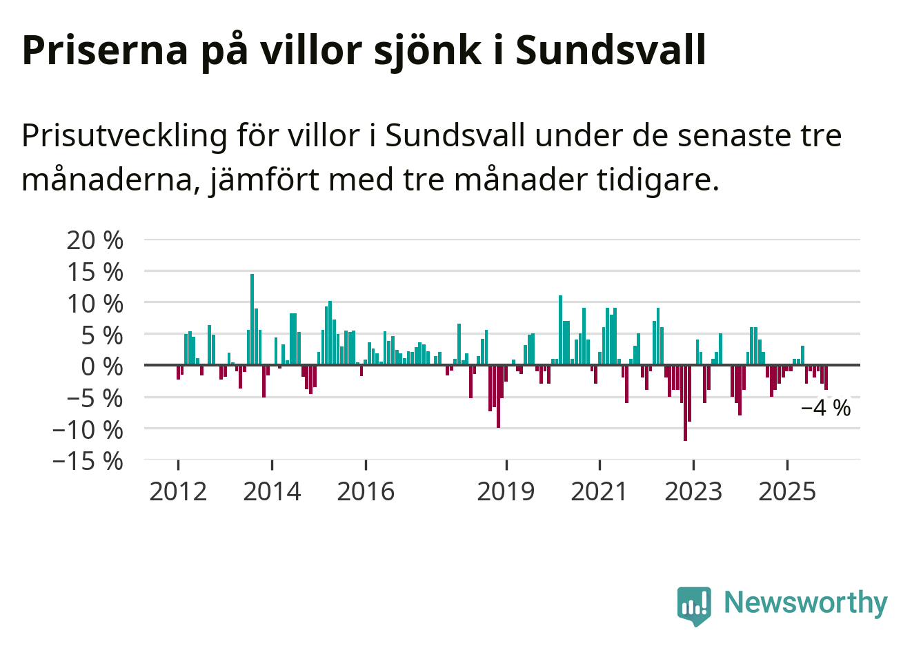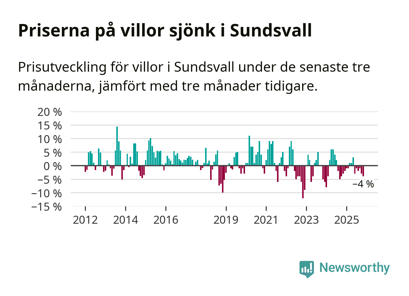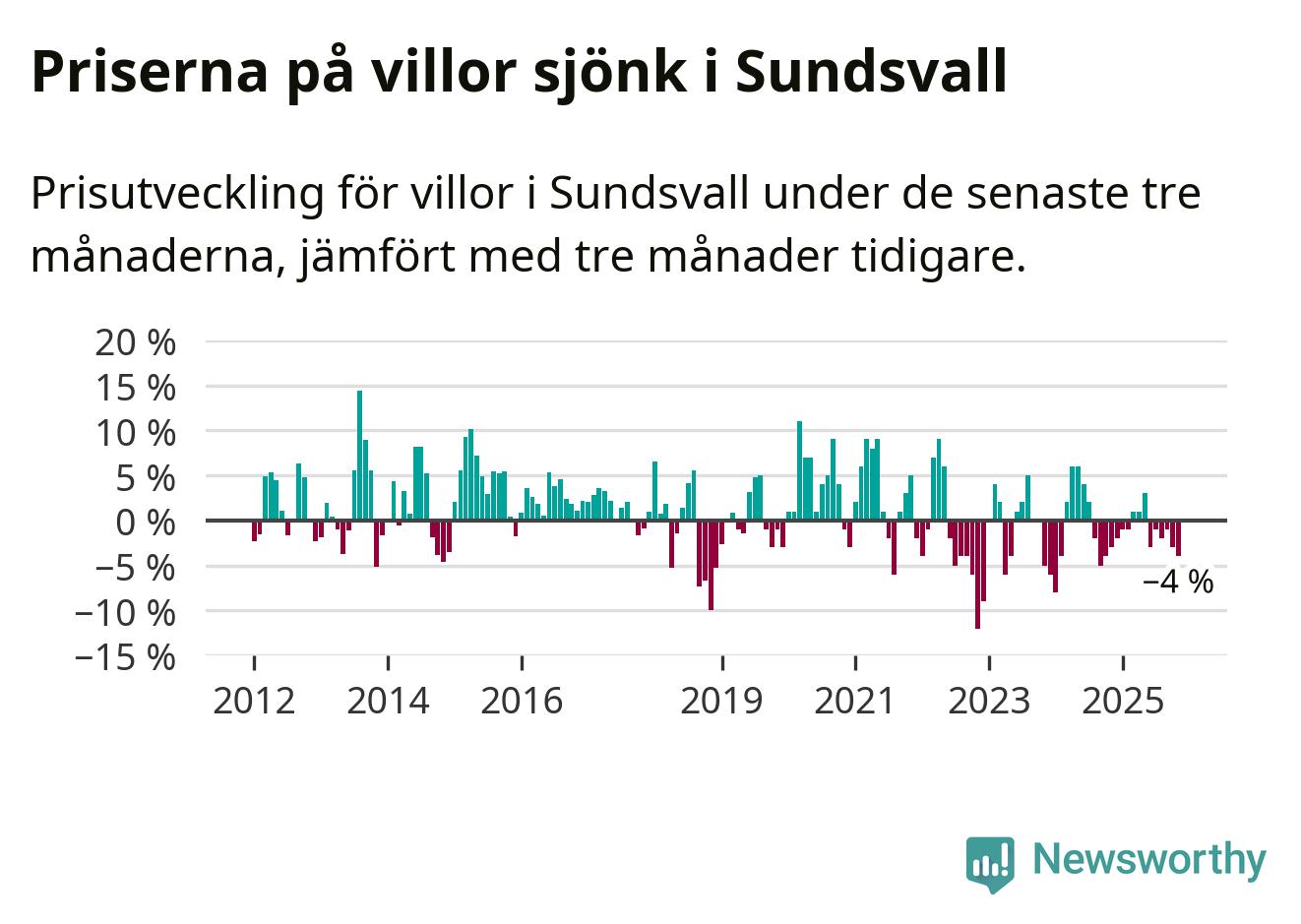 Villapriserna har gått ner i Sundsvalls kommun. Medelpriset på försäljningarna under de senaste tre månaderna visar på en nedgång med 4 procent.