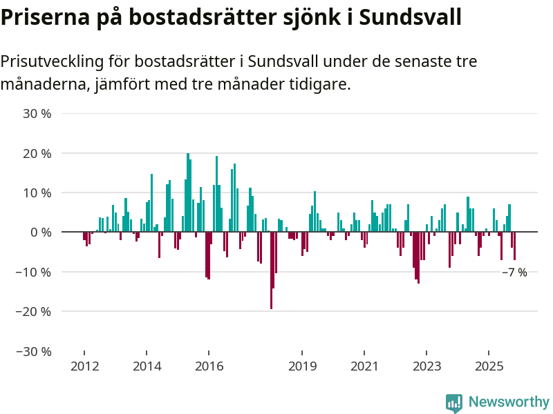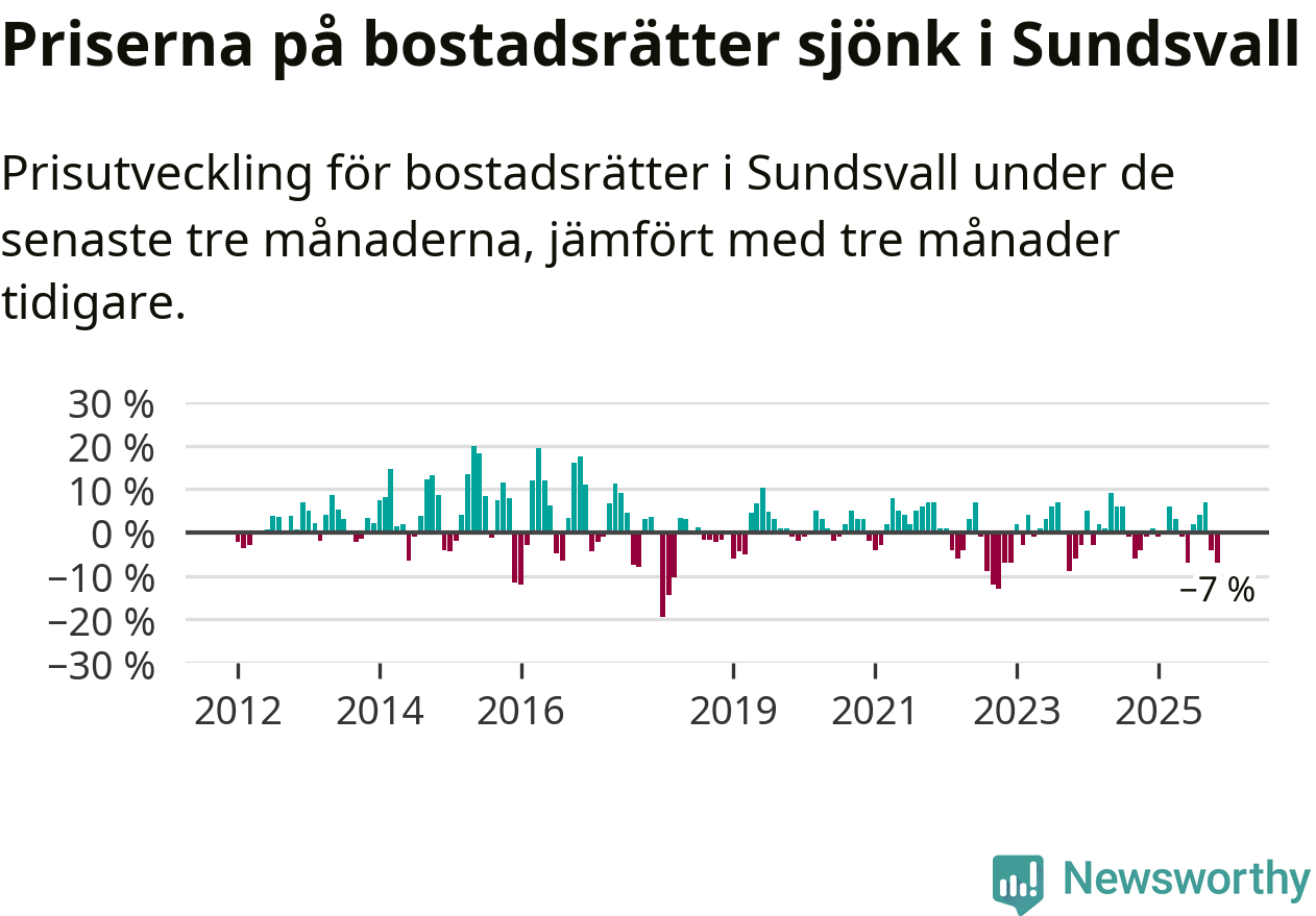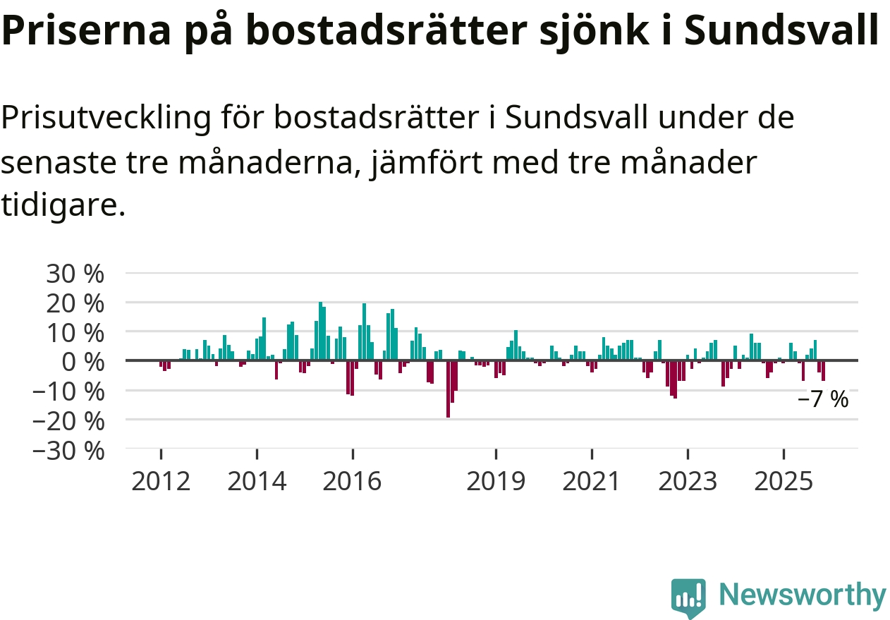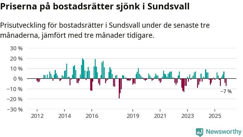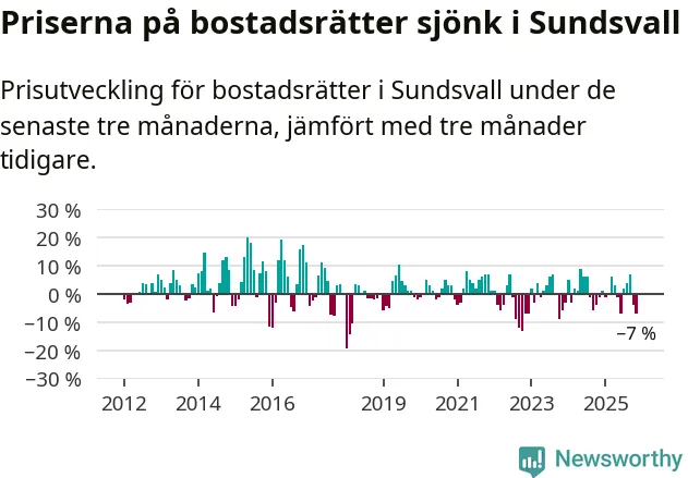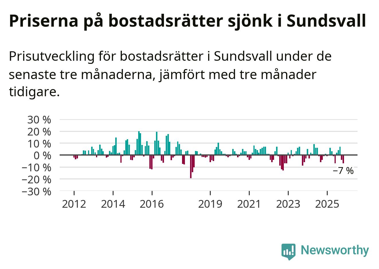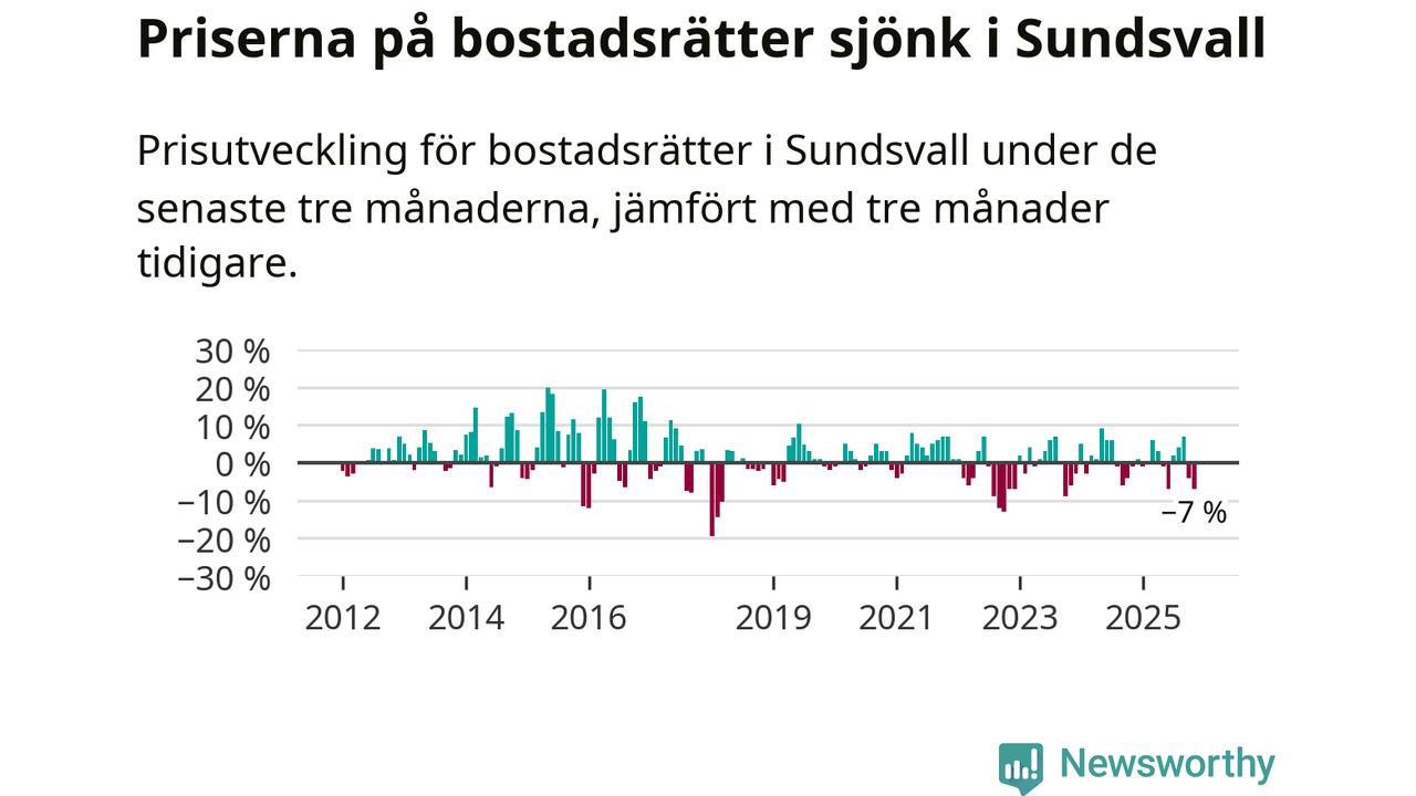 Statistiken visar även på en kännbar prisnedgång i Sundsvalls kommun. Medelpriset på försäljningarna av bostadsrätter i kommunen var 7 procent lägre än för tre månader sedan. Även i hela Västernorrland sjunker priserna på bostadsrätter. I hela länet noterades en prisnedgång på 3 procent.