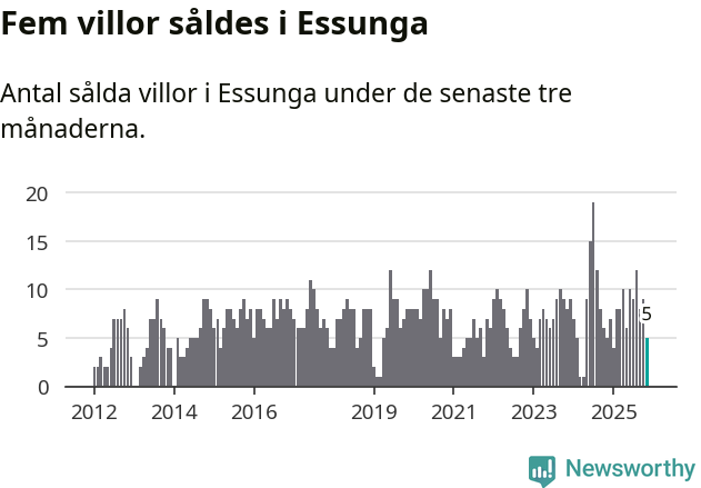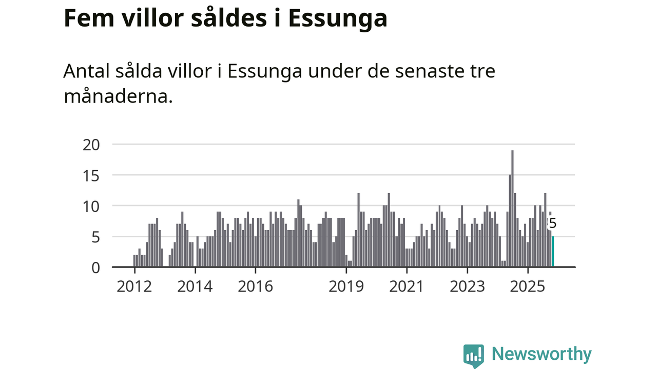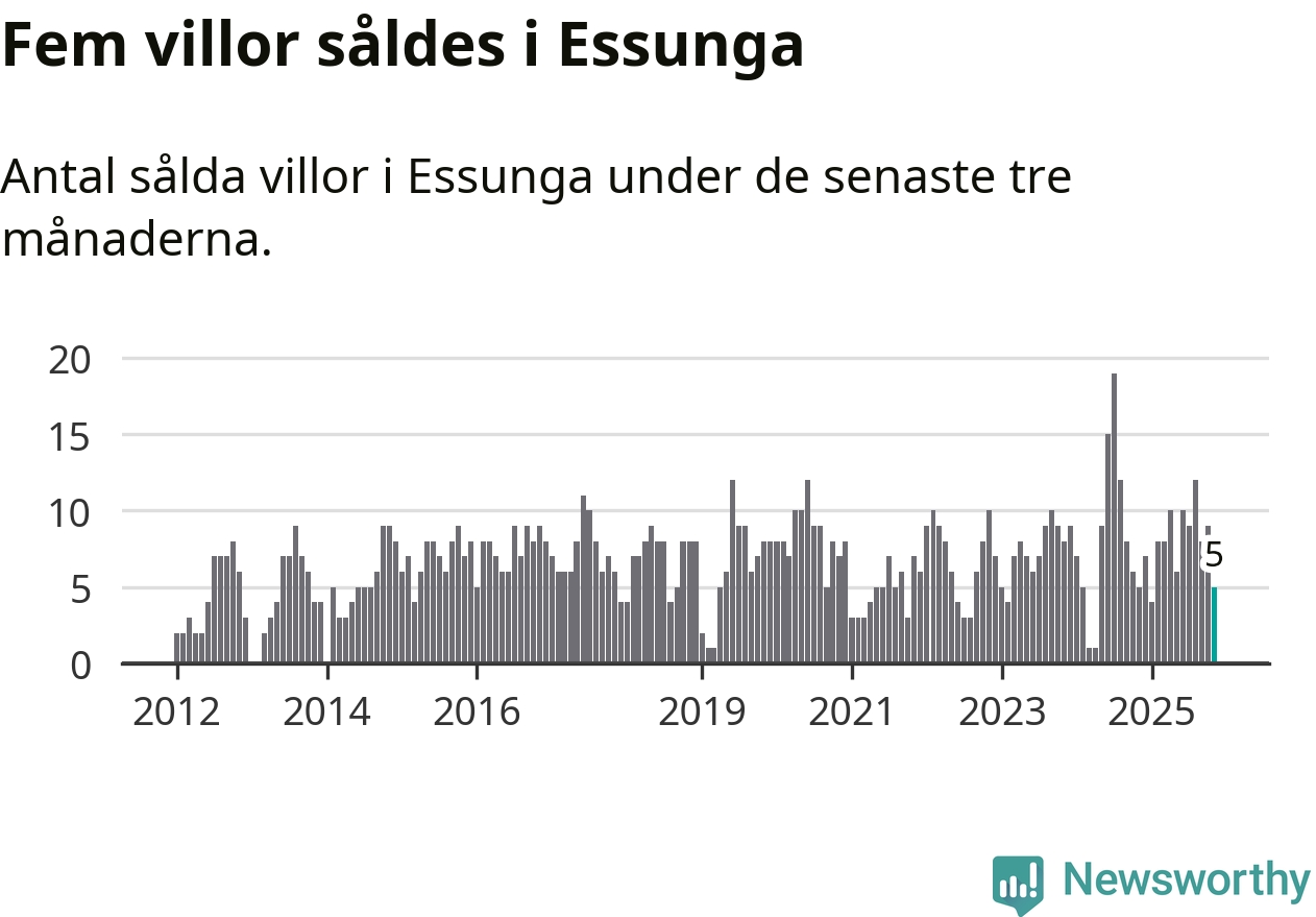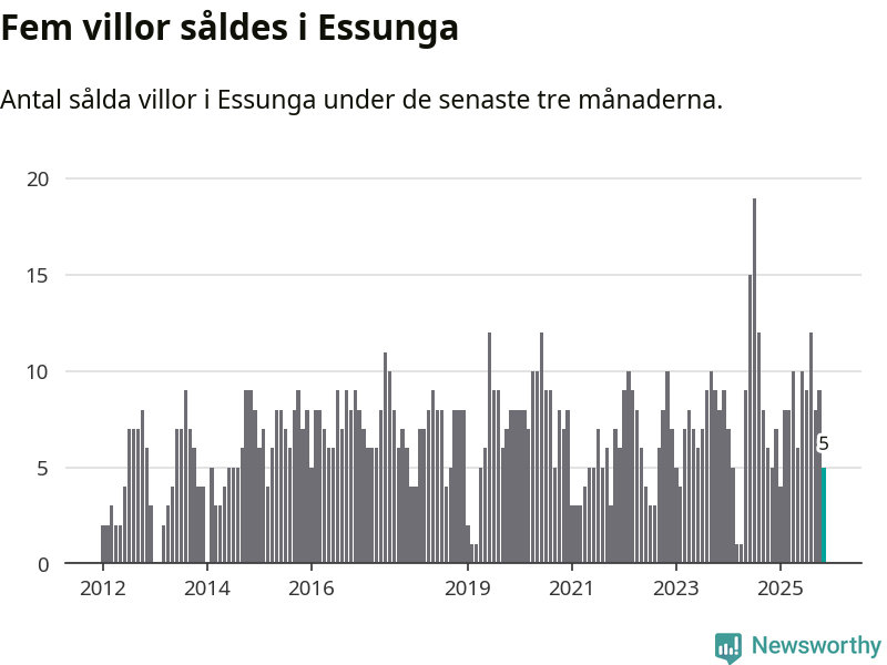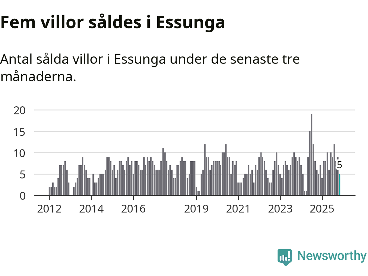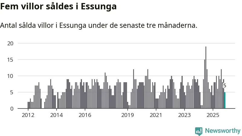Mellan september och november gjordes sammanlagt fem affärer med villor i Essunga kommun. Det är lika många affärer som vid motsvarande tid i fjol.