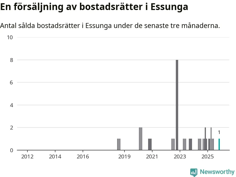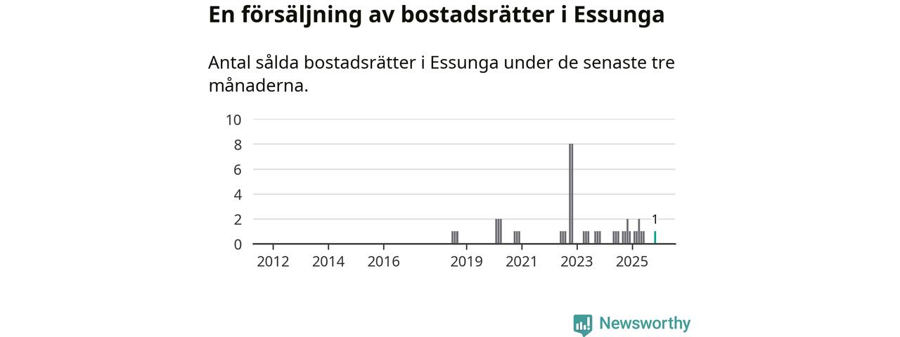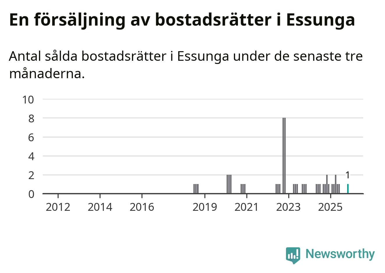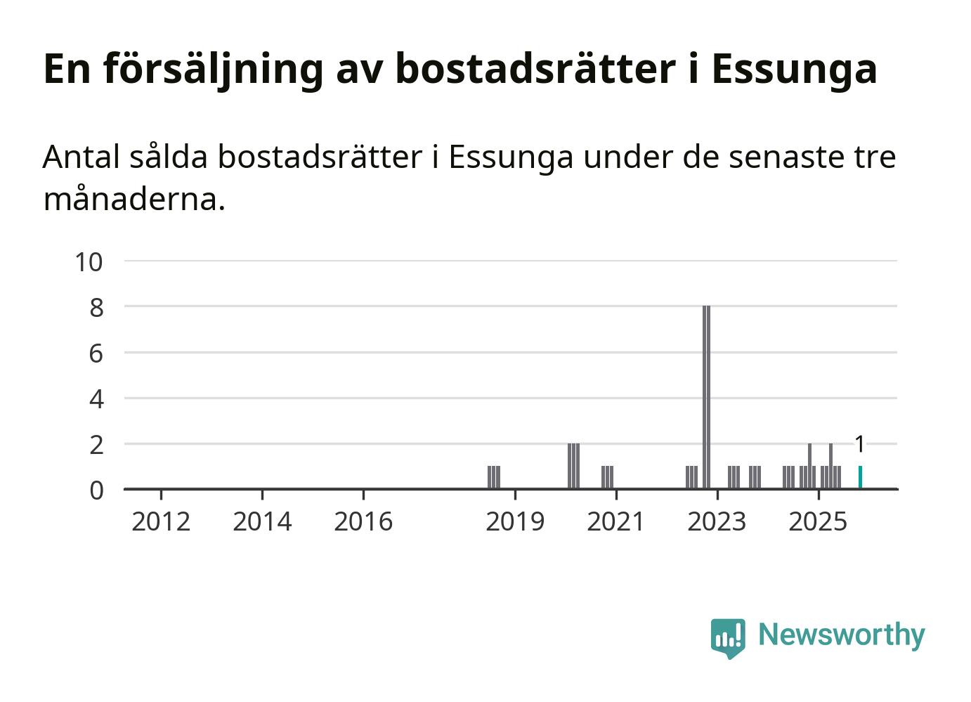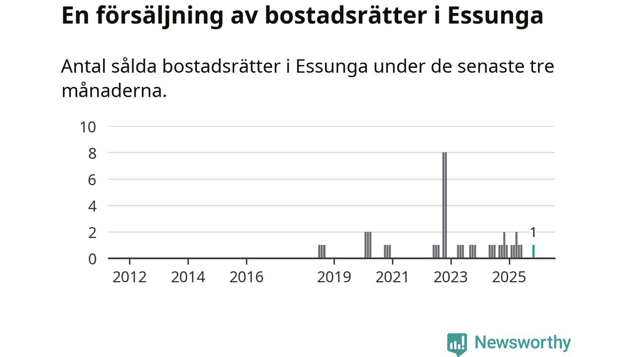 Mellan september och november gjordes sammanlagt en affär med bostadsrätter i Essunga kommun. Det kan jämföras med två vid motsvarande tid i fjol.