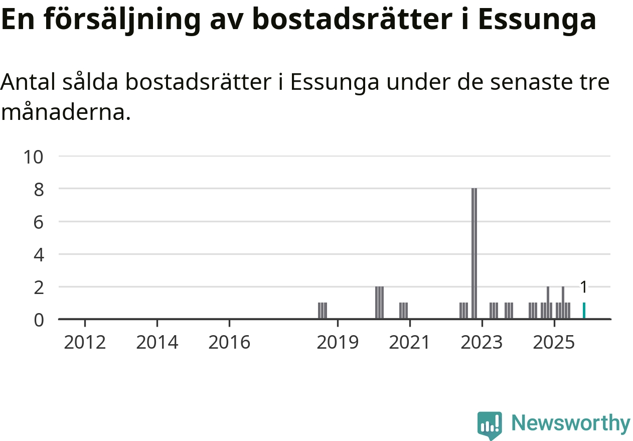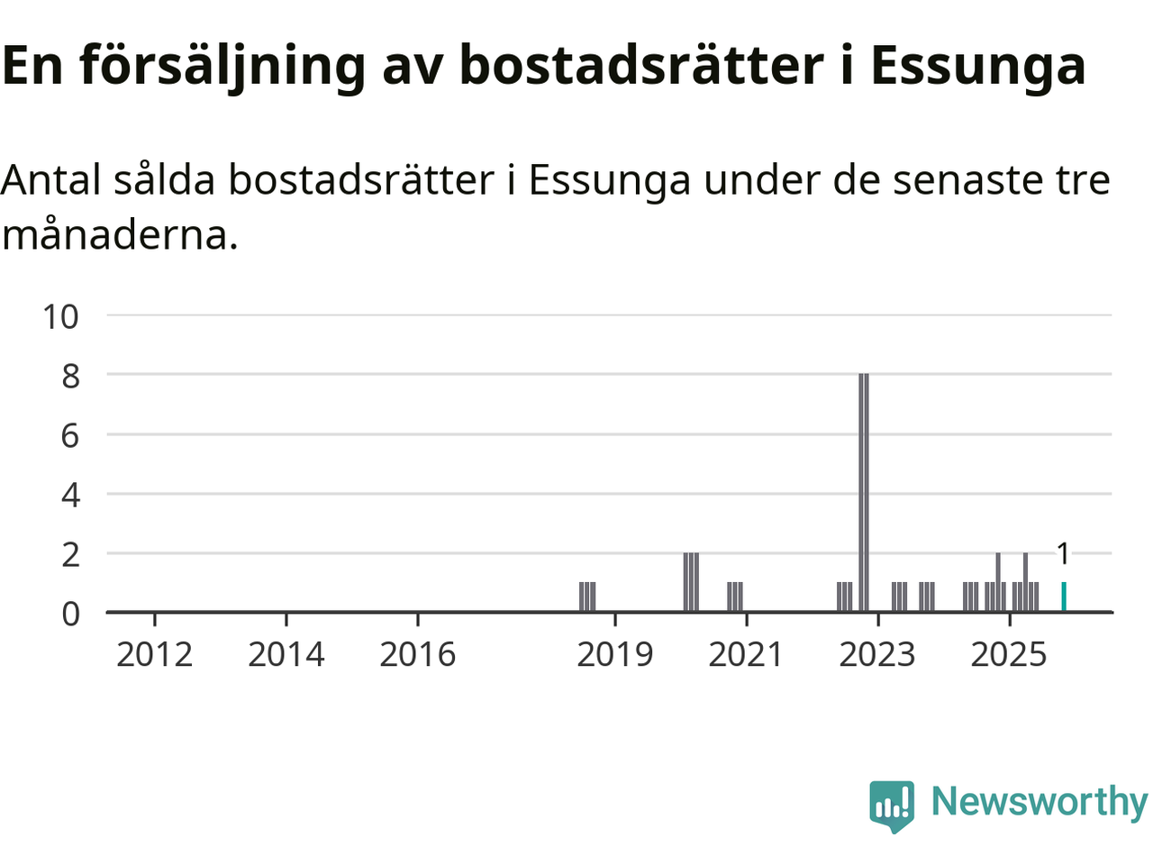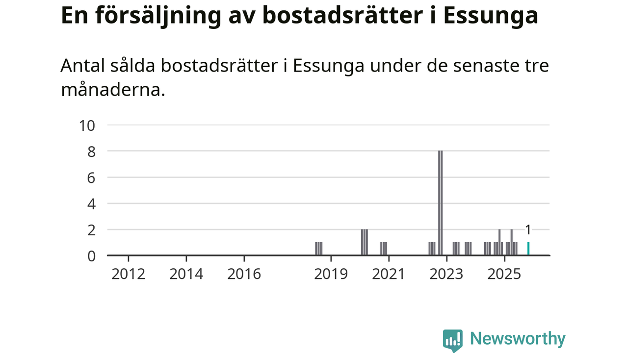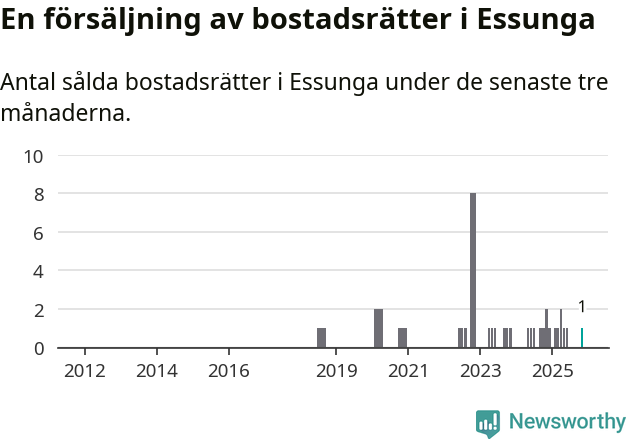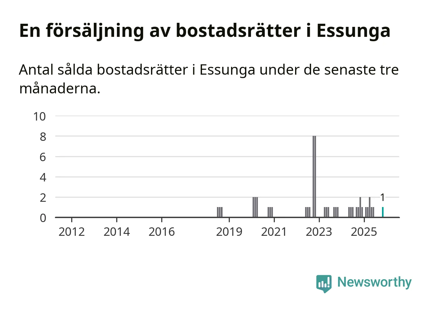 Mellan september och november gjordes sammanlagt en affär med bostadsrätter i Essunga kommun. Det kan jämföras med två vid motsvarande tid i fjol.