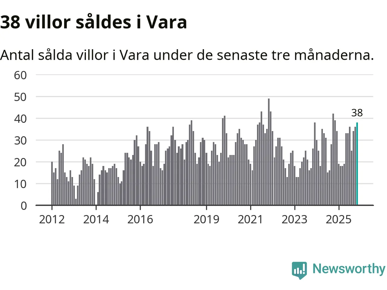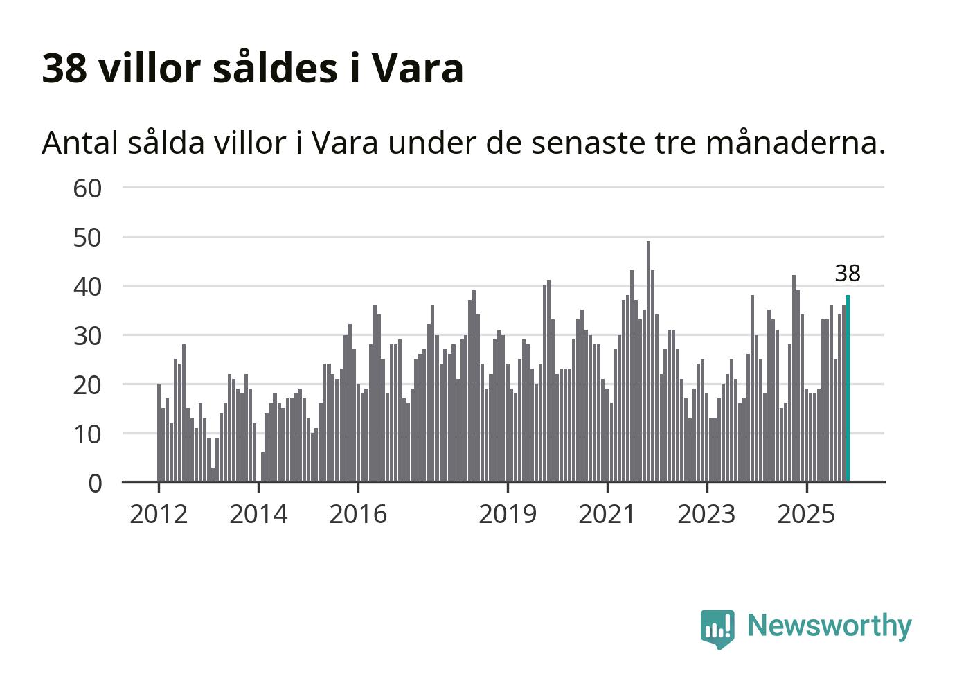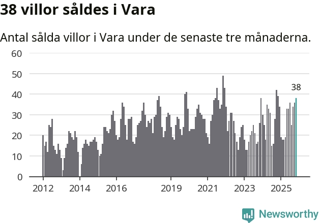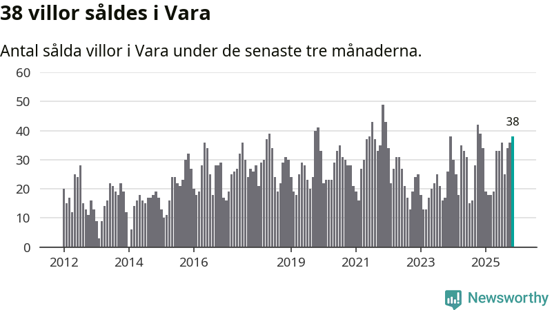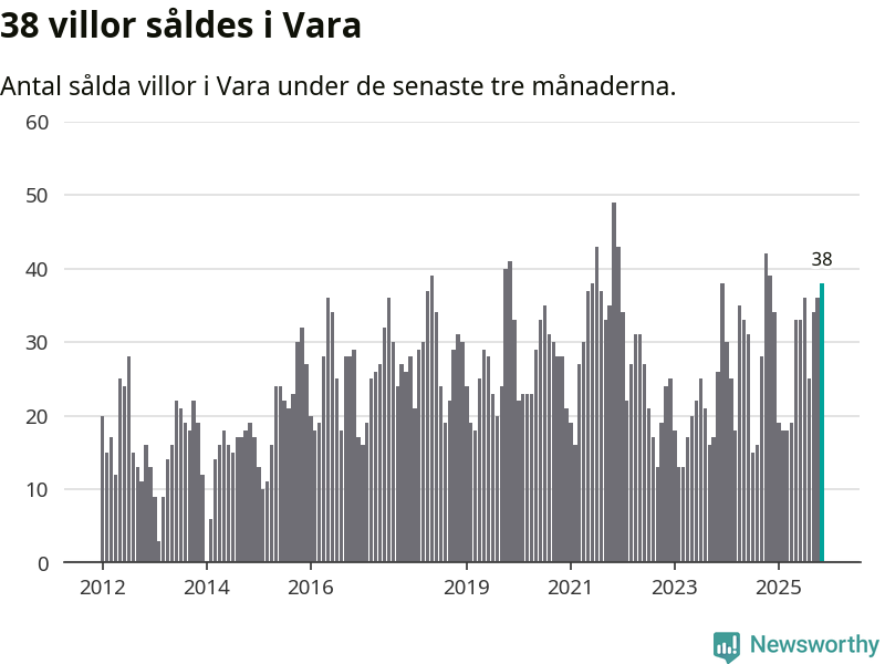 Mellan september och november gjordes sammanlagt 38 affärer med villor i Vara kommun. Det kan jämföras med 39 vid motsvarande tid i fjol.