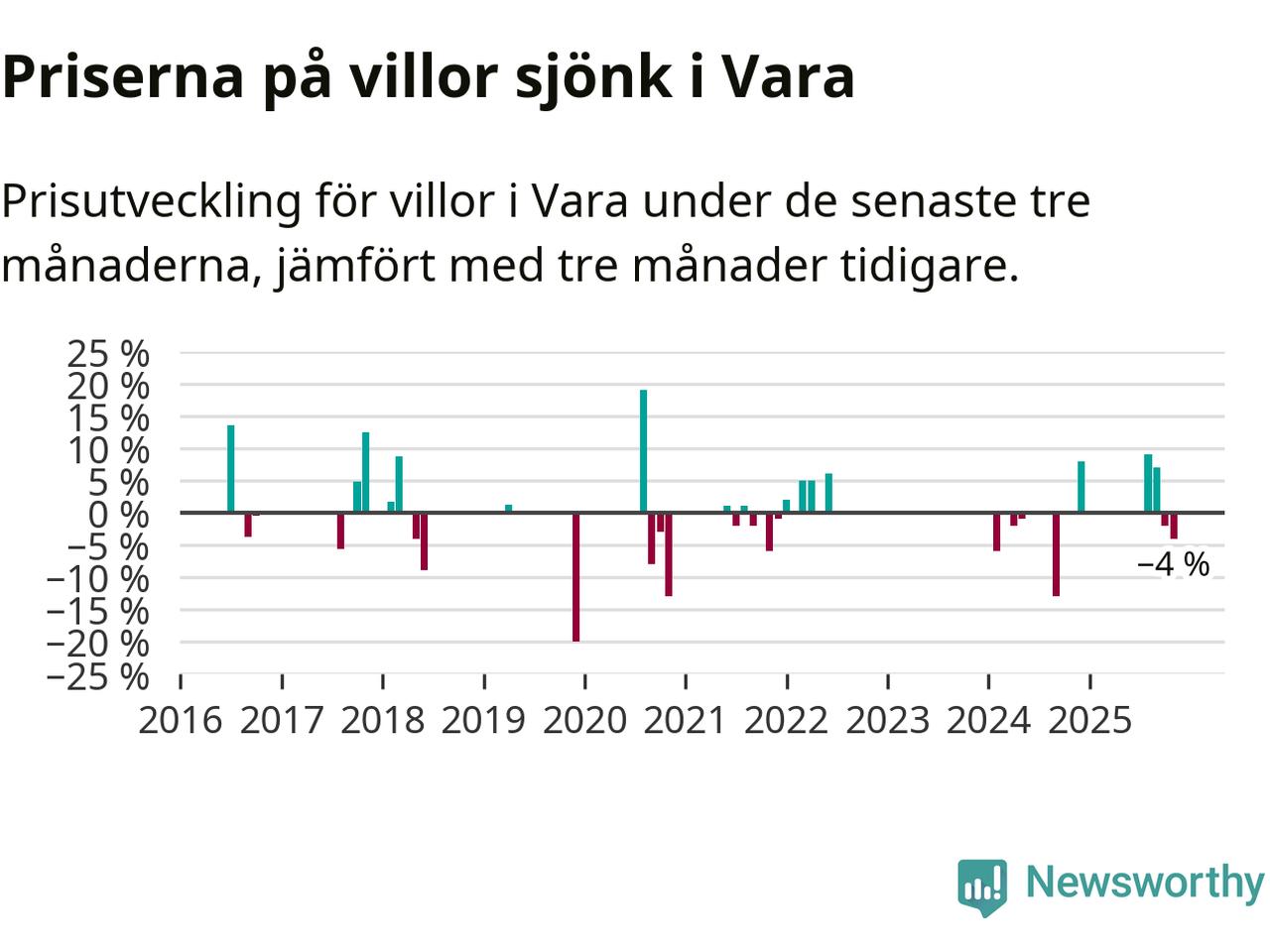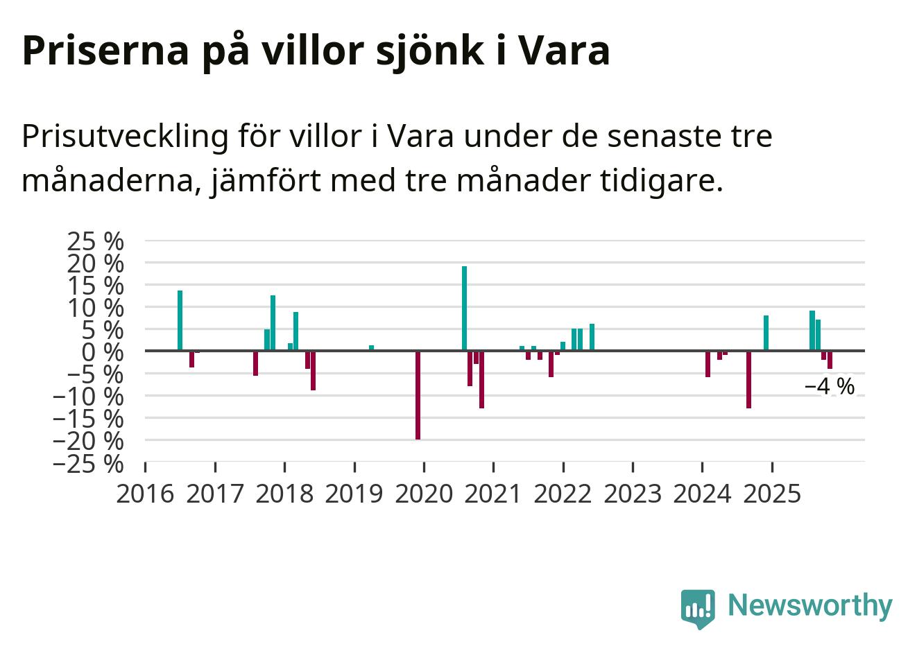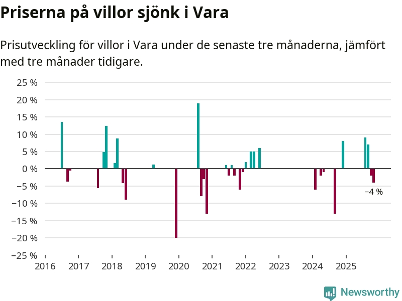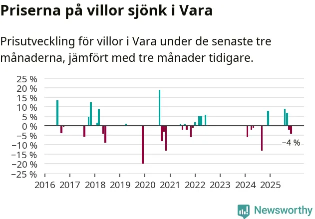 Statistiken visar även på en kännbar prisnedgång i Vara kommun. Medelpriset på försäljningarna av villor i kommunen var 4 procent lägre än för tre månader sedan. Även i hela Västra Götaland sjunker villapriserna. I hela länet noterades en prisnedgång på 4 procent.