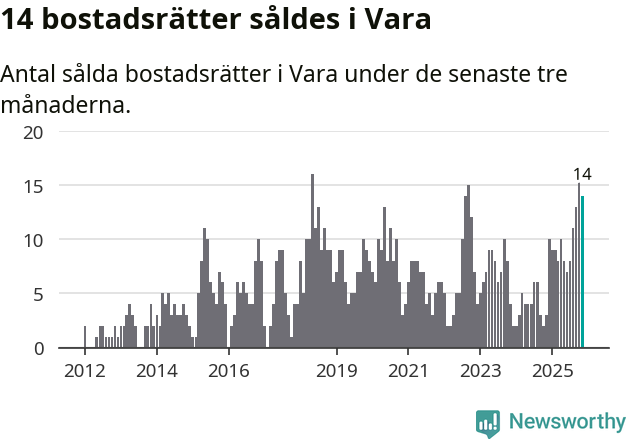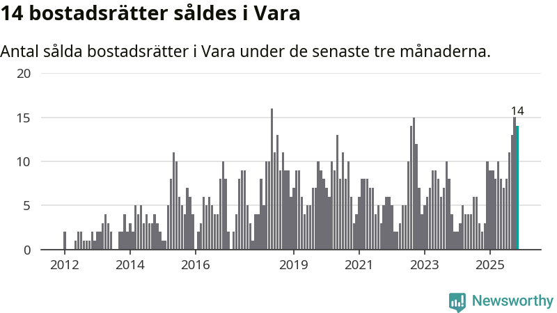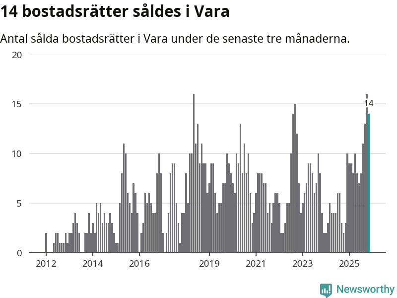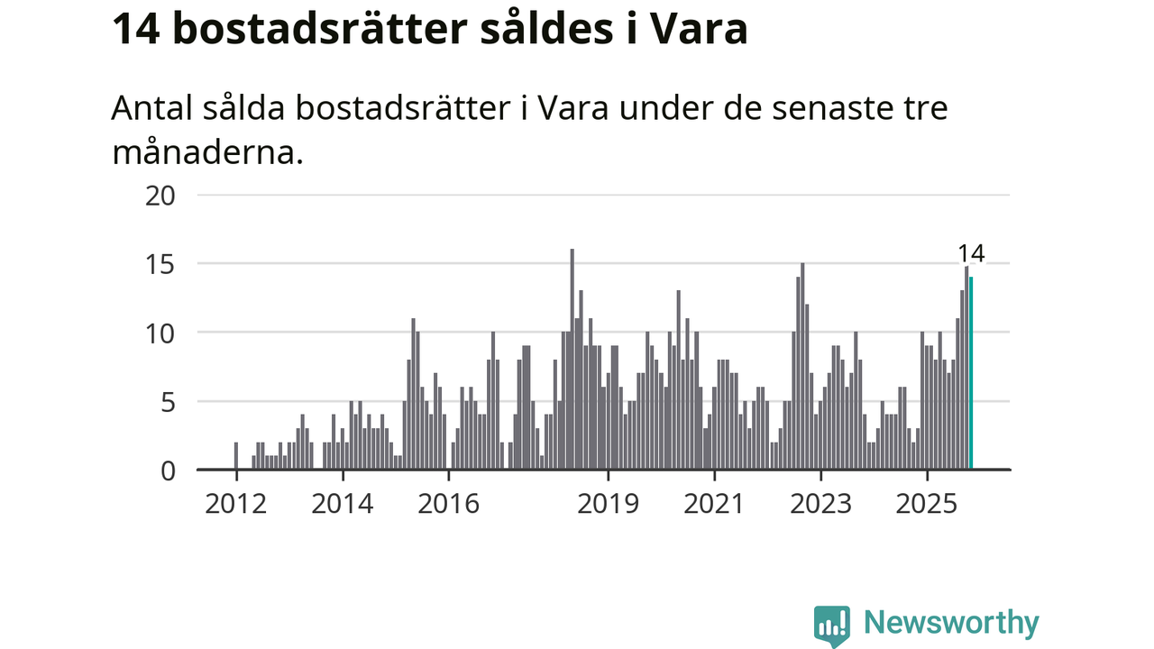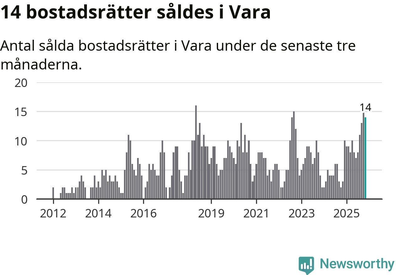 Mellan september och november gjordes sammanlagt 14 affärer med bostadsrätter i Vara kommun. Det kan jämföras med tre vid motsvarande tid i fjol.