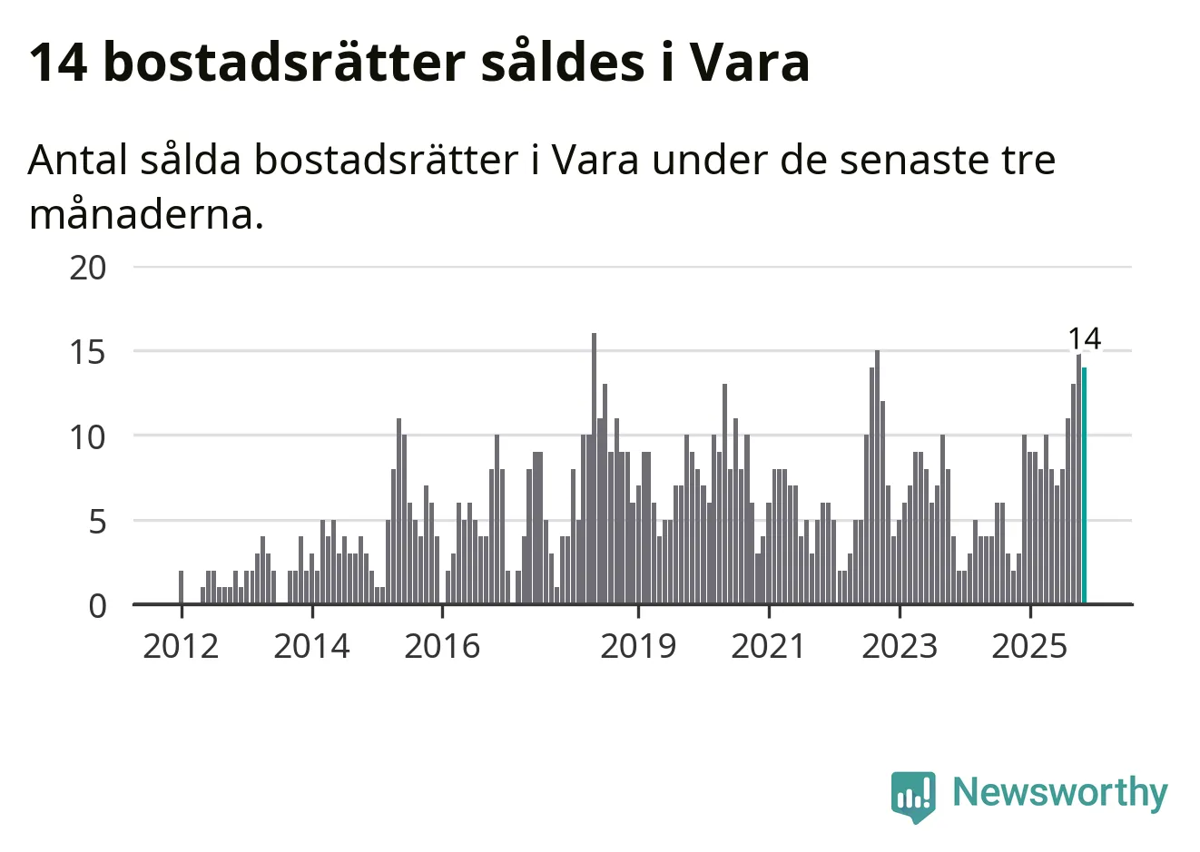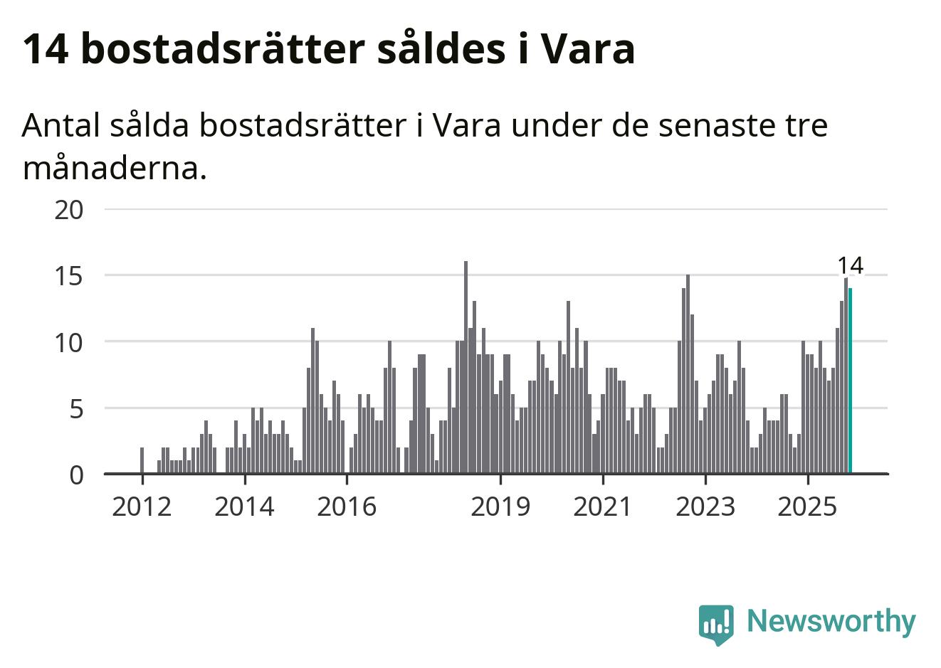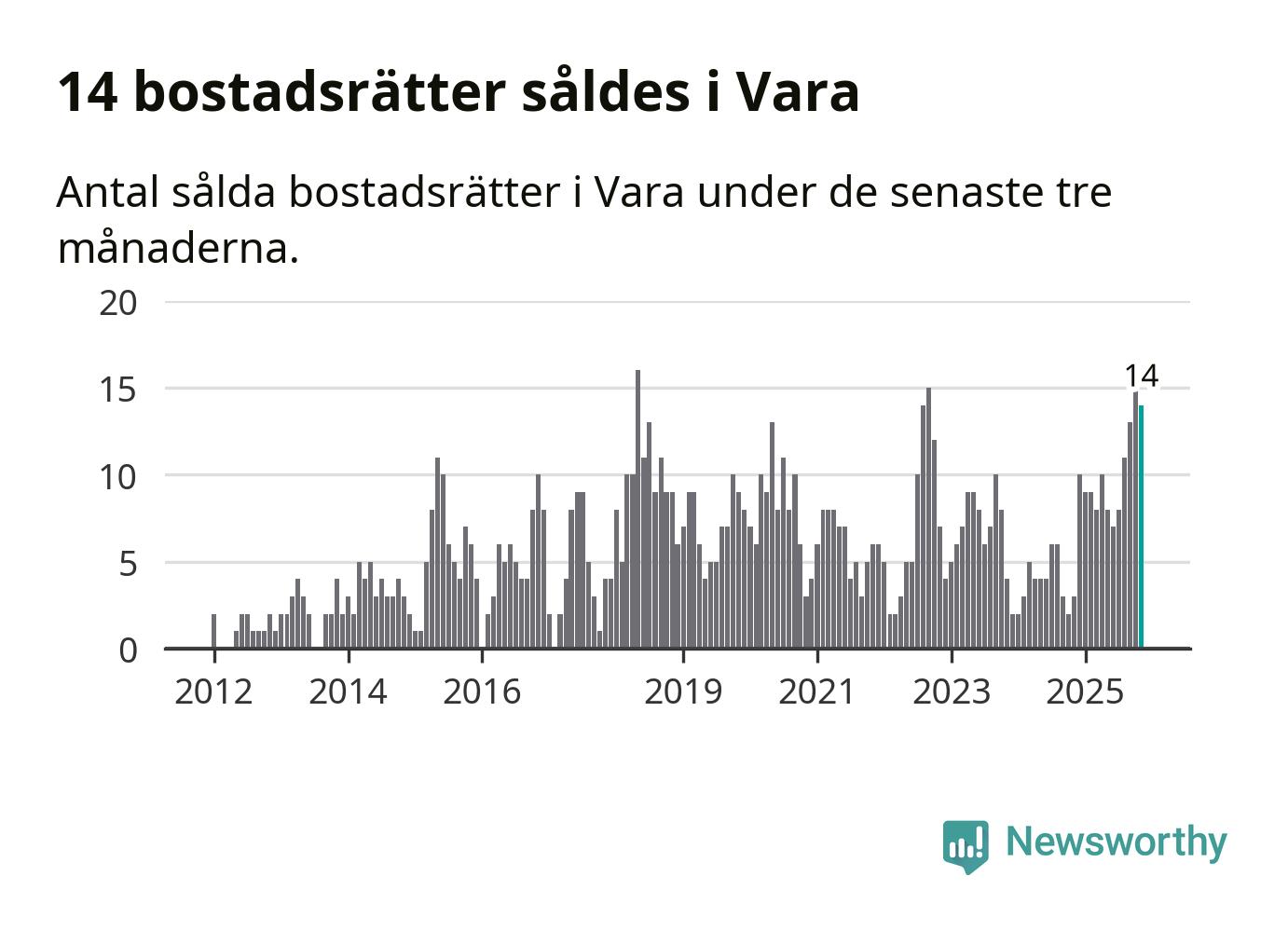 Mellan september och november gjordes sammanlagt 14 affärer med bostadsrätter i Vara kommun. Det kan jämföras med tre vid motsvarande tid i fjol.