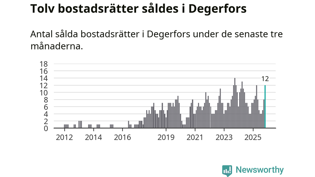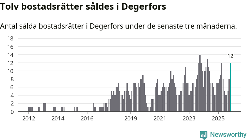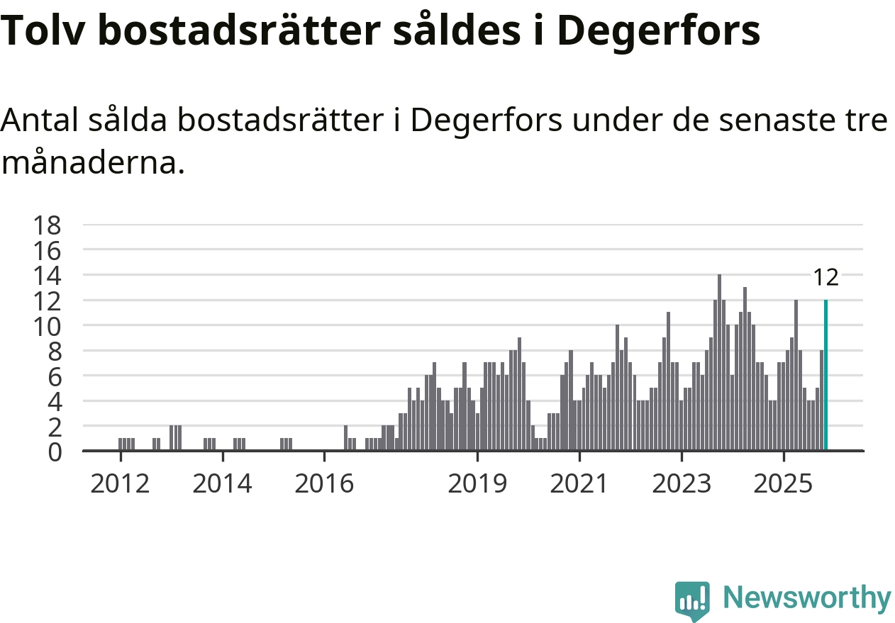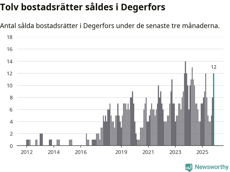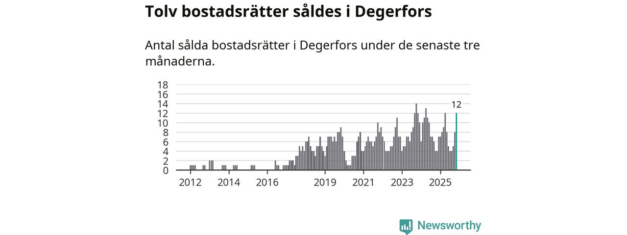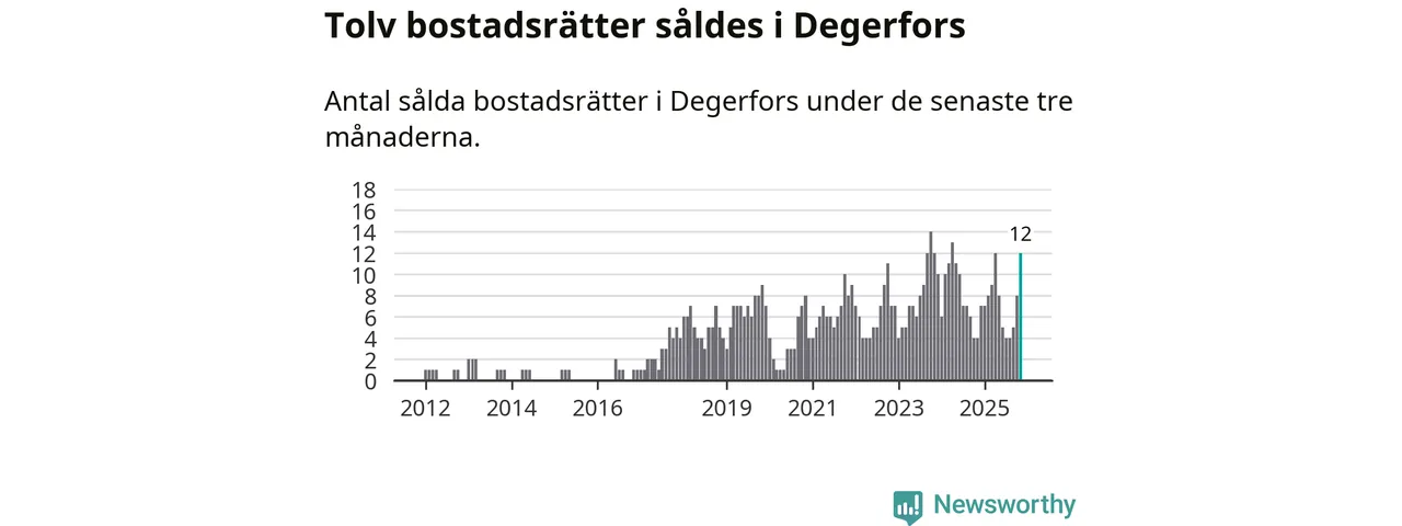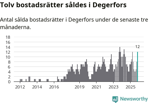 Mellan september och november gjordes sammanlagt tolv affärer med bostadsrätter i Degerfors kommun. Det kan jämföras med fyra vid motsvarande tid i fjol.