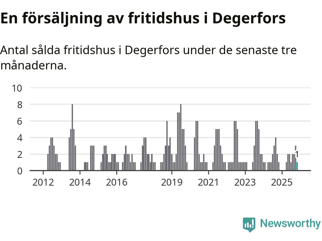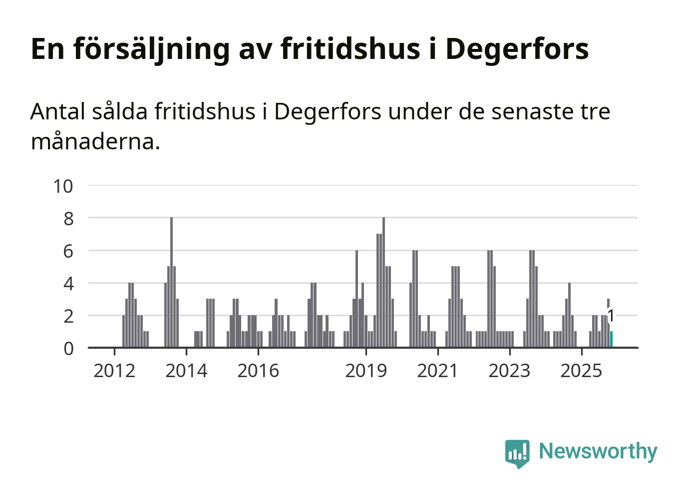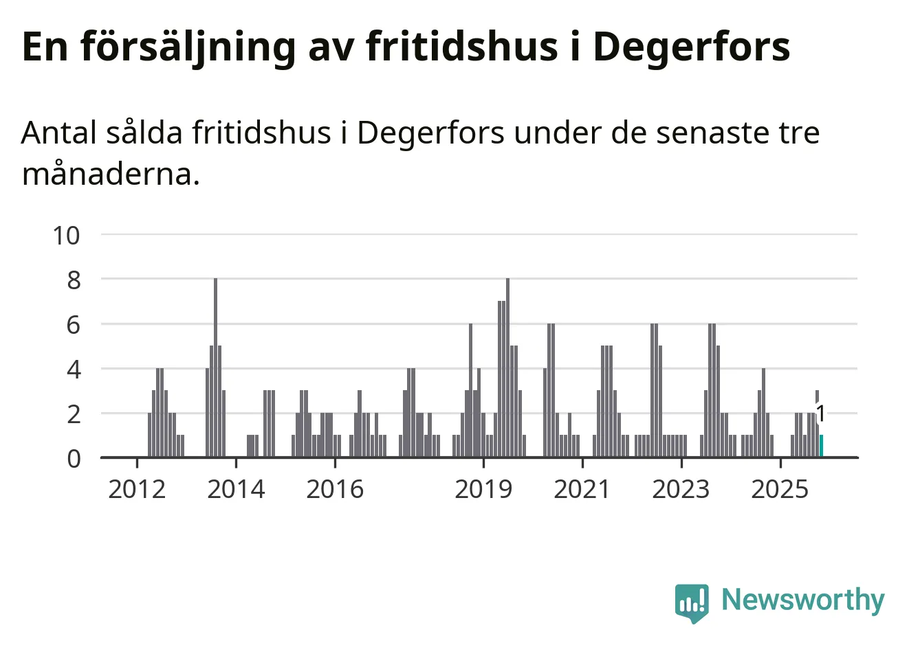 Mellan september och november gjordes sammanlagt en affär med fritidshus i Degerfors kommun. Det är lika många affärer som vid motsvarande tid i fjol.