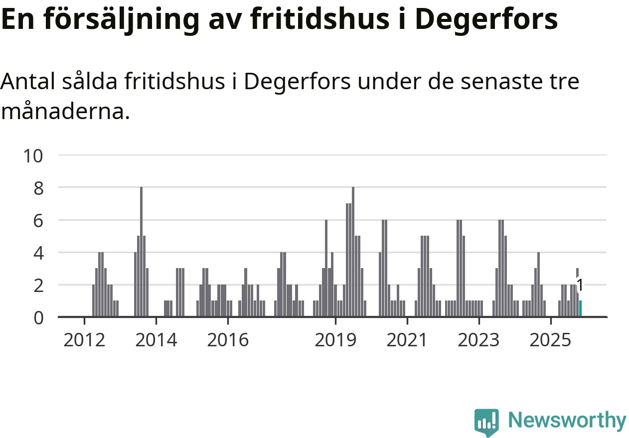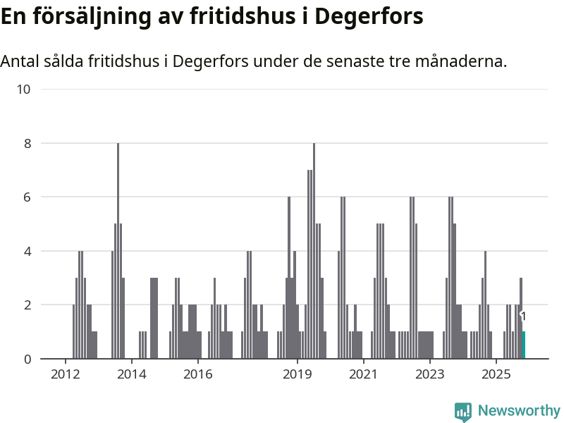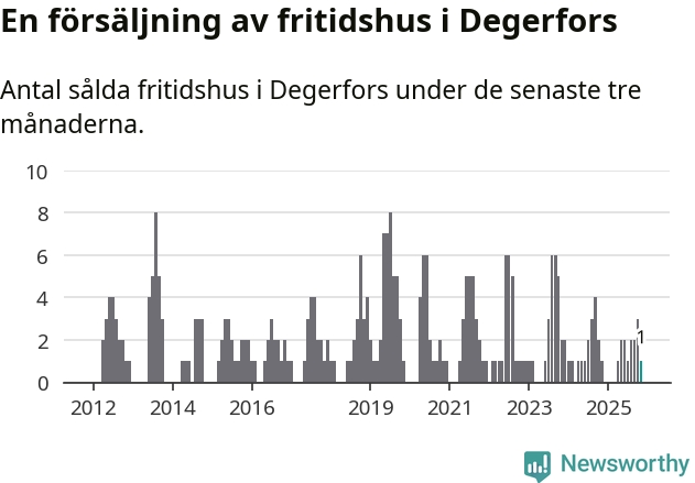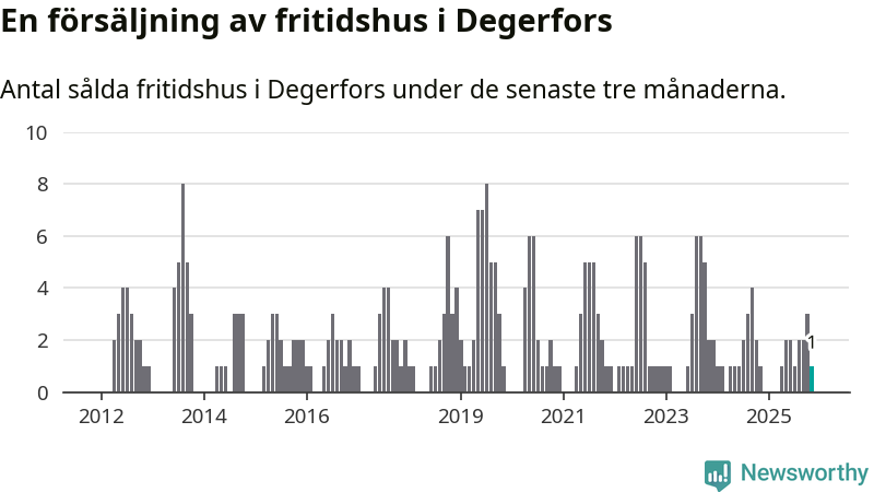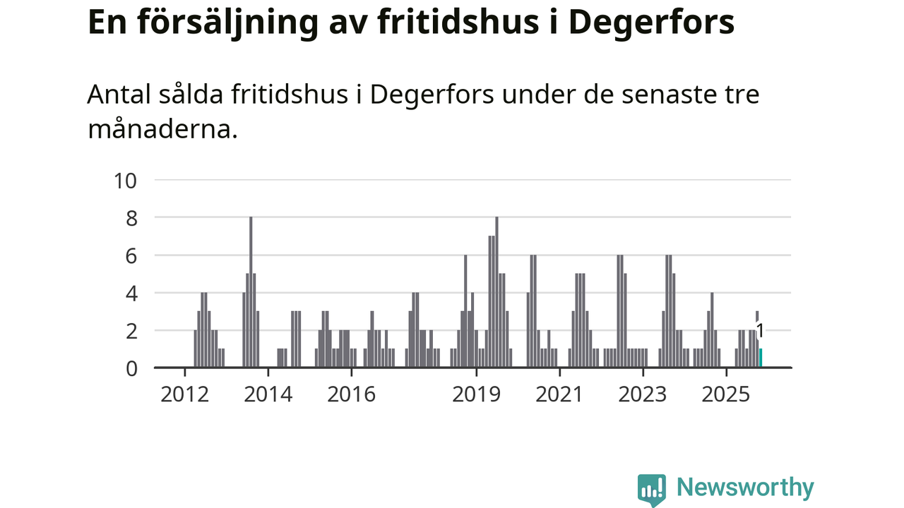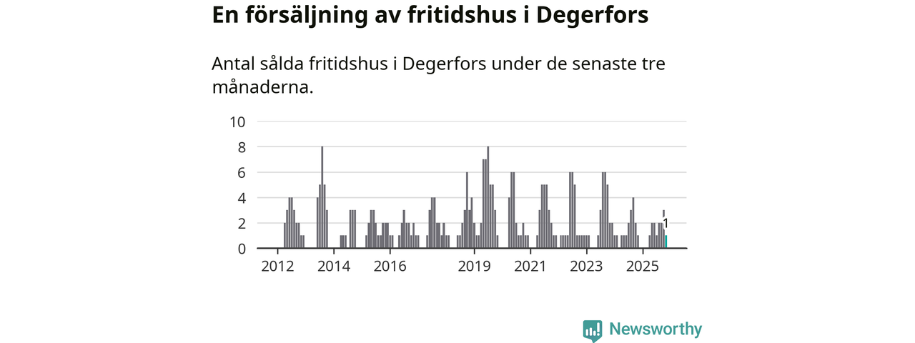 Mellan september och november gjordes sammanlagt en affär med fritidshus i Degerfors kommun. Det är lika många affärer som vid motsvarande tid i fjol.