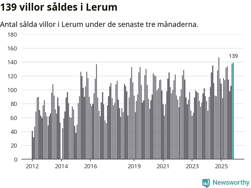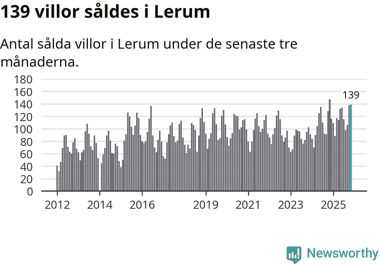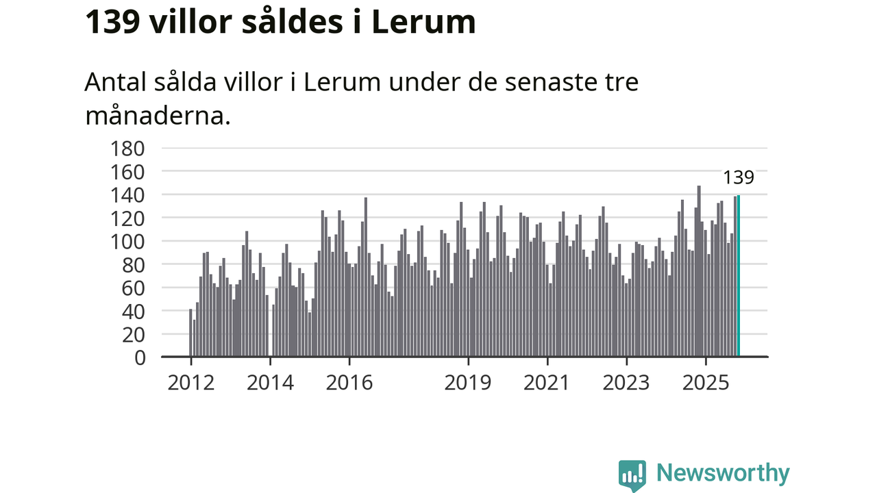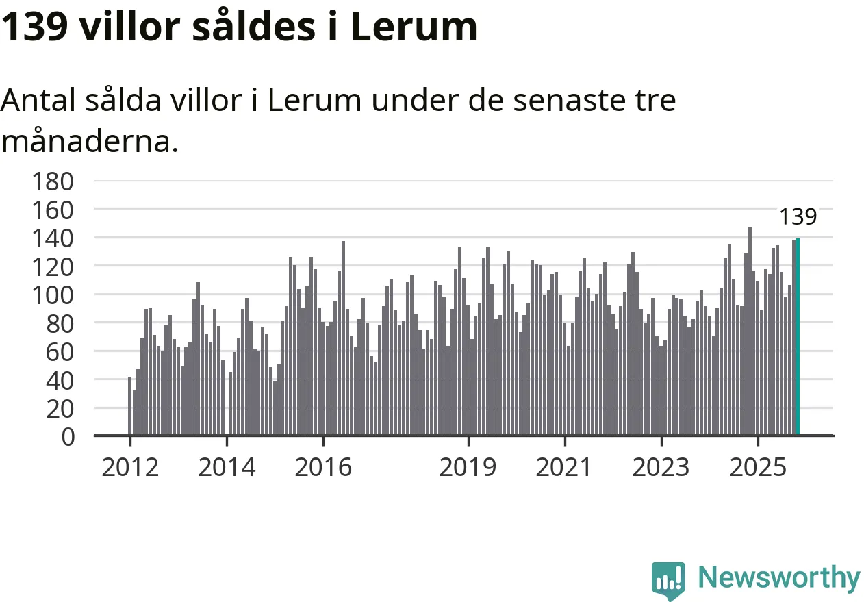 Sammanlagt såldes 139 villor i Lerums kommun mellan september och november till ett genomsnittligt pris på 4,8 miljoner kronor. I fjol gjordes 147 affärer vid den här tiden på året.