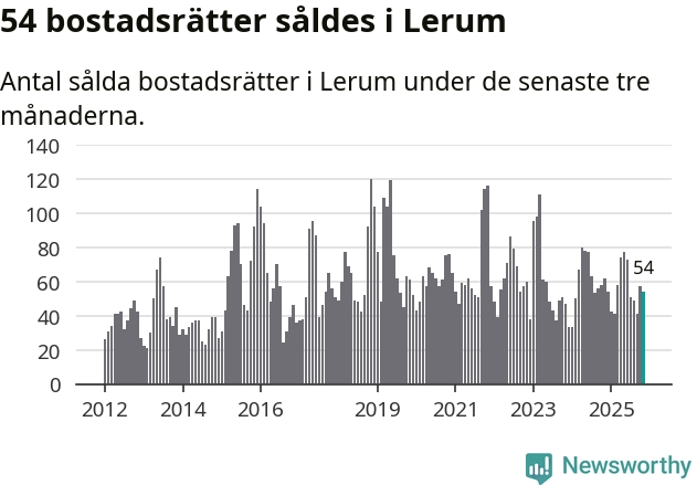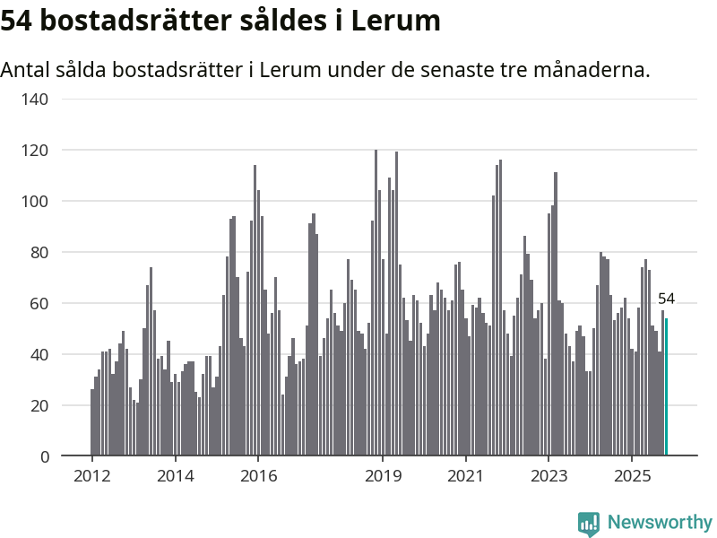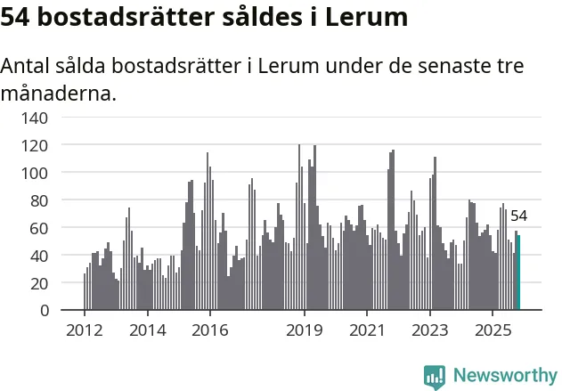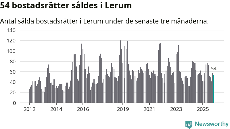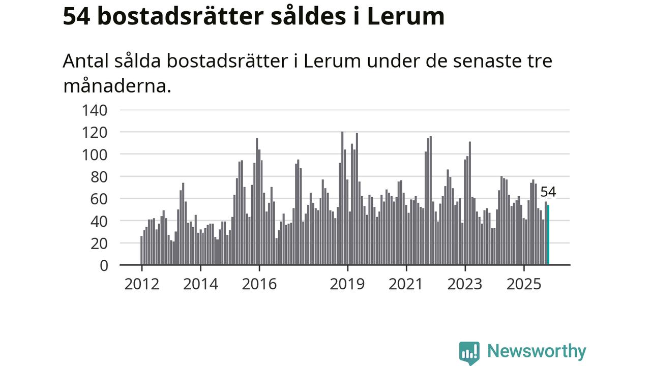 Sammanlagt såldes 54 bostadsrätter i Lerums kommun mellan september och november till ett genomsnittligt pris på 2,3 miljoner kronor. I fjol gjordes 62 affärer vid den här tiden på året.