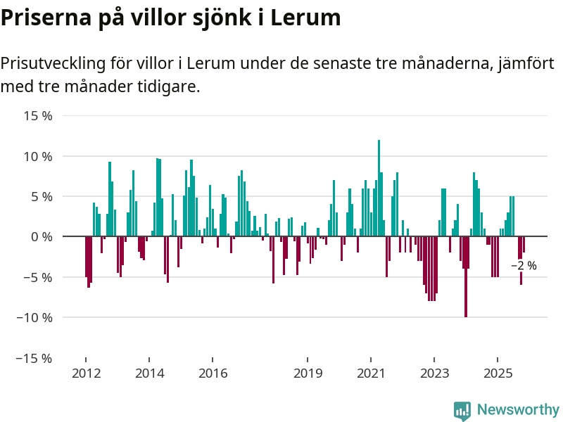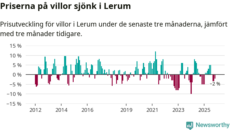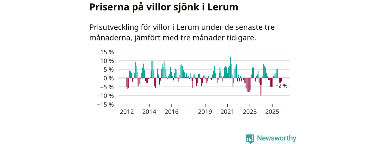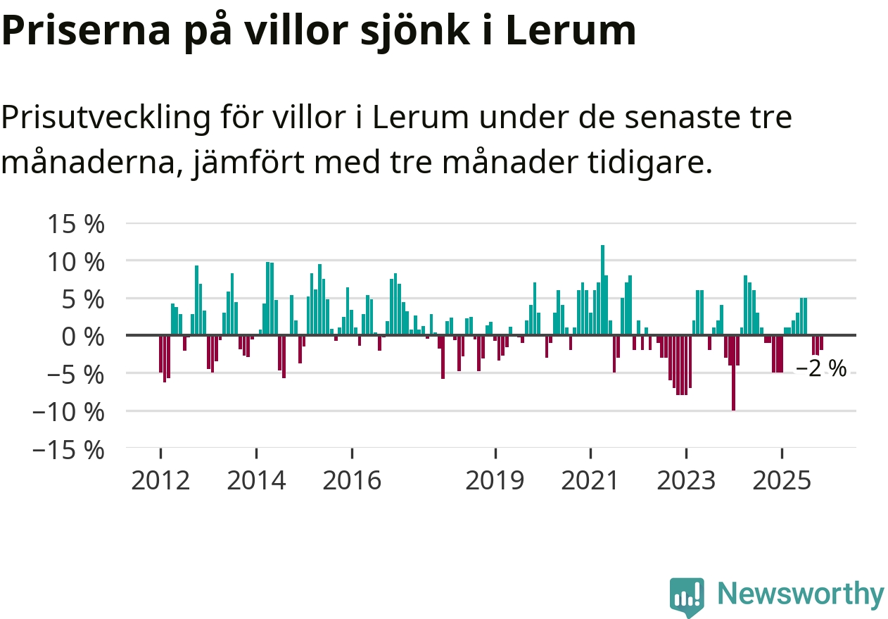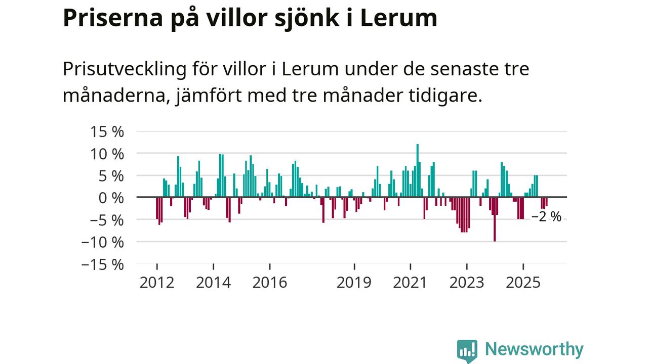 Villapriserna har gått ner i Lerums kommun. Medelpriset på försäljningarna under de senaste tre månaderna visar på en nedgång med 2 procent.