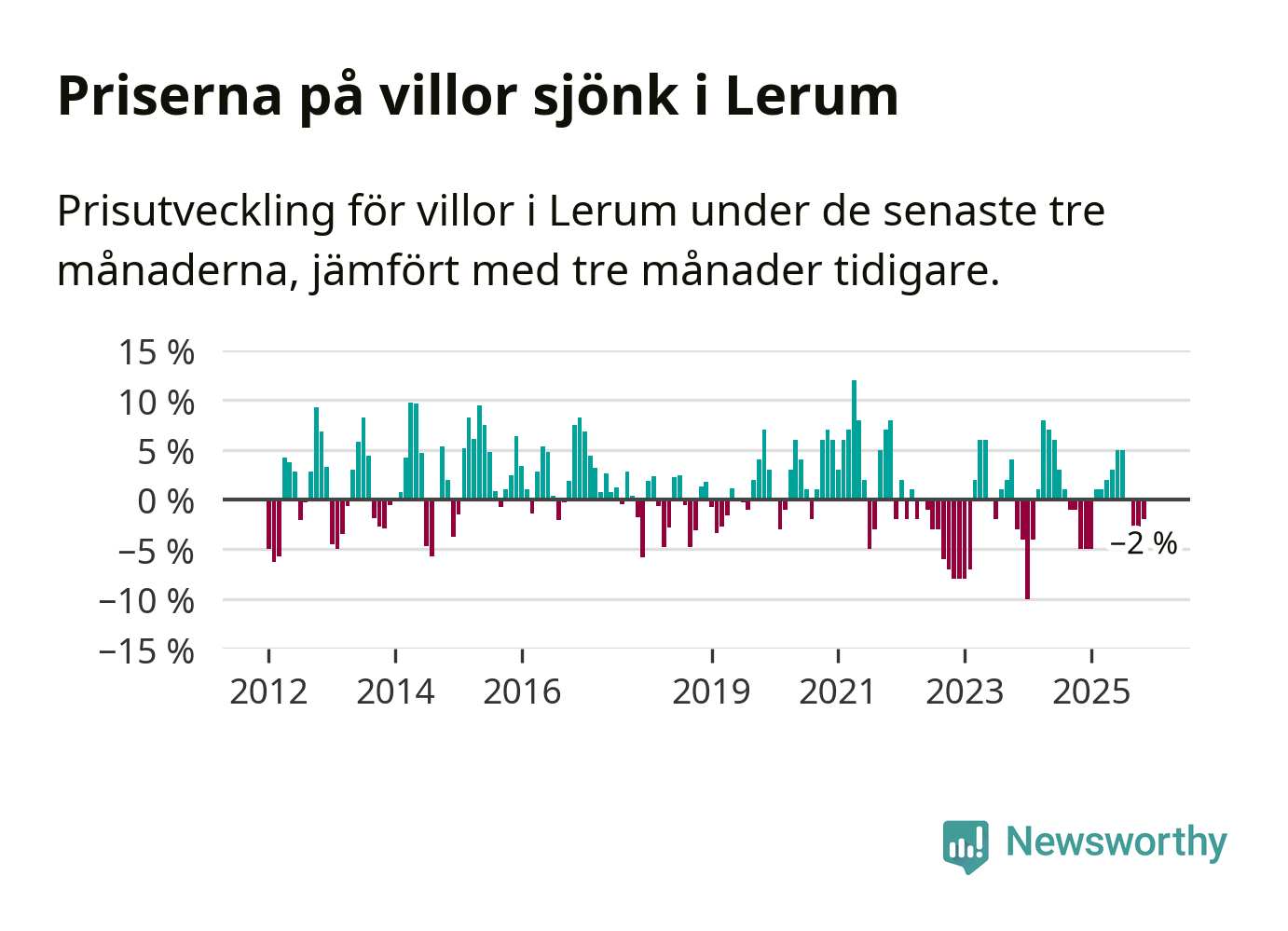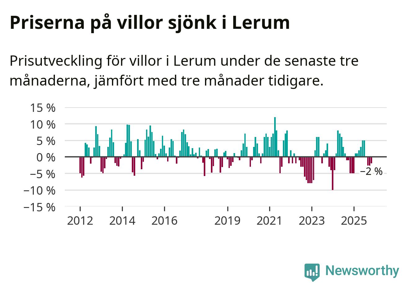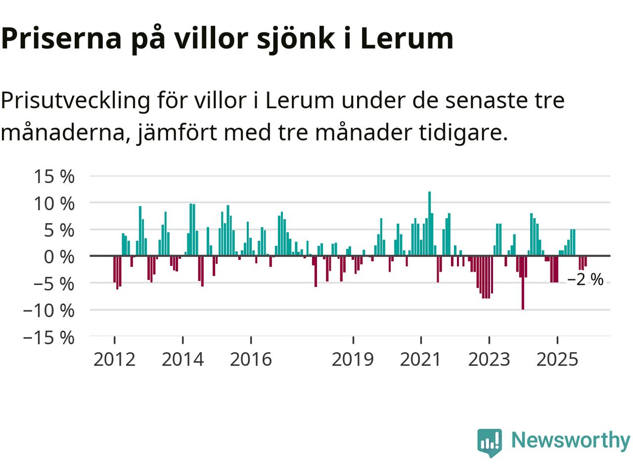Villapriserna har gått ner i Lerums kommun. Medelpriset på försäljningarna under de senaste tre månaderna visar på en nedgång med 2 procent.