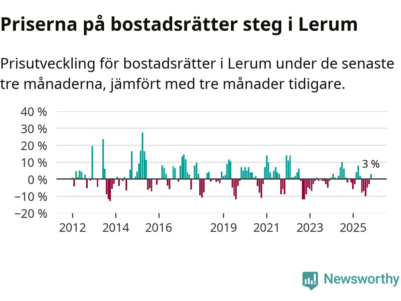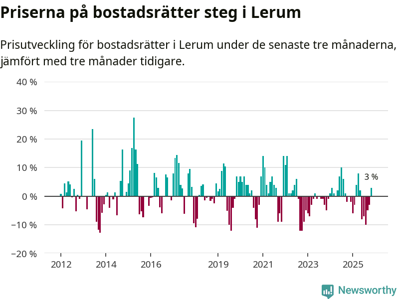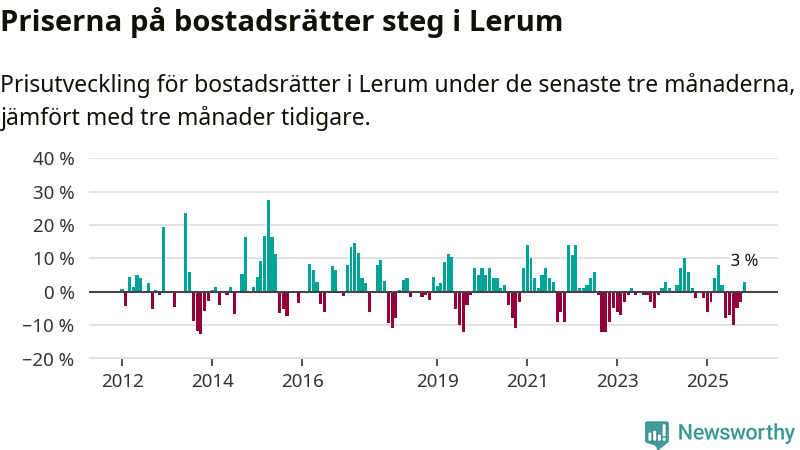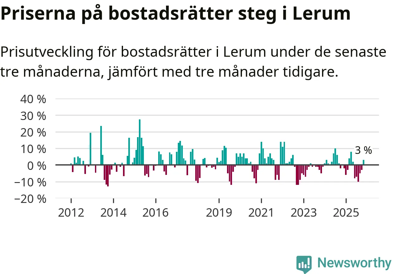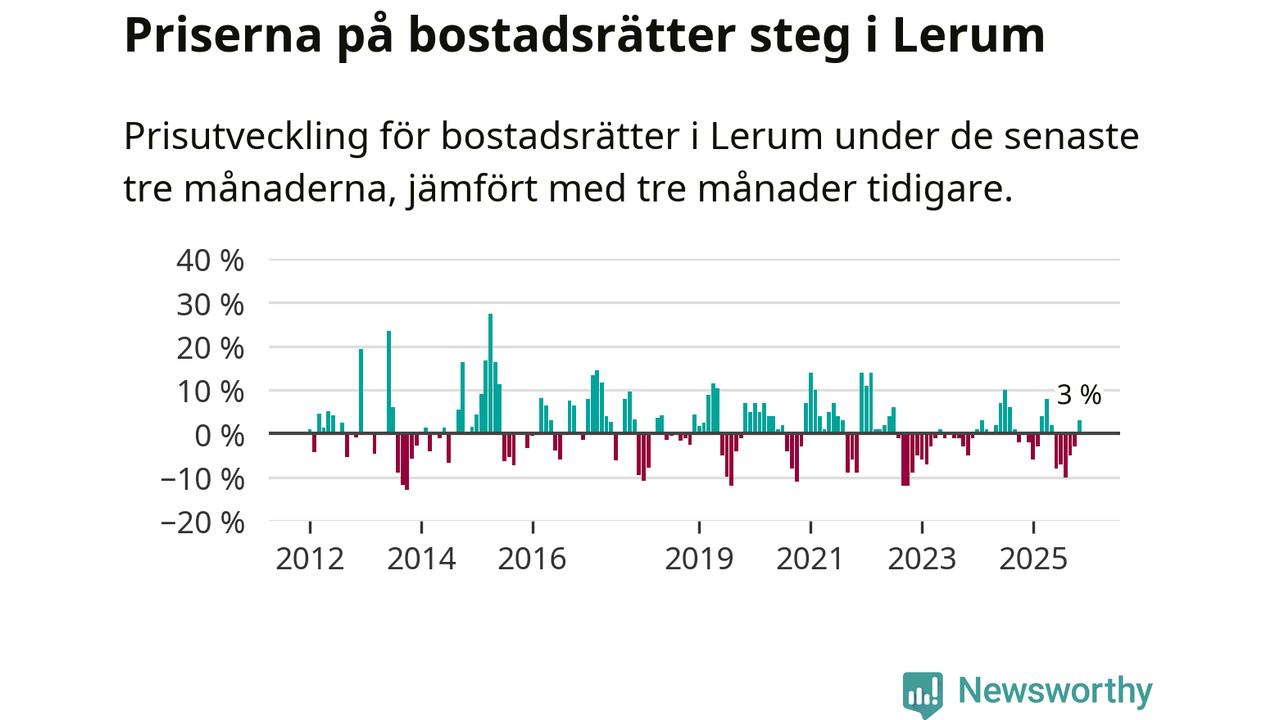 Priserna på bostadsrätter har gått upp i Lerums kommun. Medelpriset på försäljningarna under de senaste tre månaderna visar på en uppgång med 3 procent.