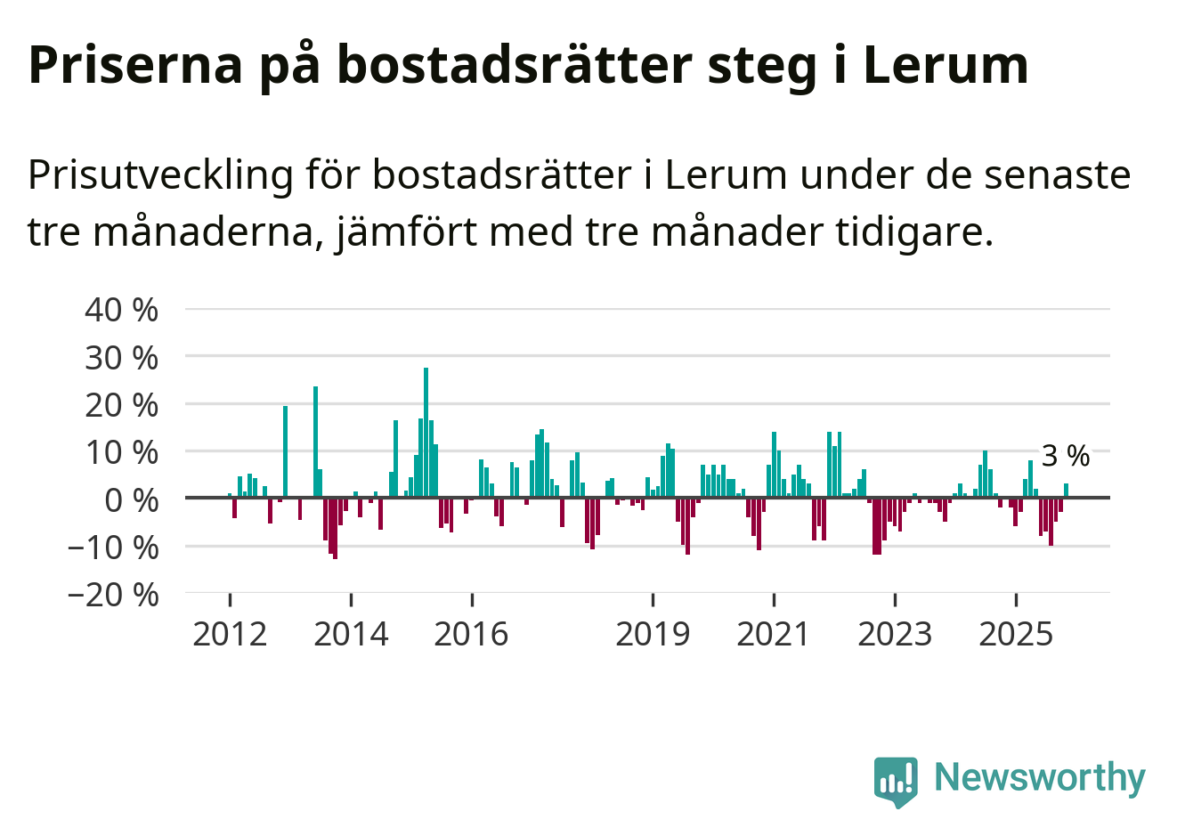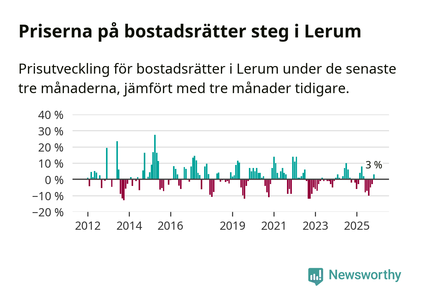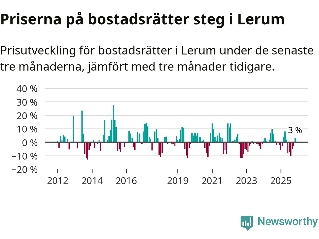 Priserna på bostadsrätter har gått upp i Lerums kommun. Medelpriset på försäljningarna under de senaste tre månaderna visar på en uppgång med 3 procent.