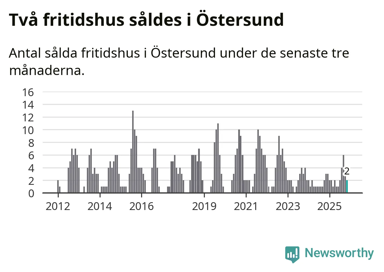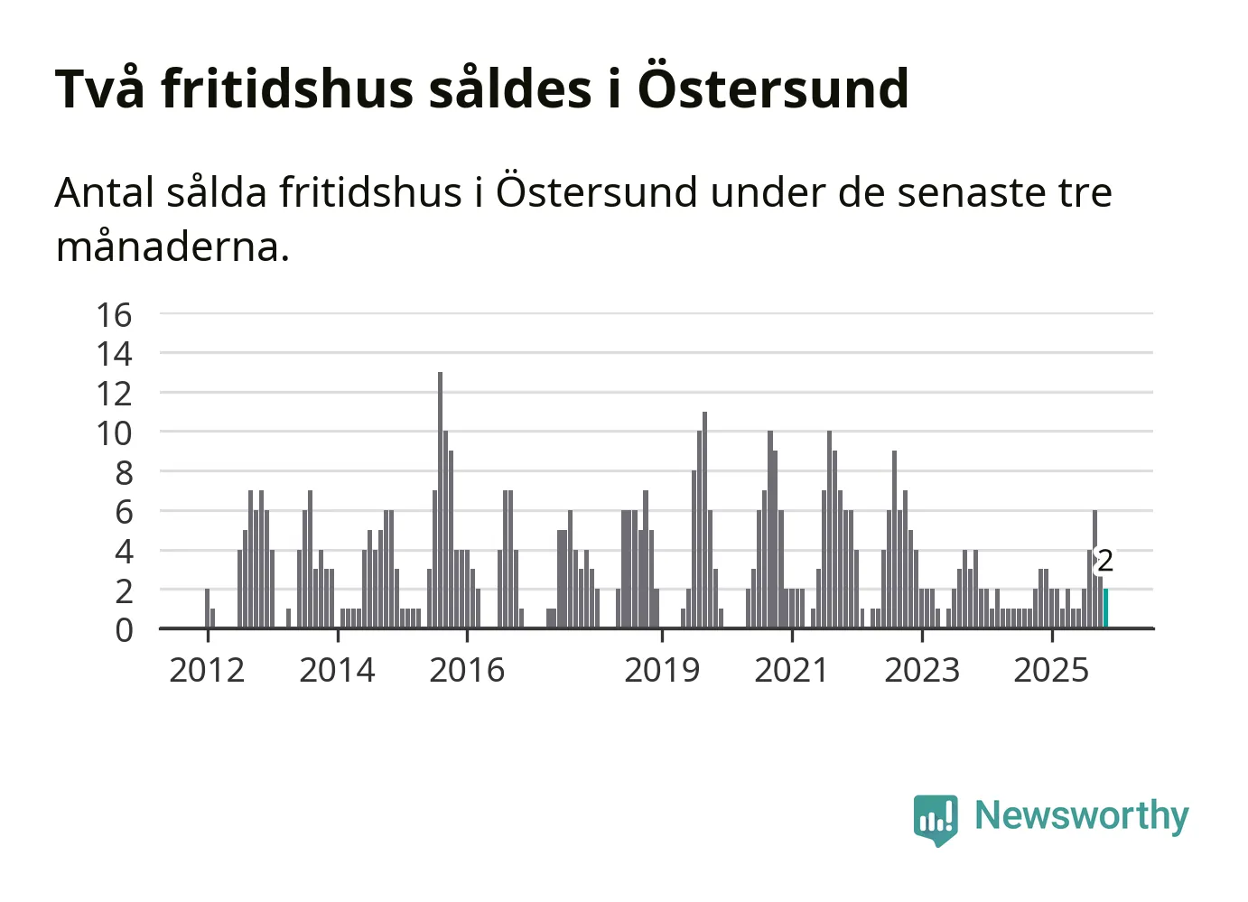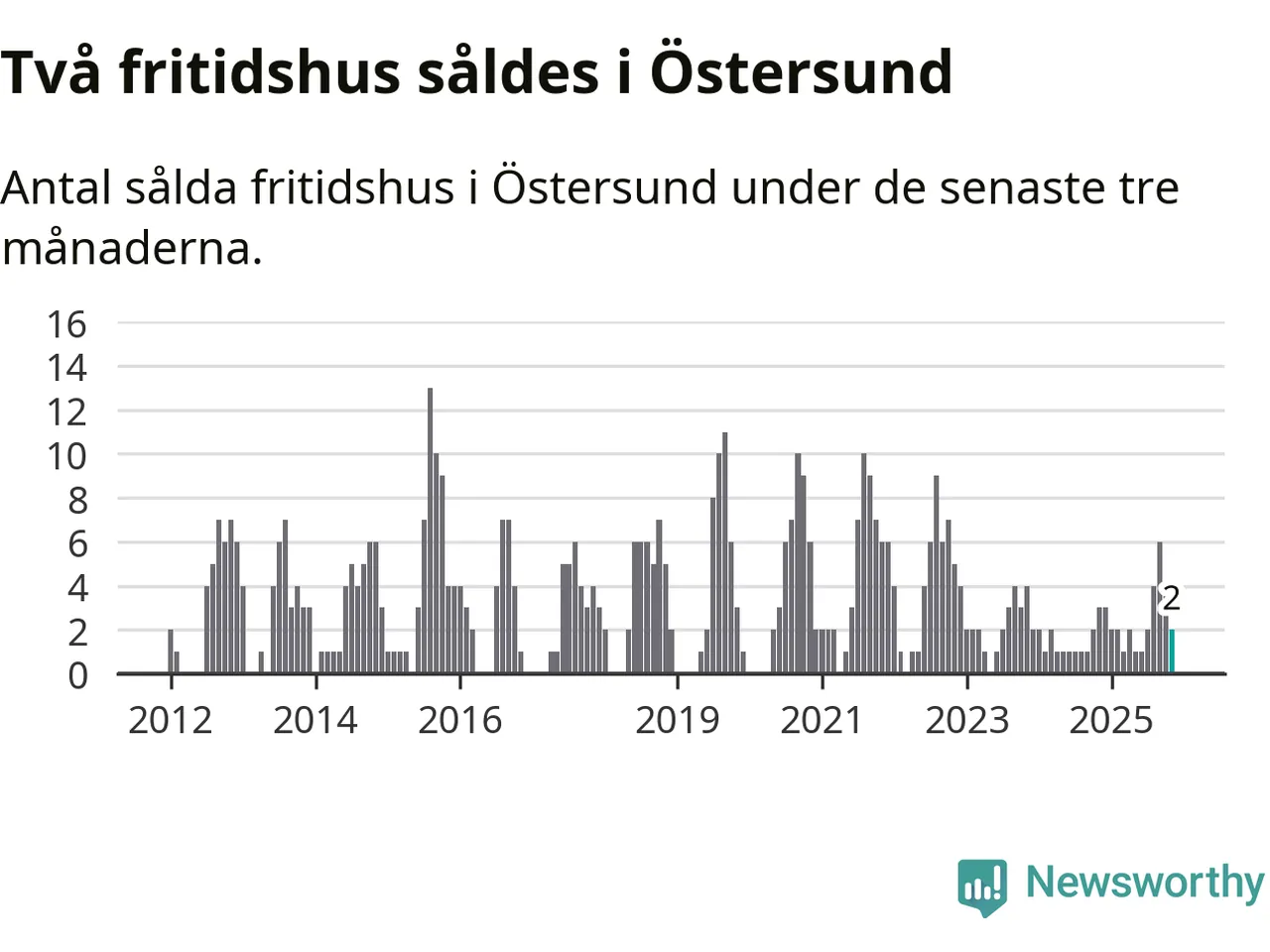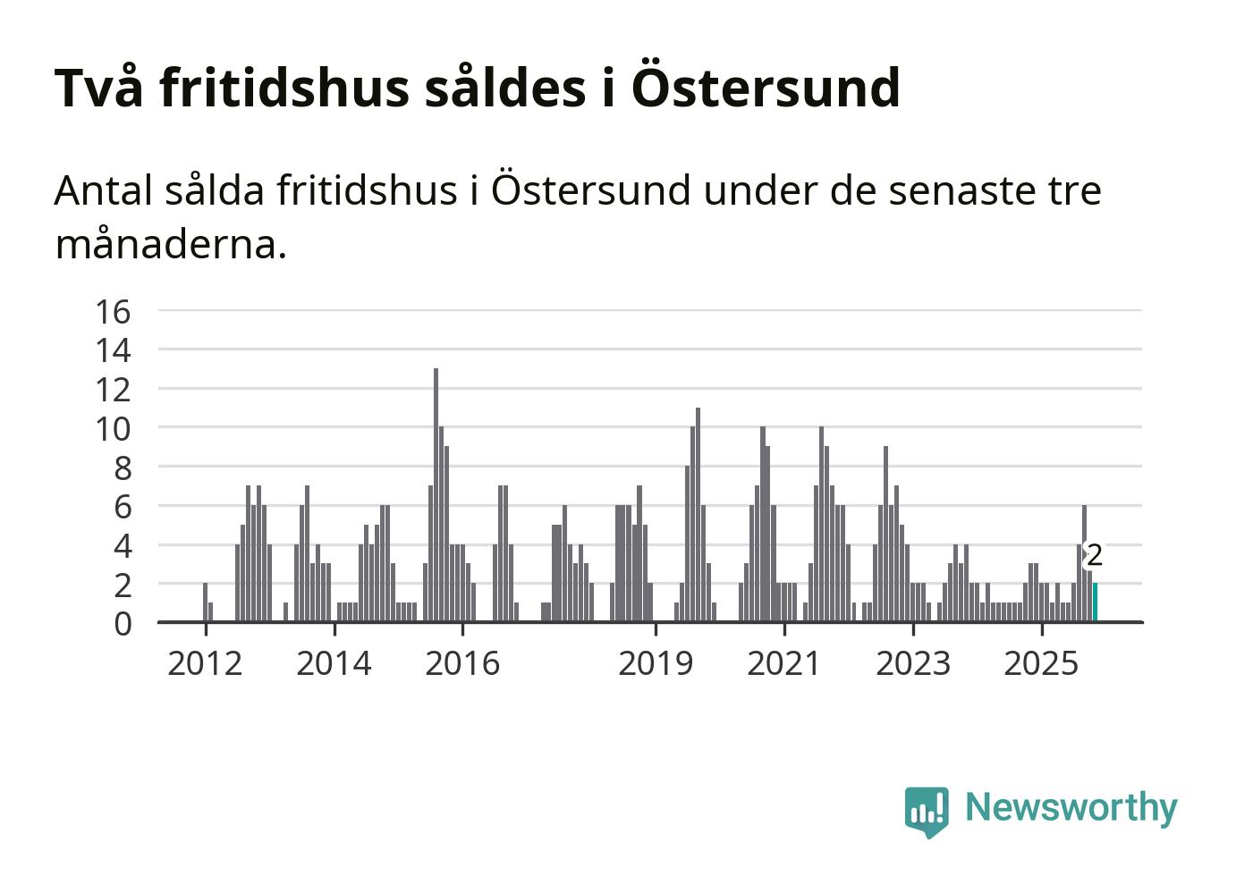 Mellan september och november gjordes sammanlagt två affärer med fritidshus i Östersunds kommun. Det kan jämföras med tre vid motsvarande tid i fjol.