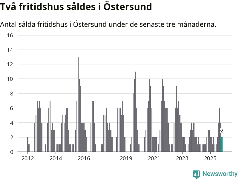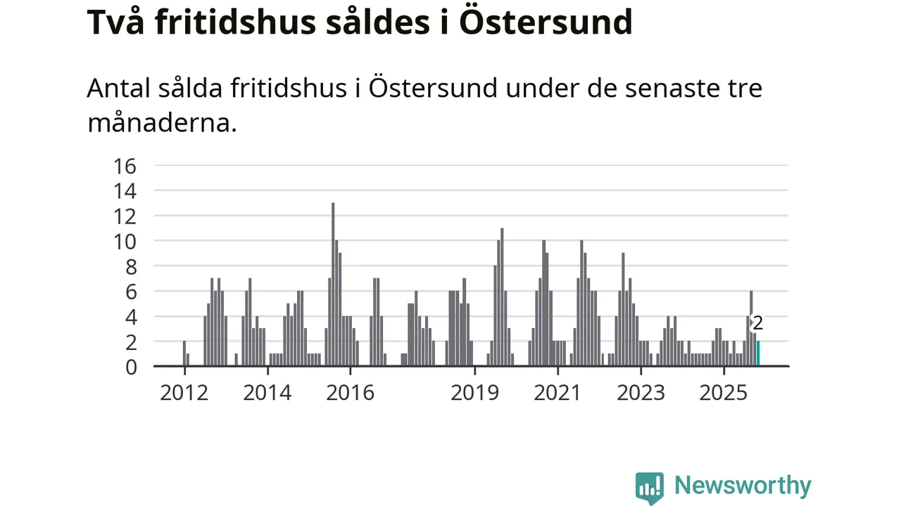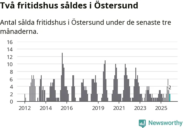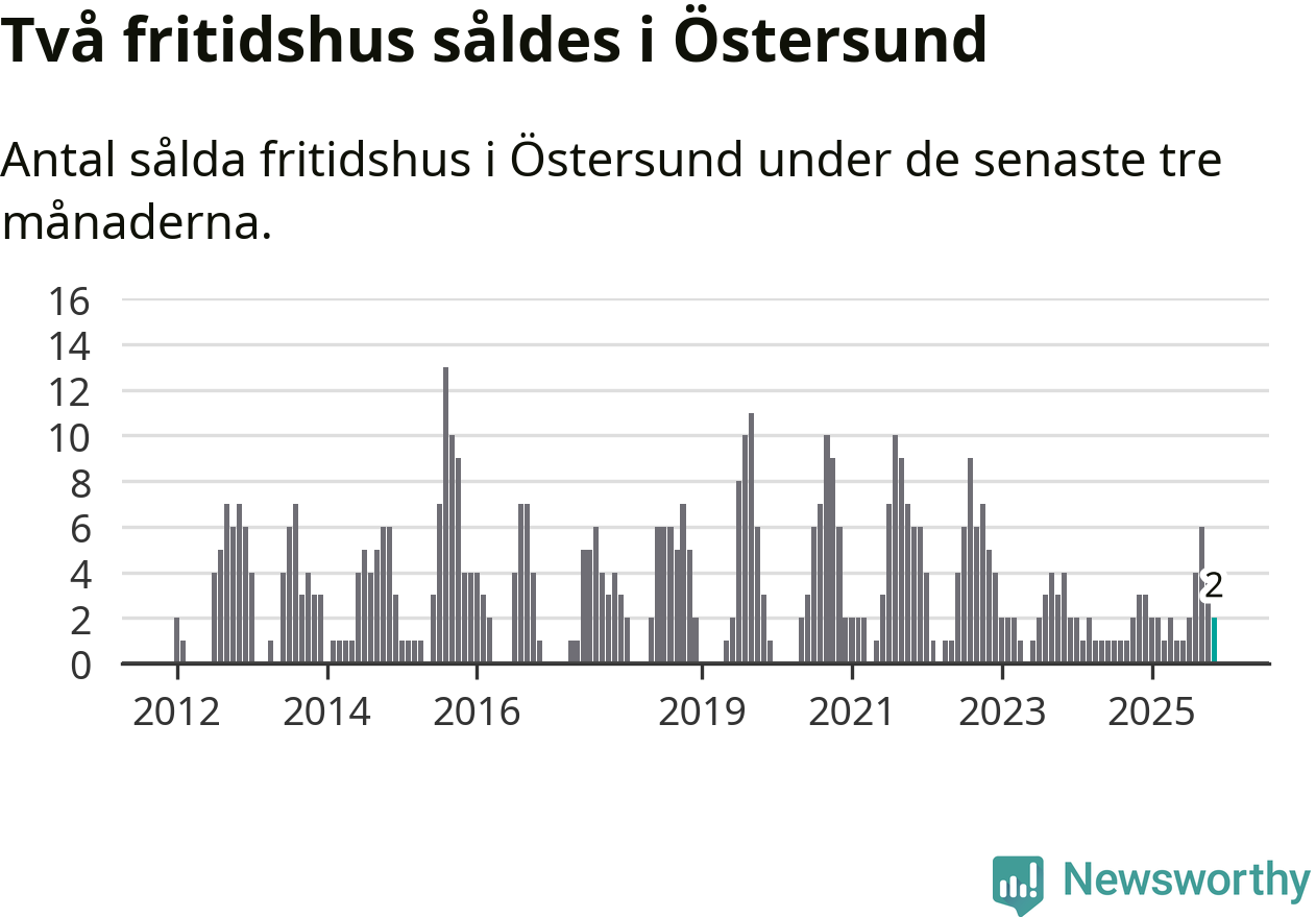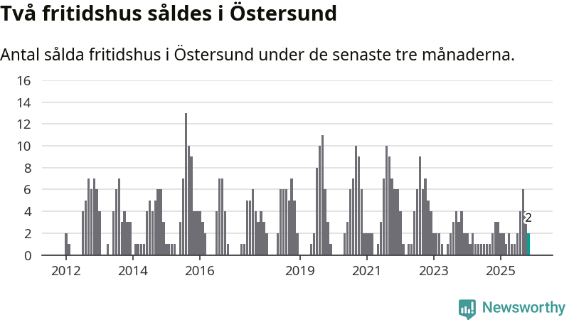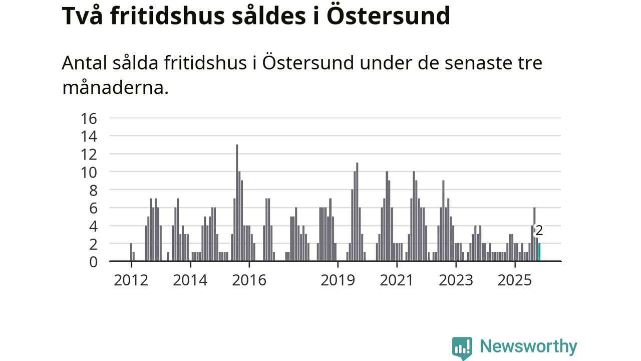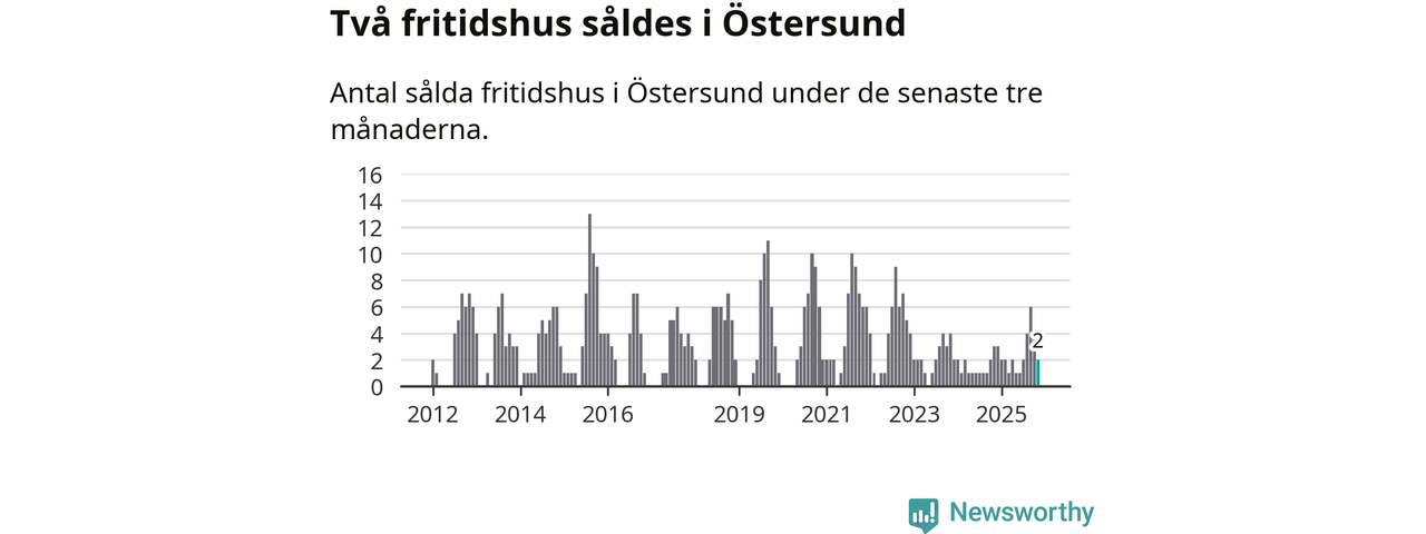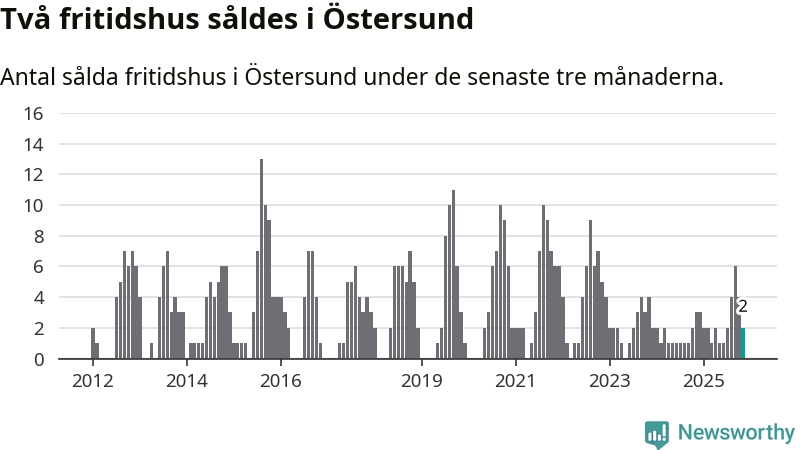 Mellan september och november gjordes sammanlagt två affärer med fritidshus i Östersunds kommun. Det kan jämföras med tre vid motsvarande tid i fjol.