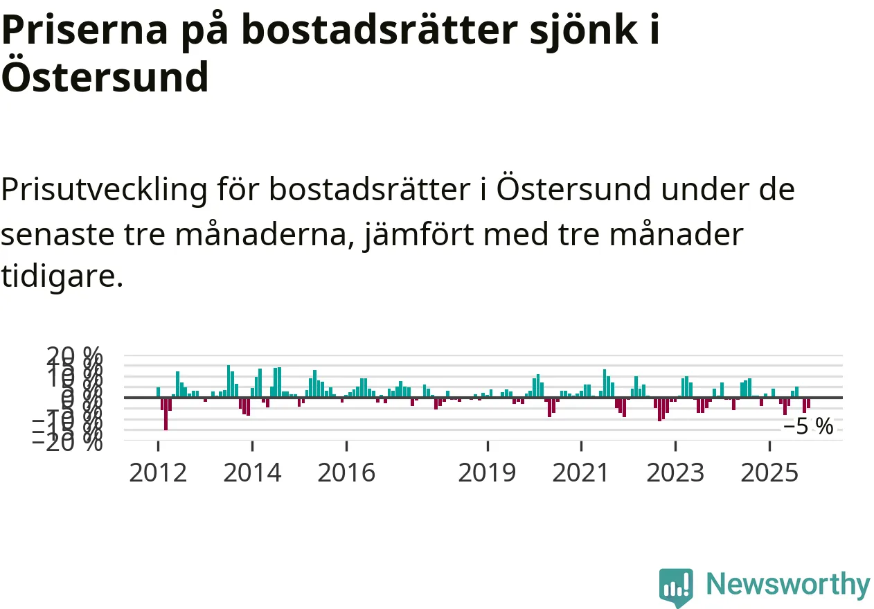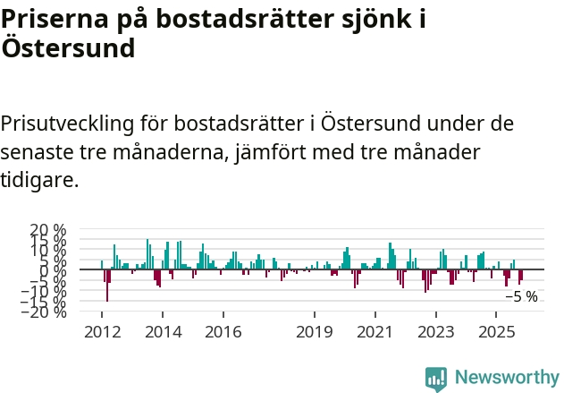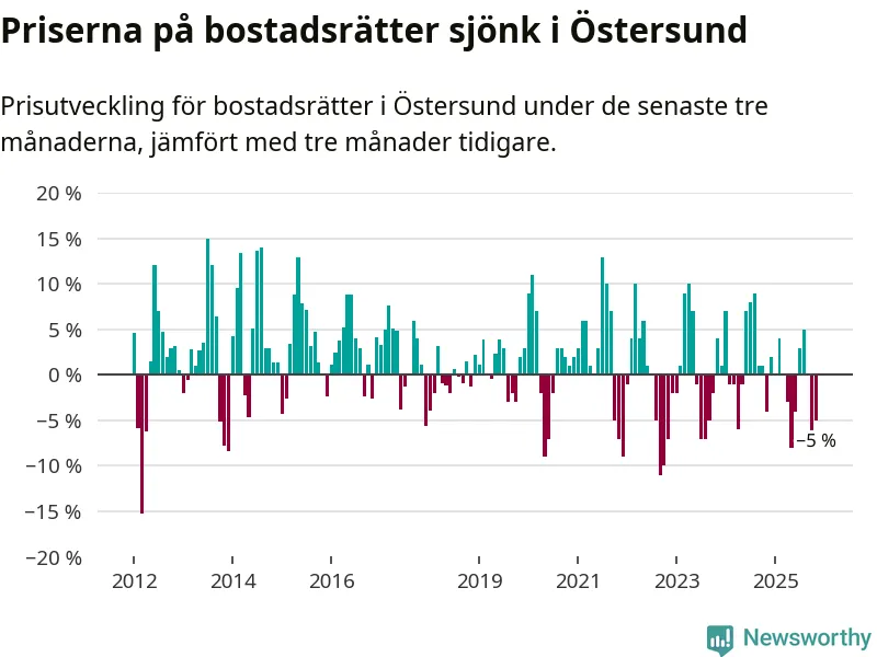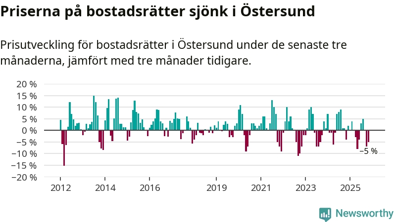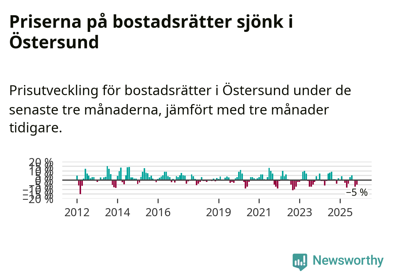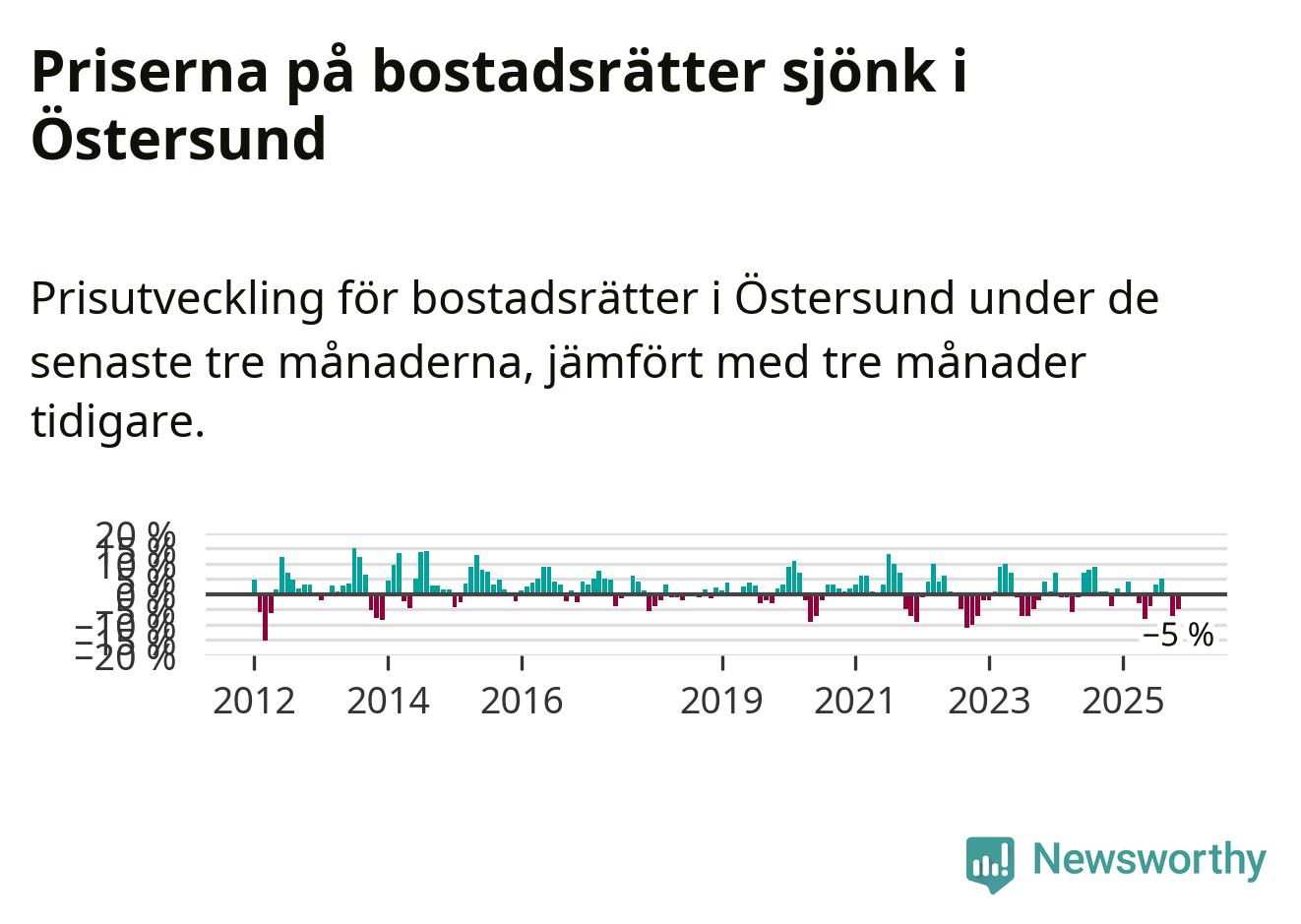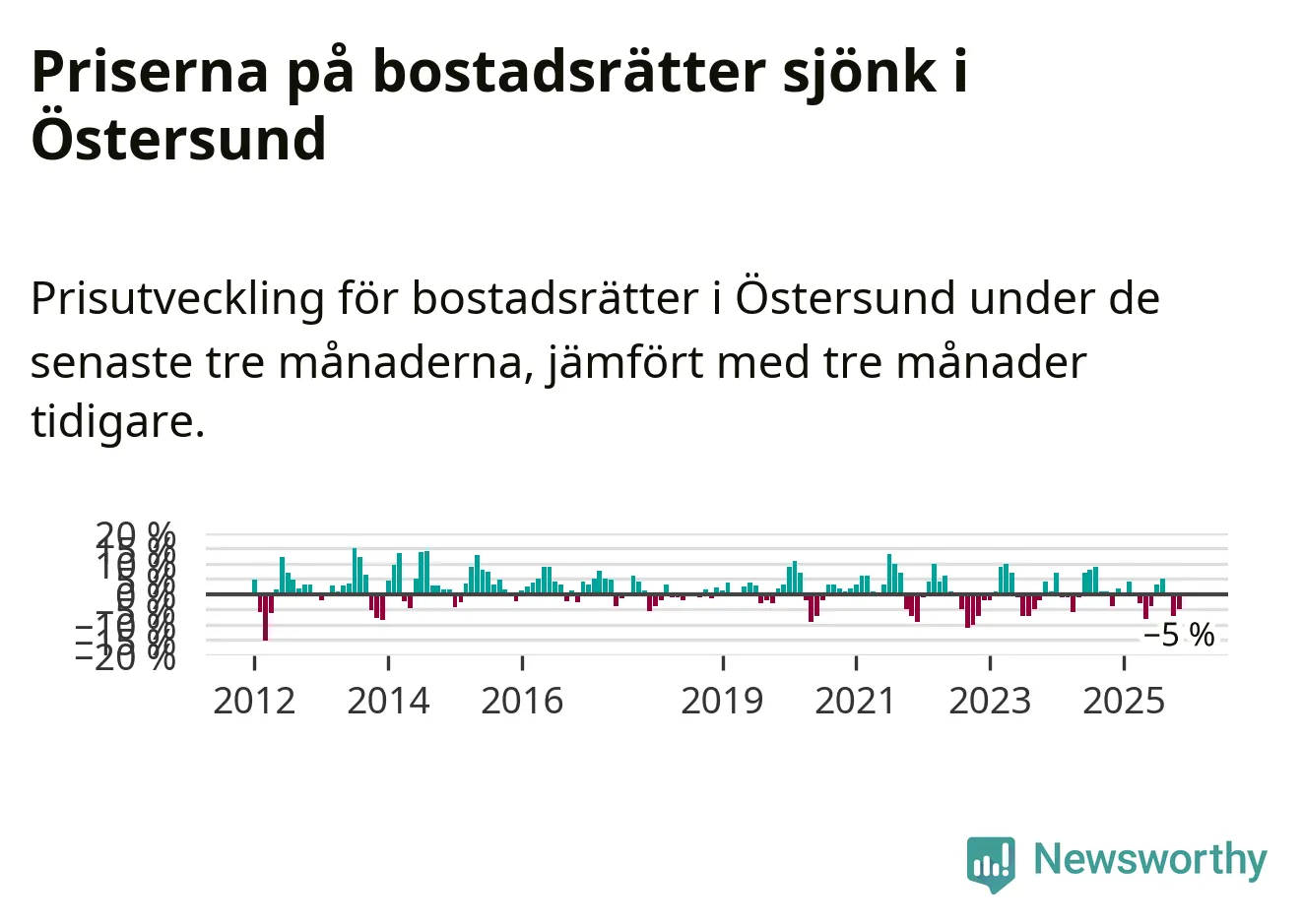 Statistiken visar även på en kännbar prisnedgång i Östersunds kommun. Medelpriset på försäljningarna av bostadsrätter i kommunen var 5 procent lägre än för tre månader sedan. I hela Jämtland däremot ökar priserna på bostadsrätter. I hela länet noterades en prisuppgång på 4 procent.