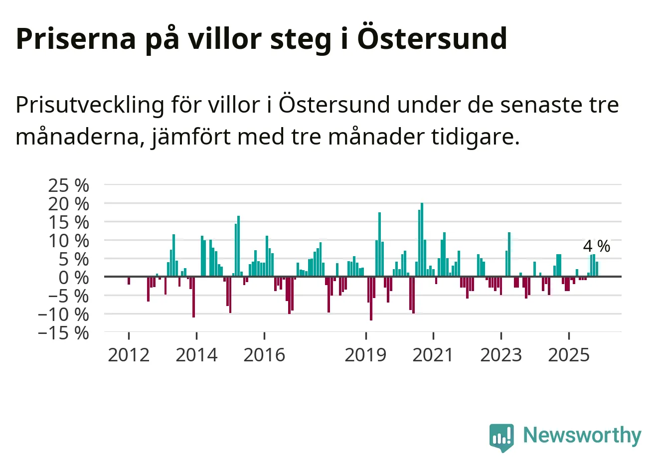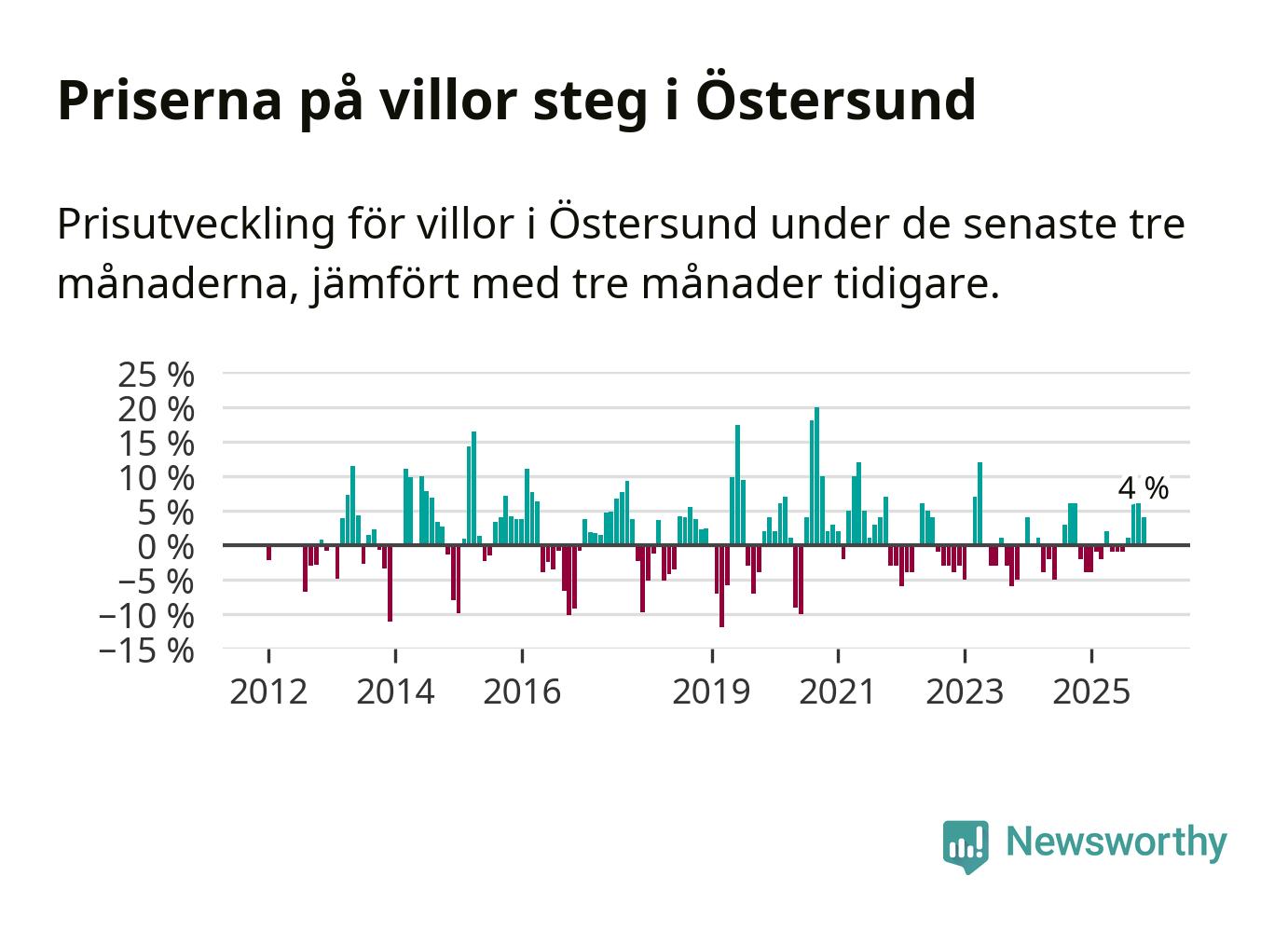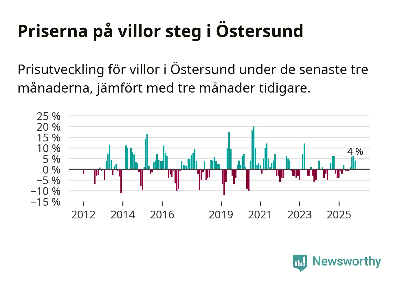 Statistiken visar även på en kännbar prisuppgång i Östersunds kommun. Medelpriset på försäljningarna av villor i kommunen var 4 procent högre än för tre månader sedan. I hela Jämtland däremot sjunker villapriserna. I hela länet noterades en prisnedgång på 3 procent.