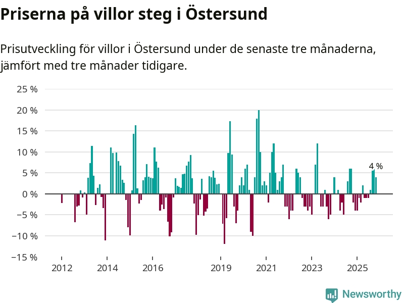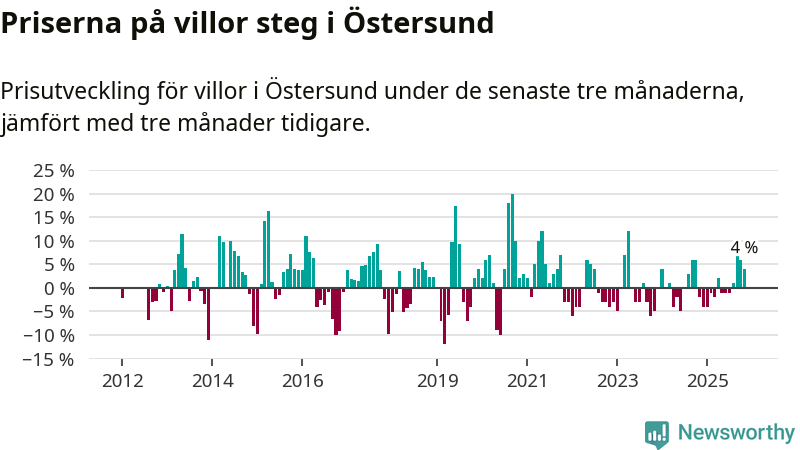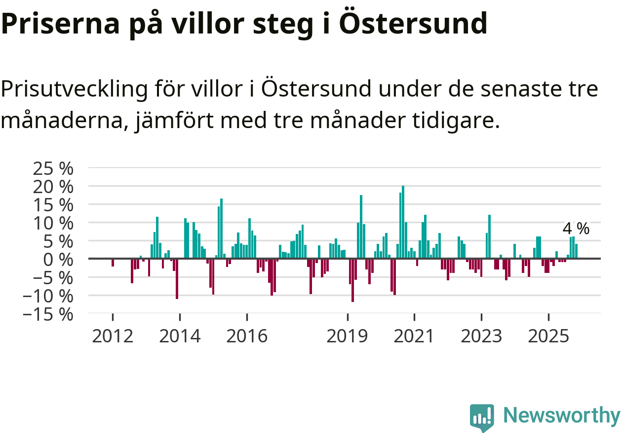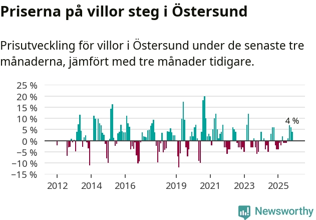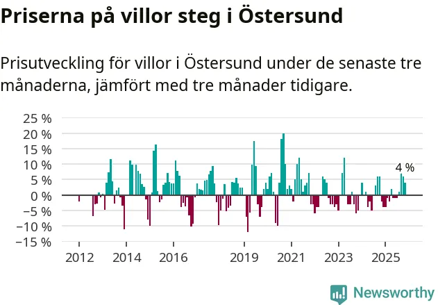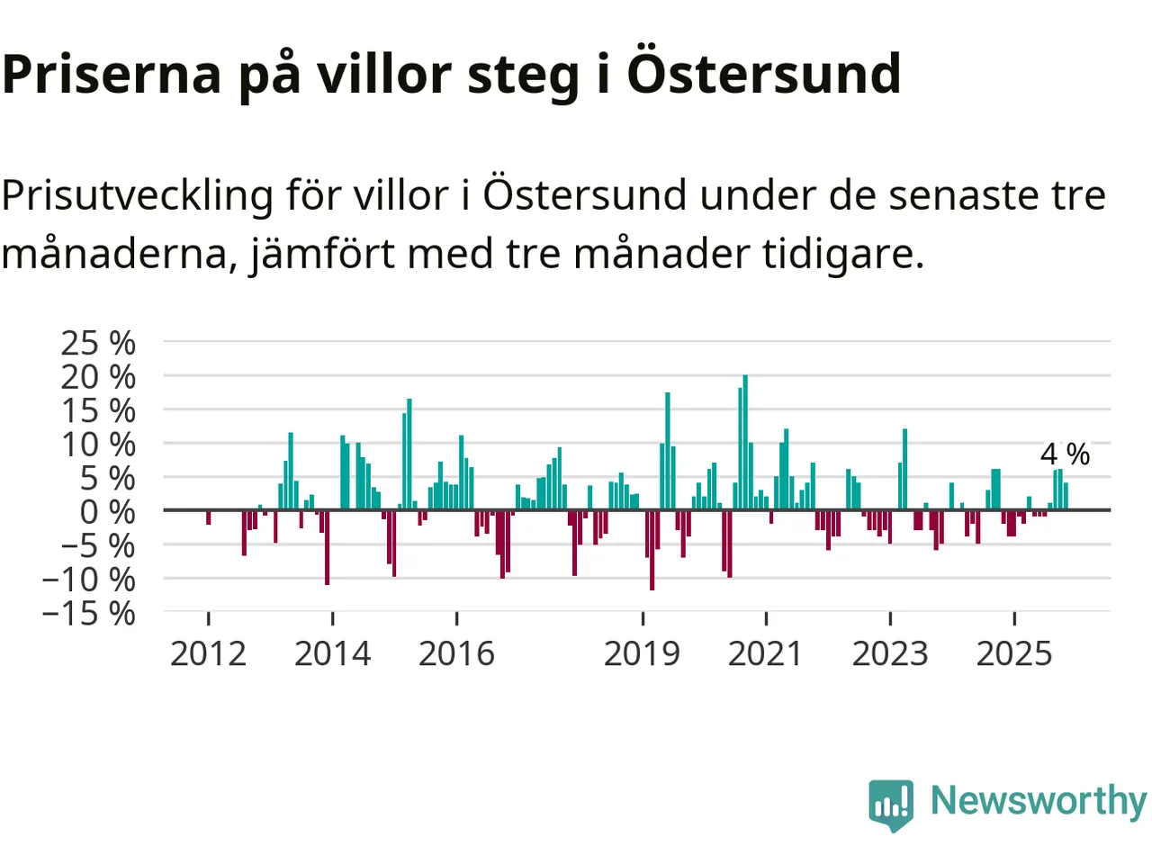 Statistiken visar även på en kännbar prisuppgång i Östersunds kommun. Medelpriset på försäljningarna av villor i kommunen var 4 procent högre än för tre månader sedan. I hela Jämtland däremot sjunker villapriserna. I hela länet noterades en prisnedgång på 3 procent.