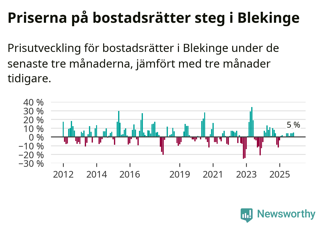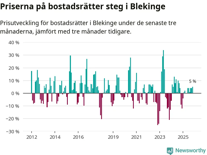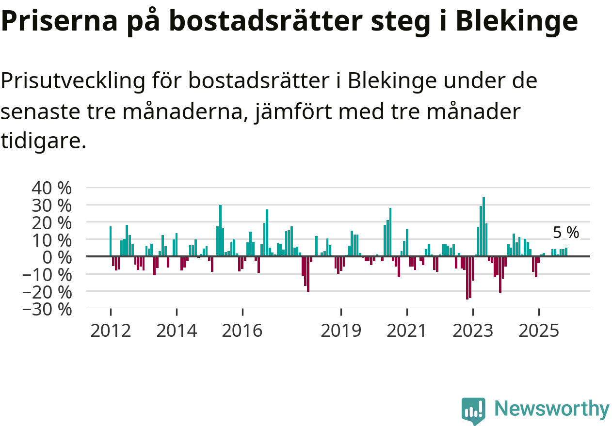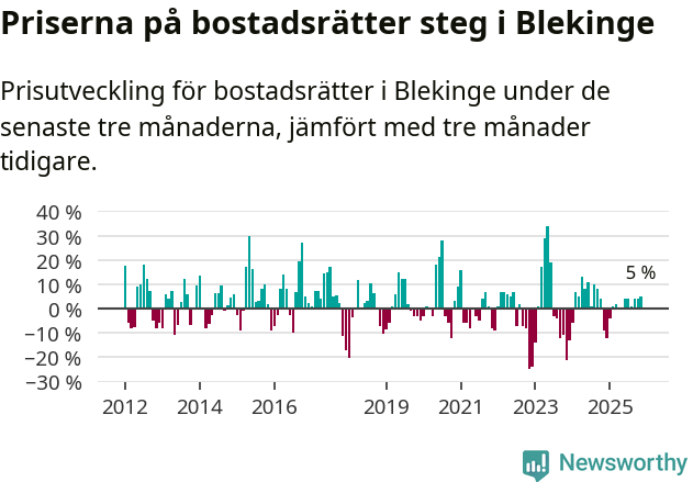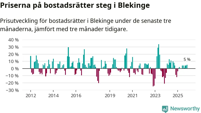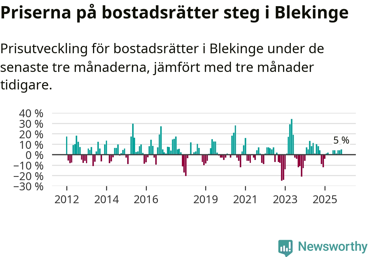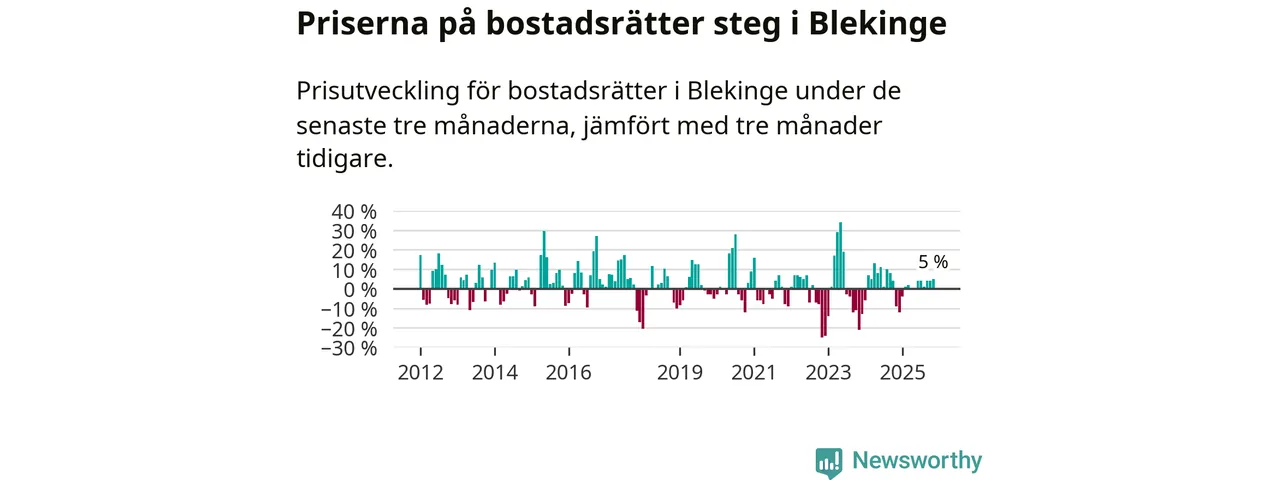 Priserna på bostadsrätter har gått upp i Blekinge län. Medelpriset på försäljningarna under de senaste tre månaderna visar på en uppgång med 5 procent.
