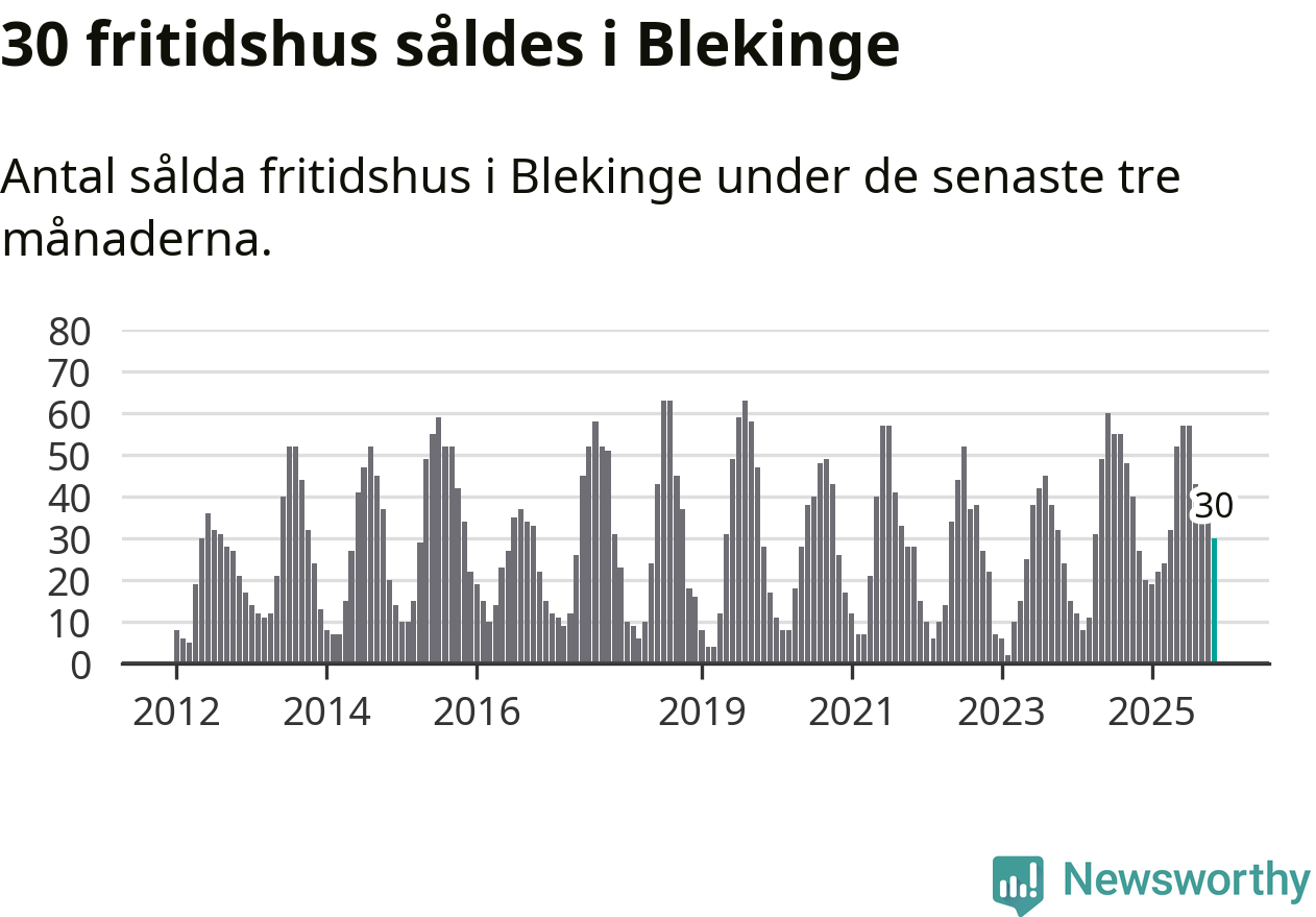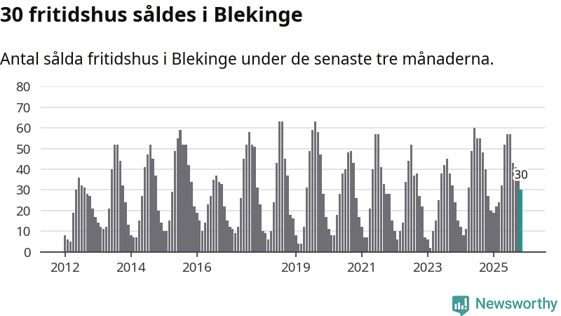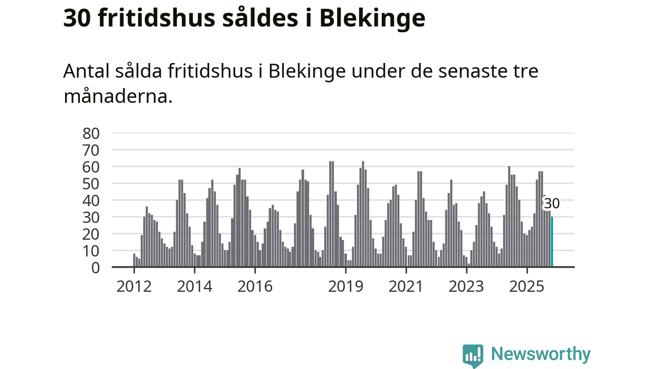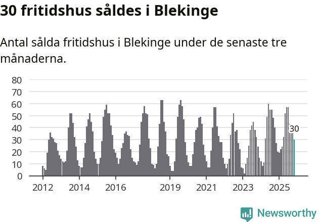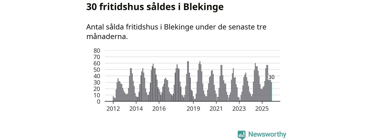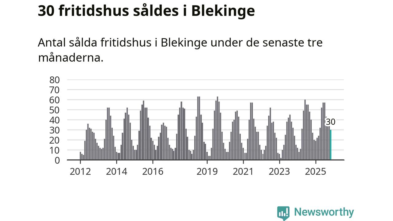 Sammanlagt såldes 30 fritidshus i Blekinge län mellan september och november till ett genomsnittligt pris på 2,0 miljoner kronor. I fjol gjordes 27 affärer vid den här tiden på året.
