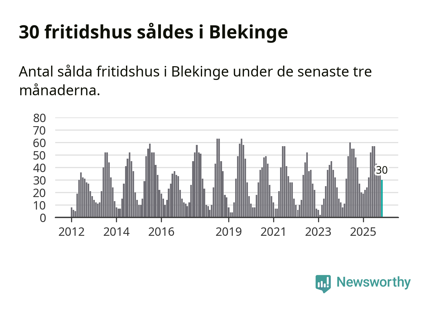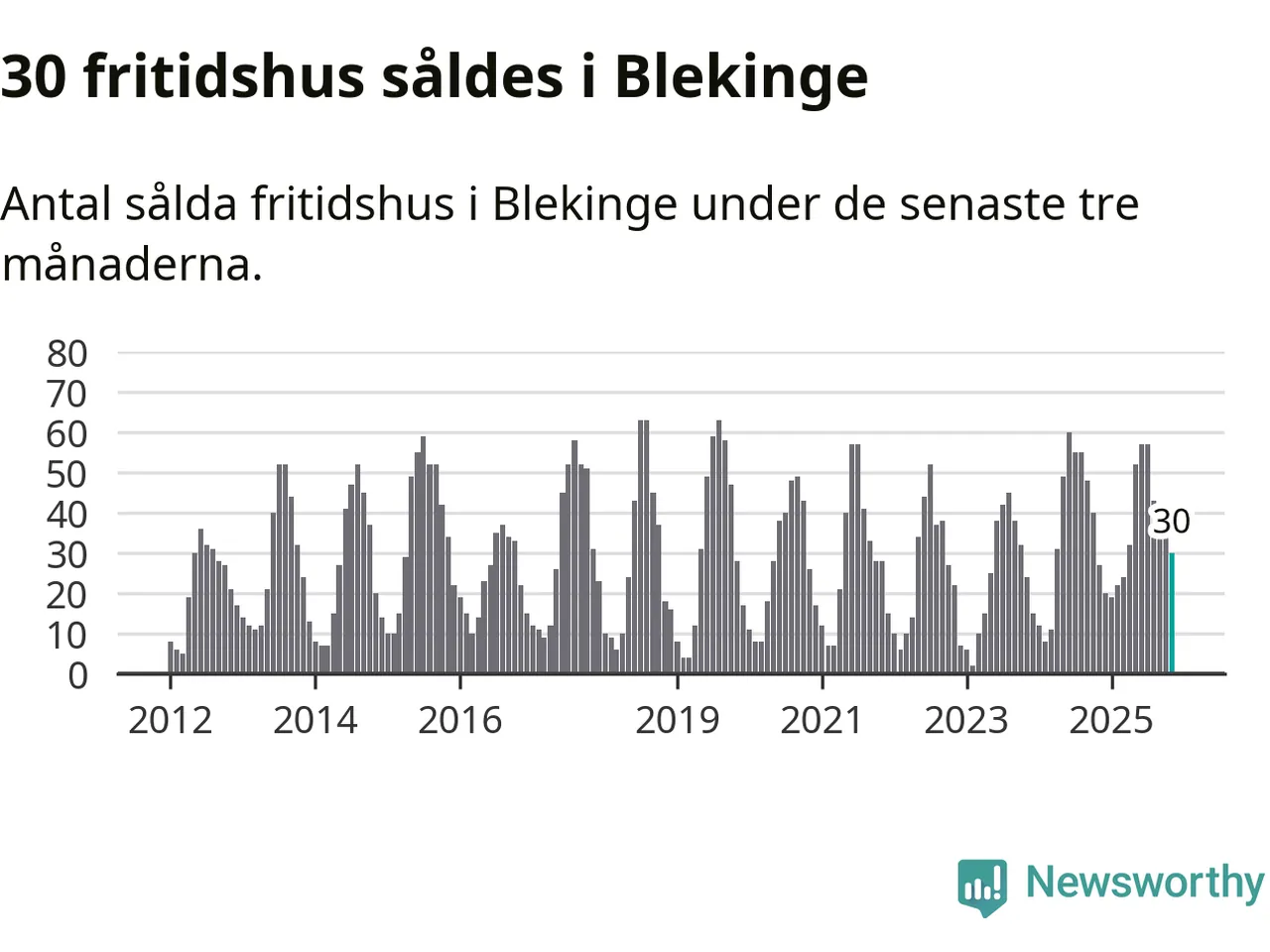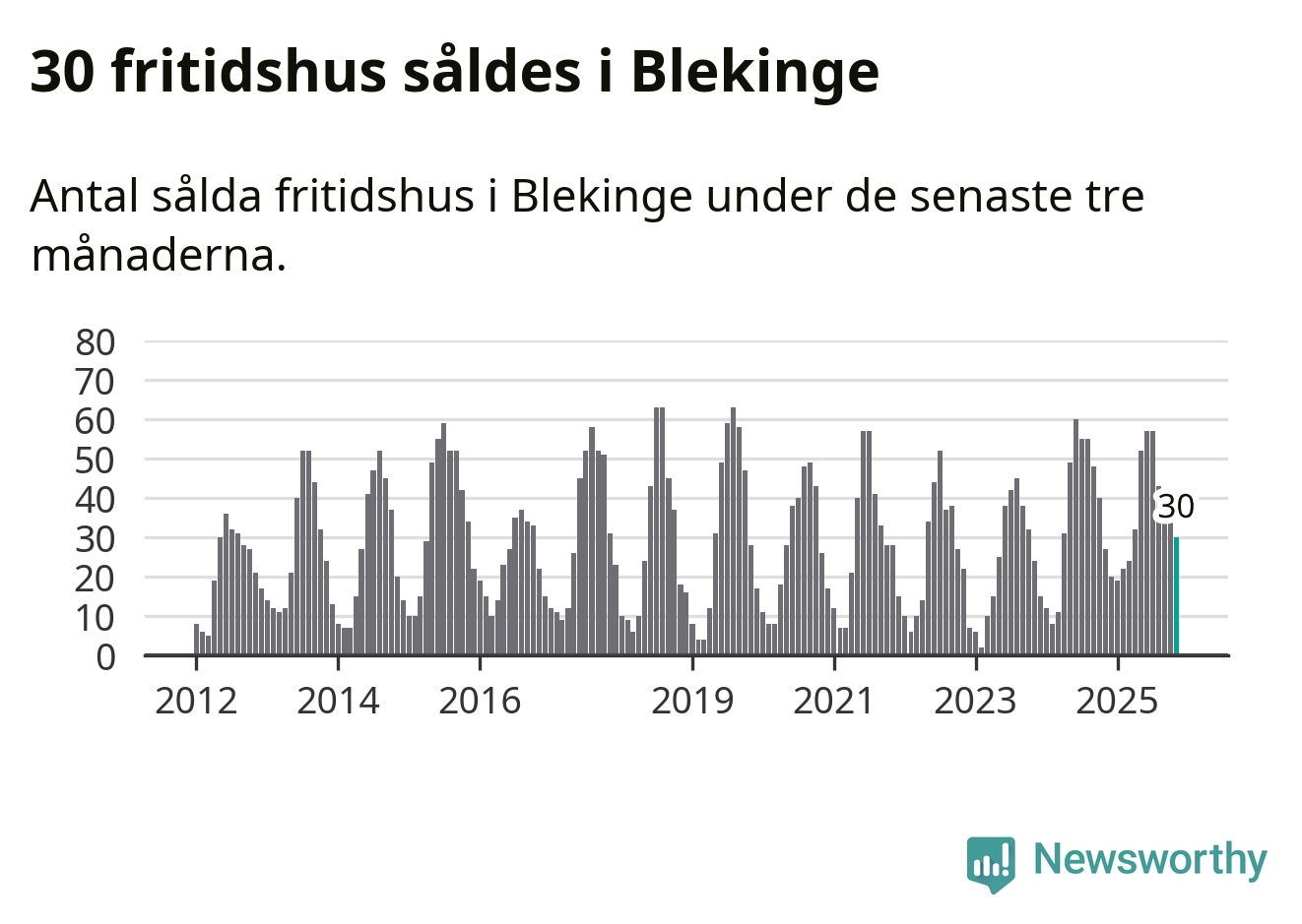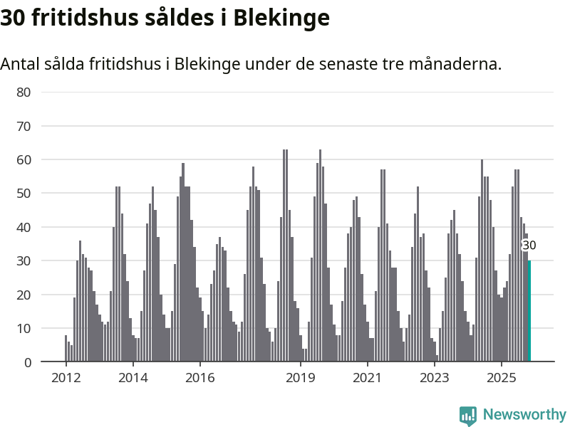Sammanlagt såldes 30 fritidshus i Blekinge län mellan september och november till ett genomsnittligt pris på 2,0 miljoner kronor. I fjol gjordes 27 affärer vid den här tiden på året.