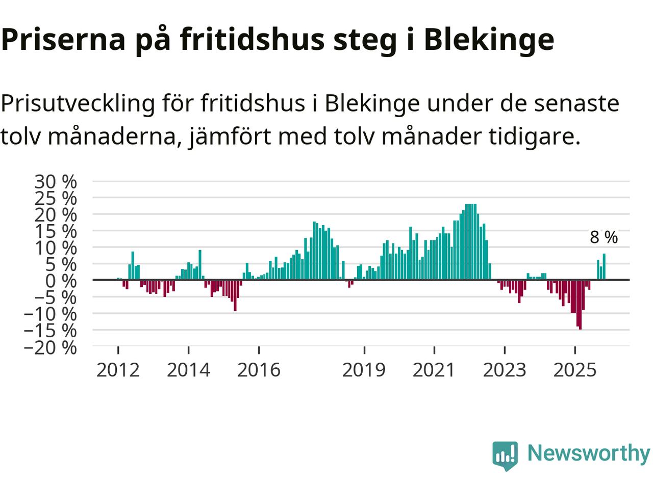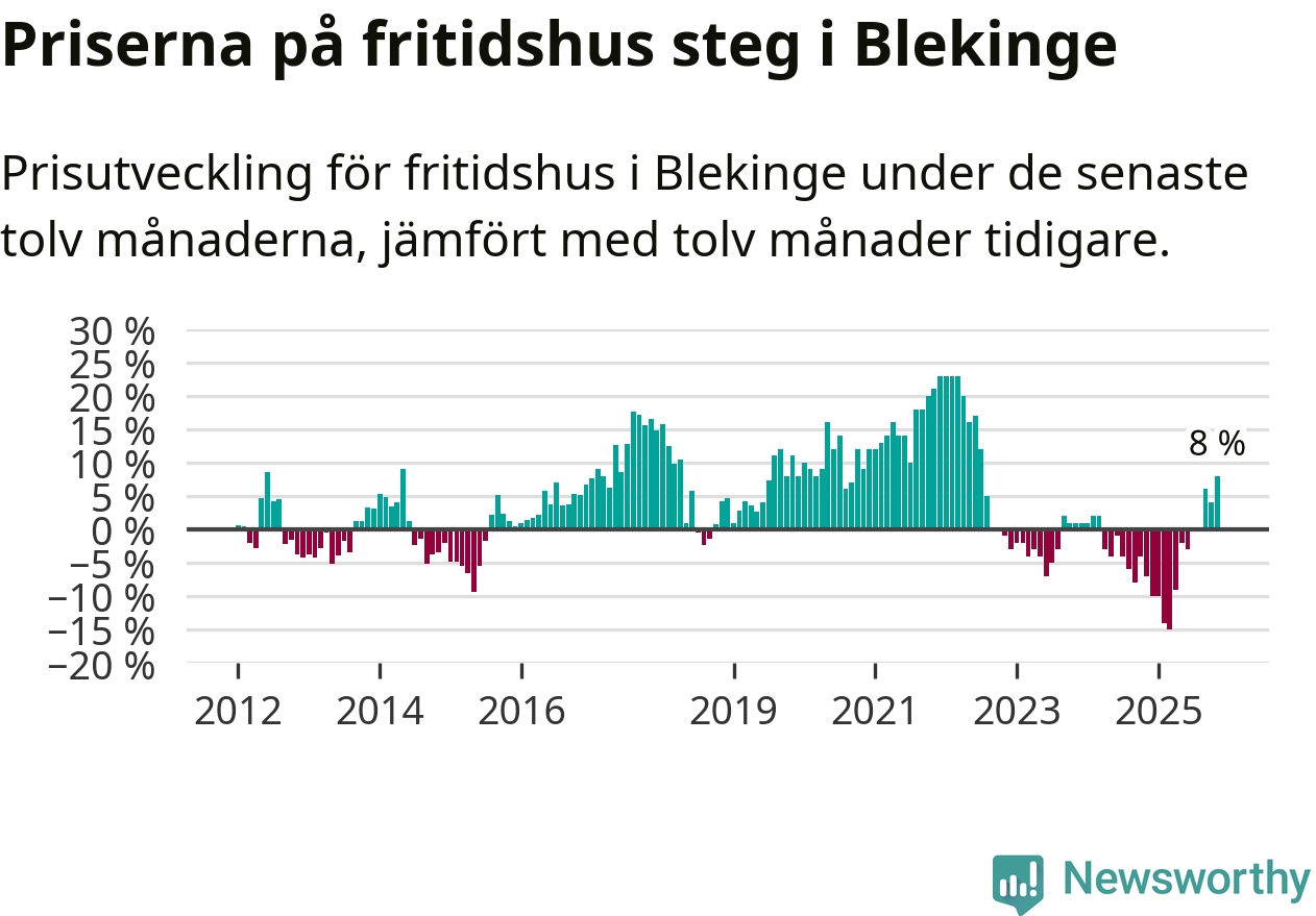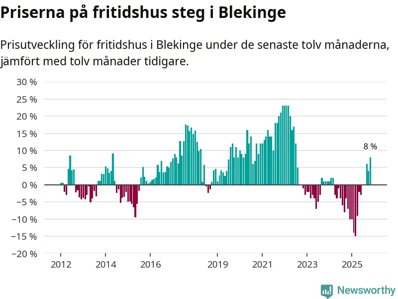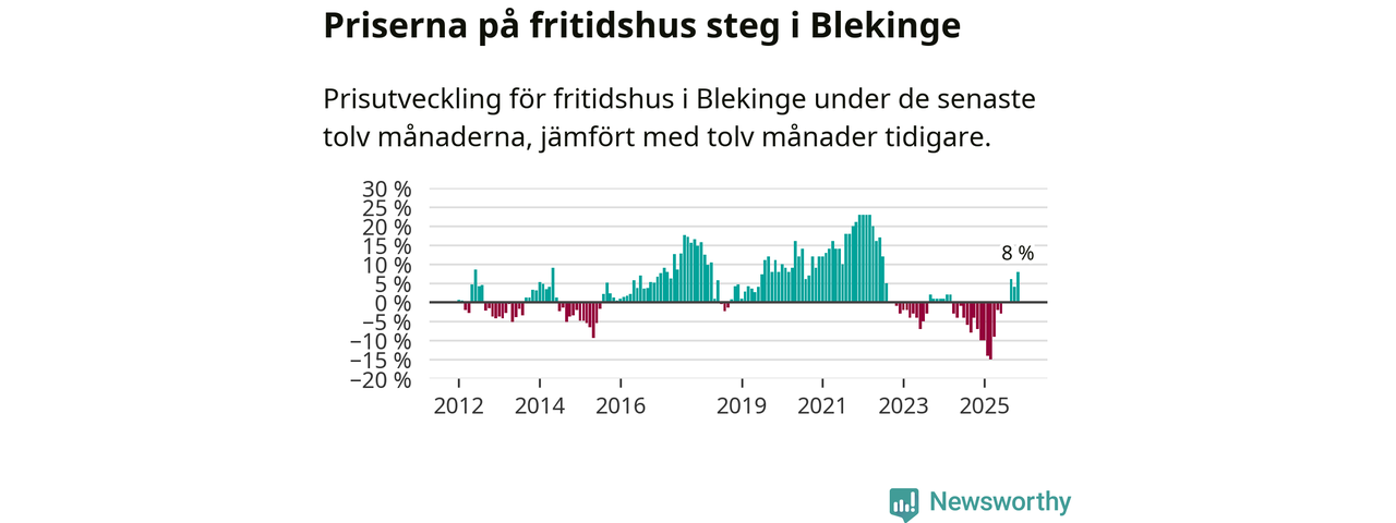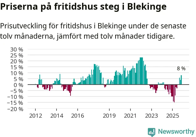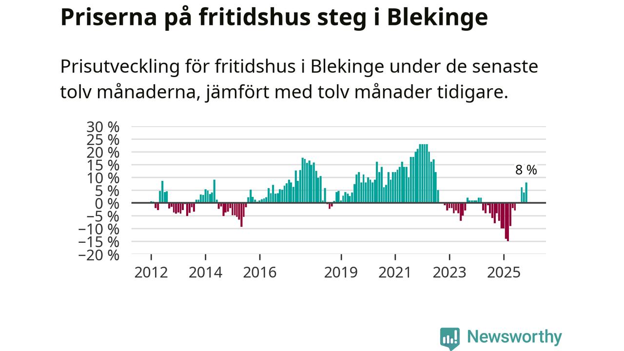 Priserna på fritidshus steg med åtta procent i Blekinge län under de senaste tolv månaderna. Det är den starkaste prisutvecklingen sedan 2022.