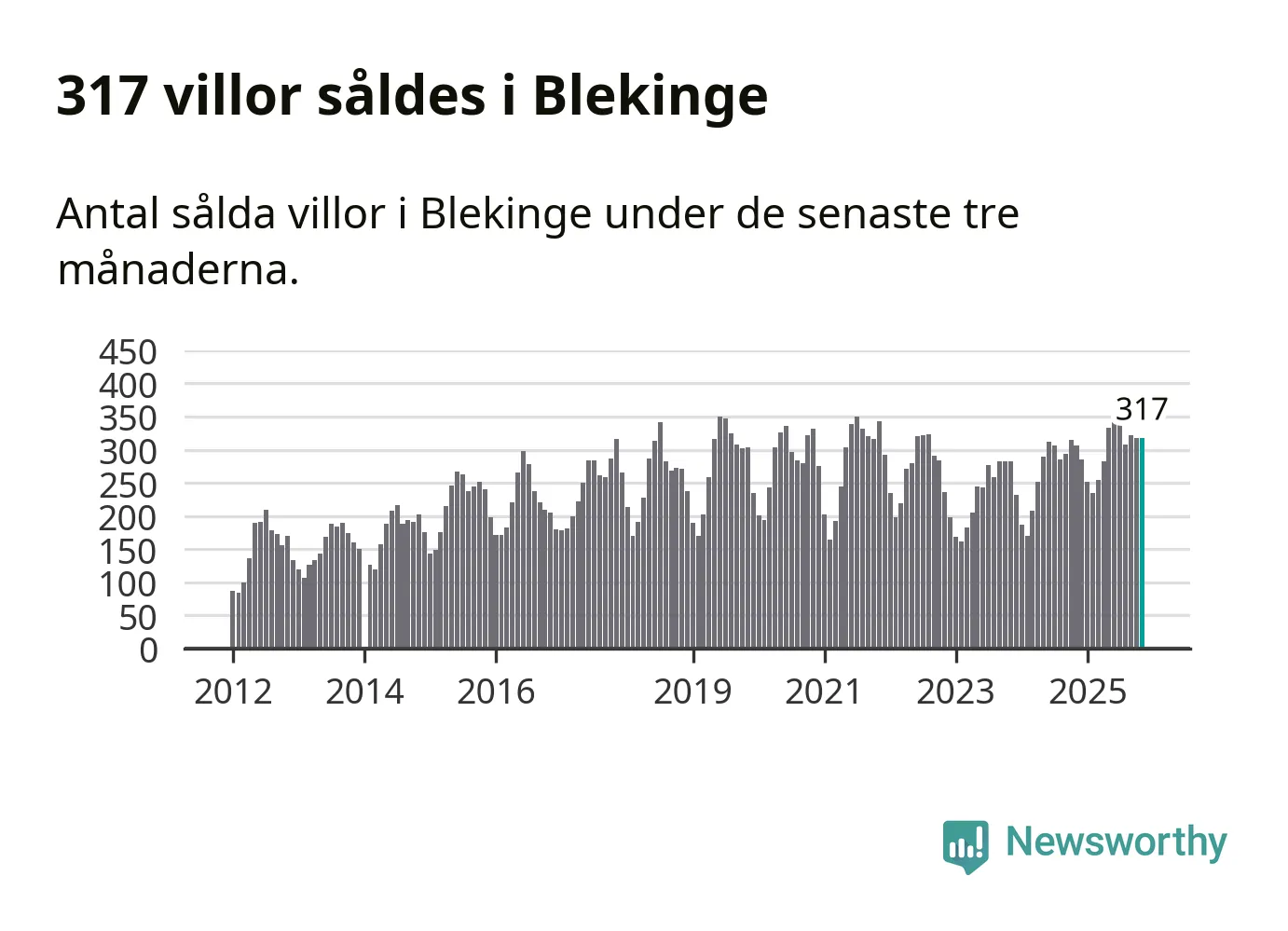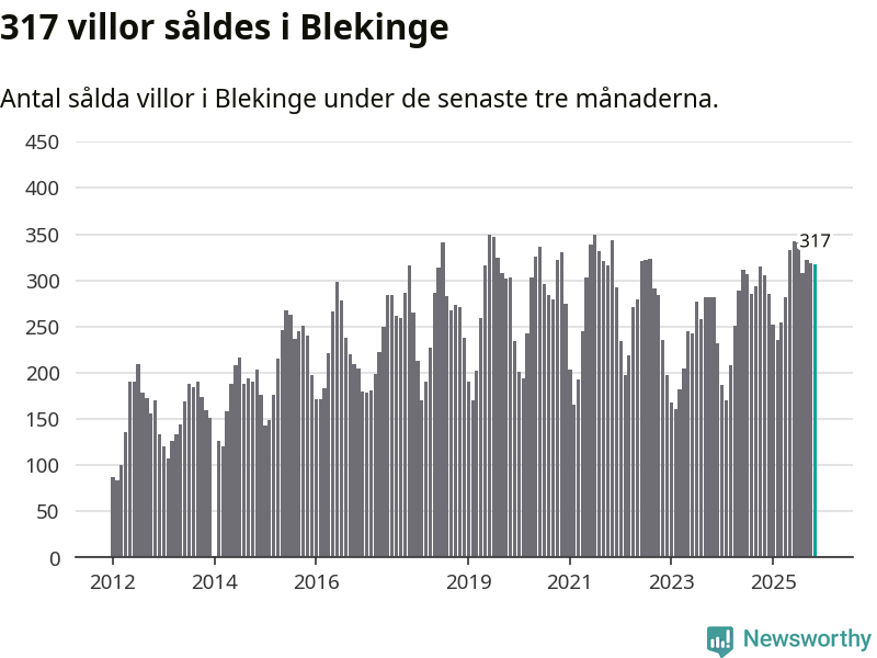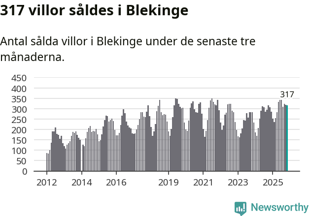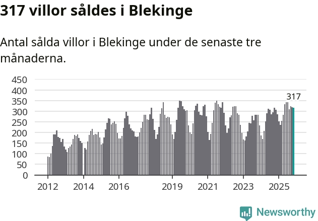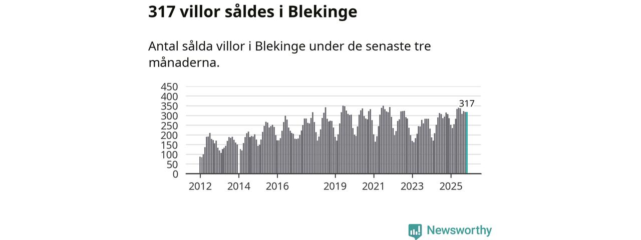 Sammanlagt såldes 317 villor i Blekinge län mellan september och november till ett genomsnittligt pris på 2,3 miljoner kronor. I fjol gjordes 306 affärer vid den här tiden på året.