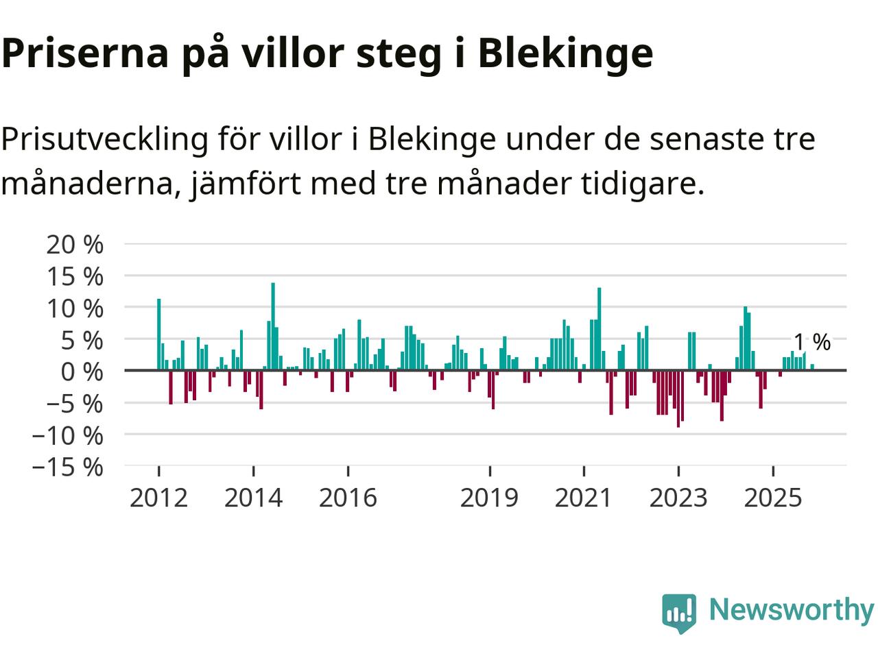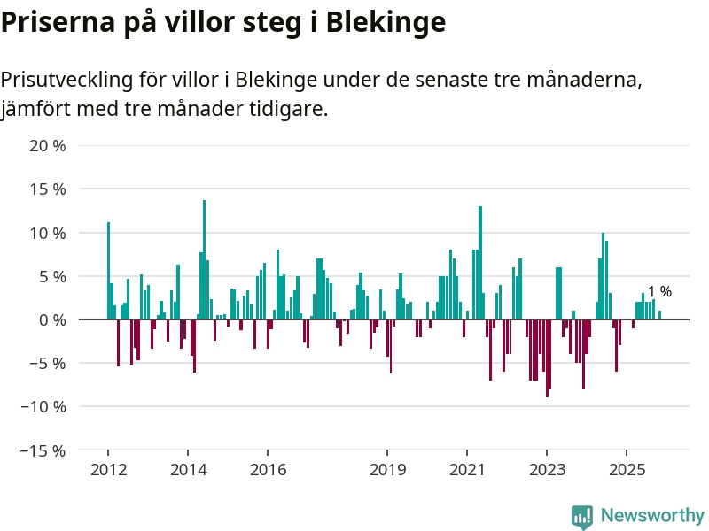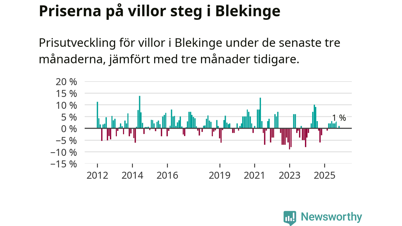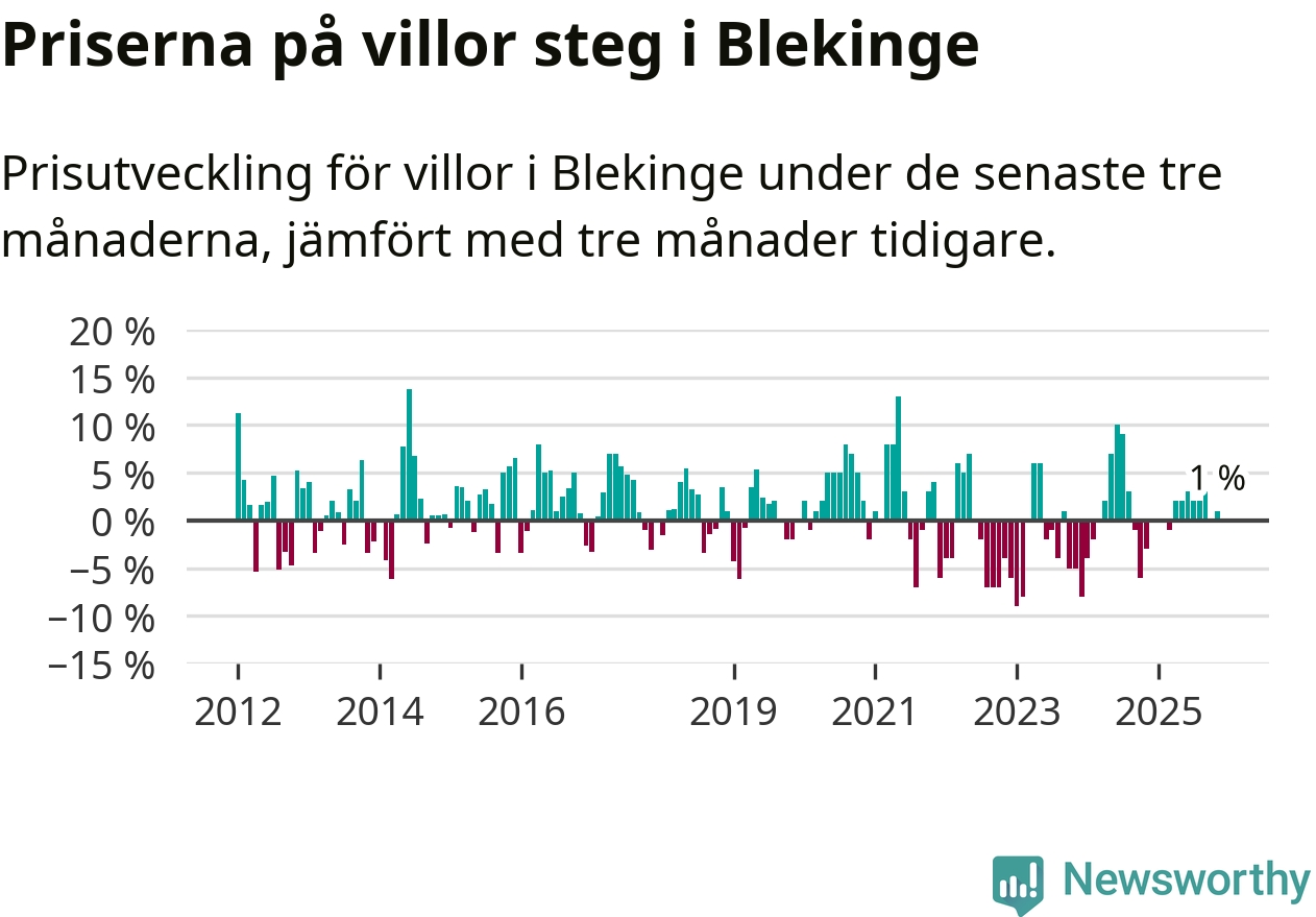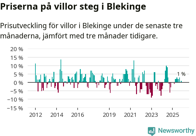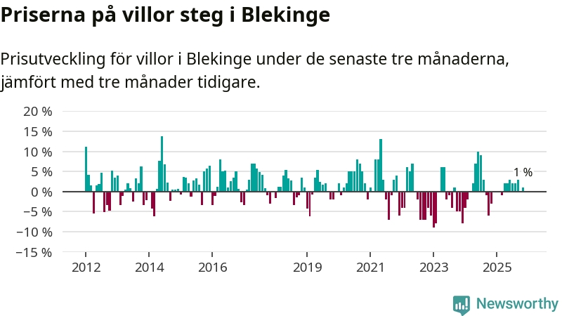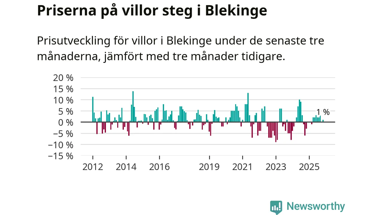 Villapriserna har gått upp i Blekinge län. Medelpriset på försäljningarna under de senaste tre månaderna visar på en uppgång med 1 procent.