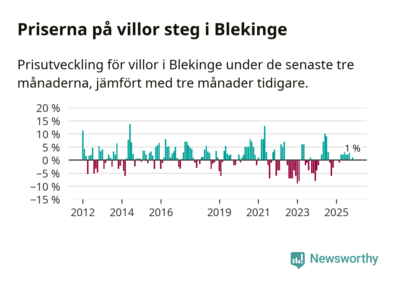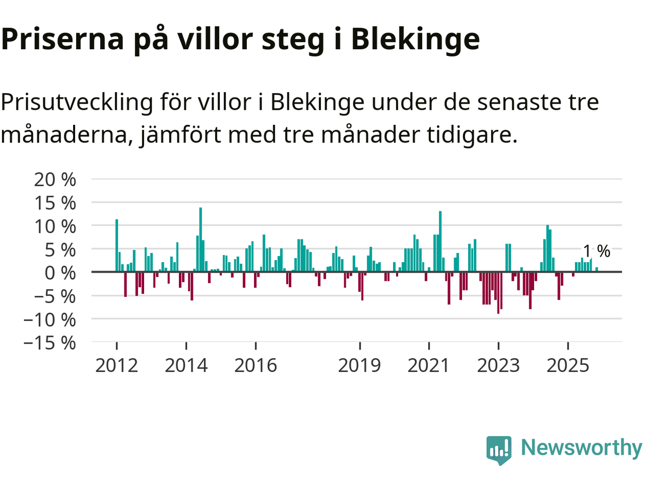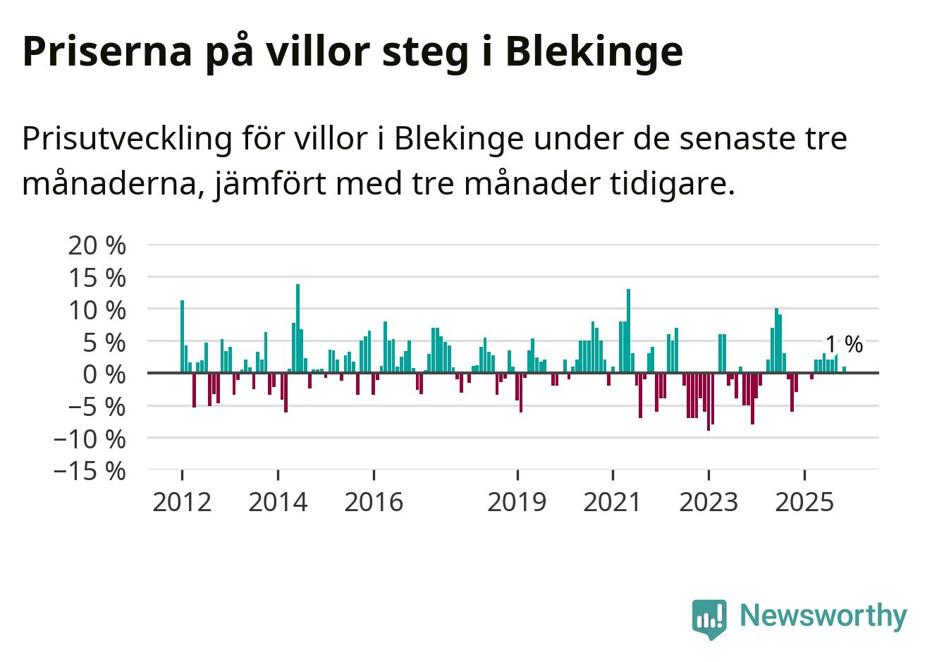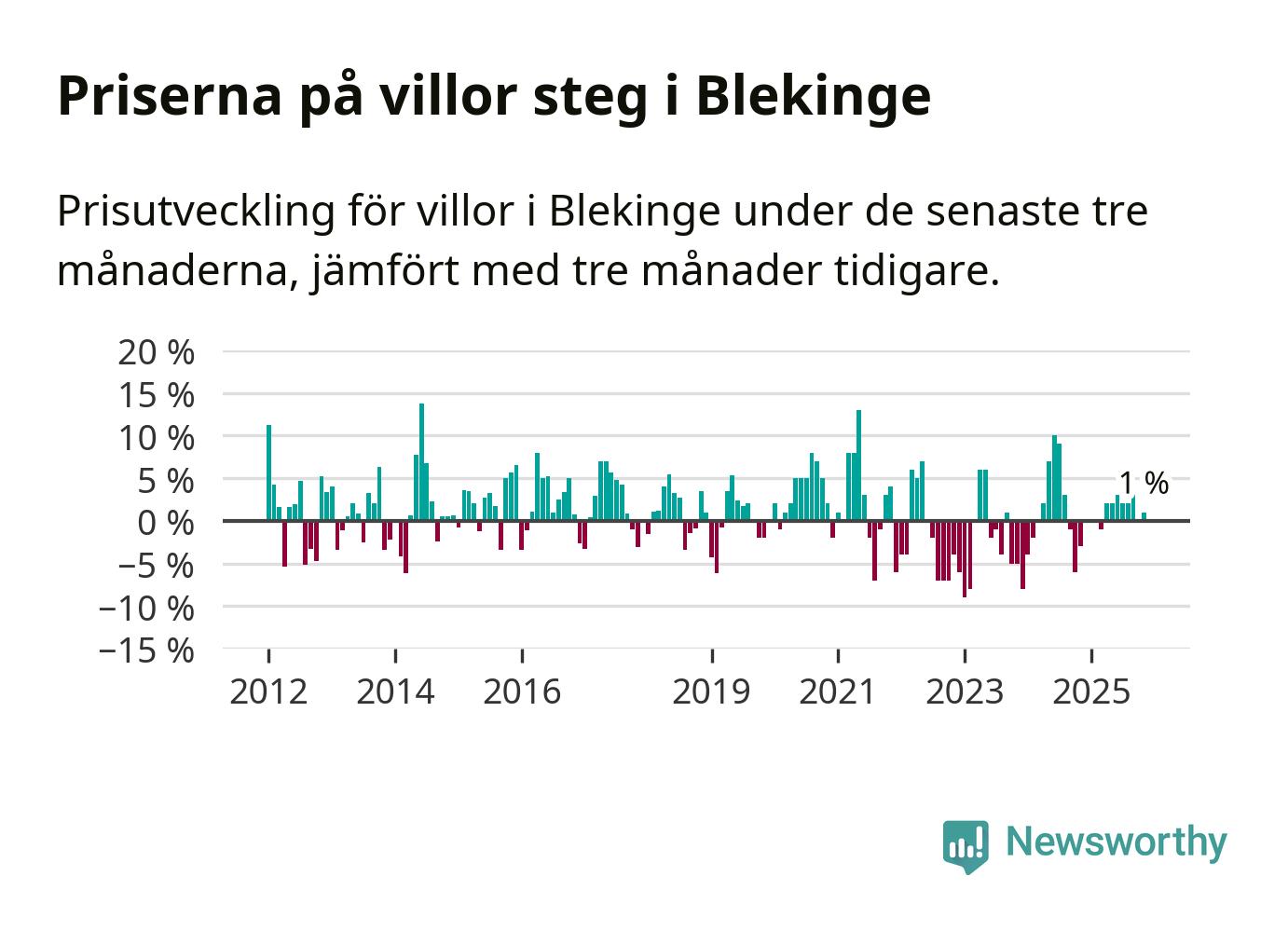 Villapriserna har gått upp i Blekinge län. Medelpriset på försäljningarna under de senaste tre månaderna visar på en uppgång med 1 procent.