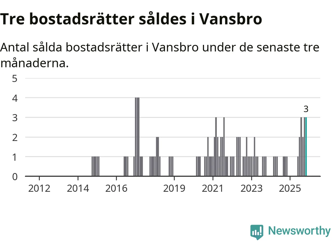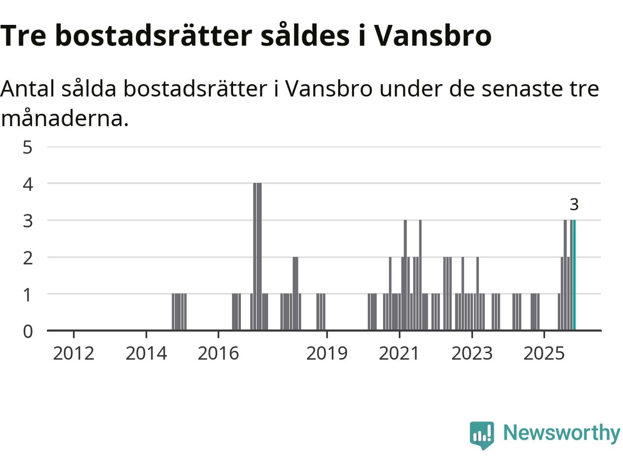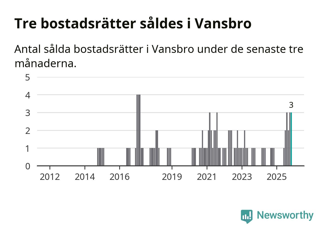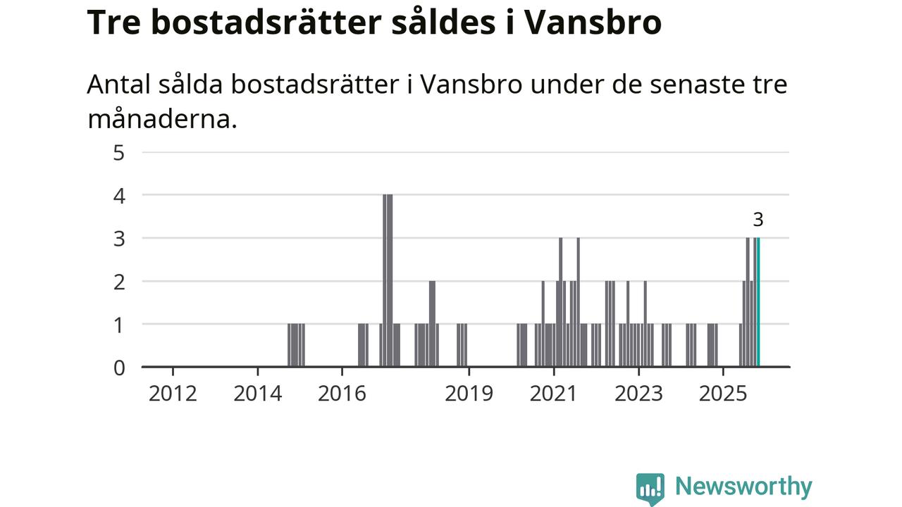 Mellan september och november gjordes sammanlagt tre affärer med bostadsrätter i Vansbro kommun. Det kan jämföras med ett vid motsvarande tid i fjol.