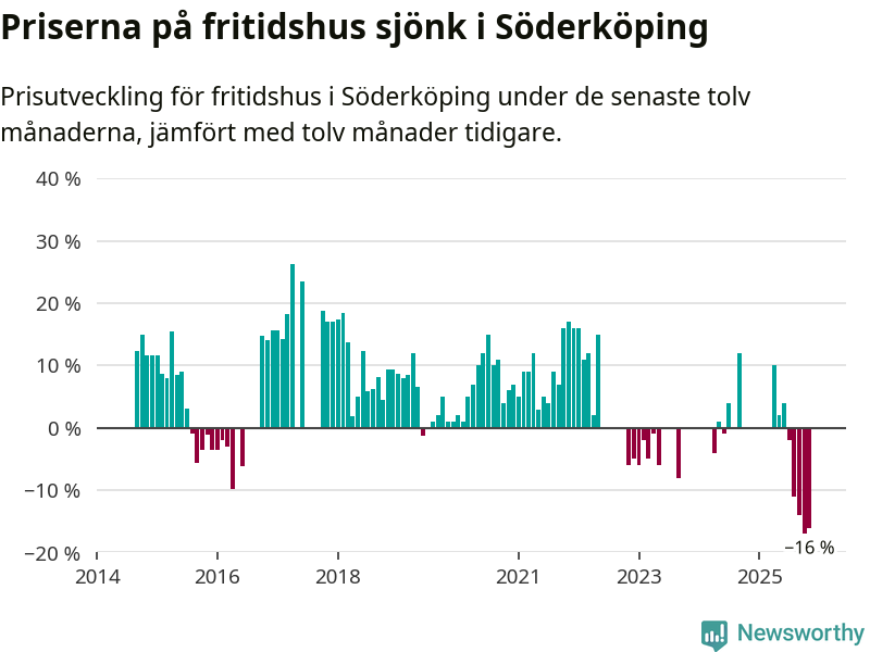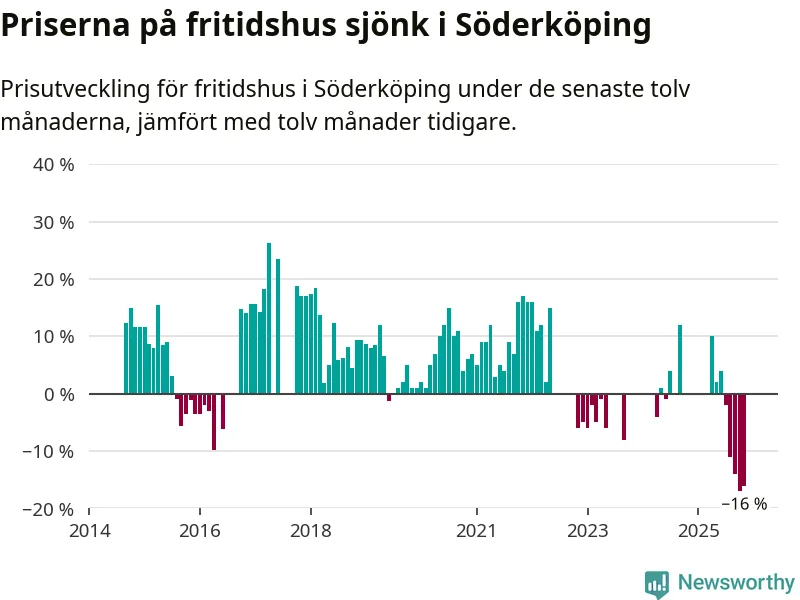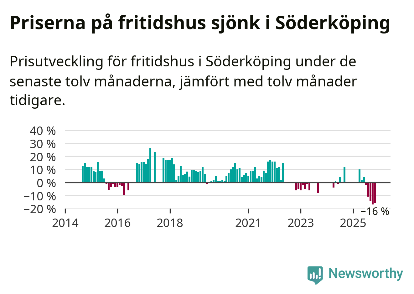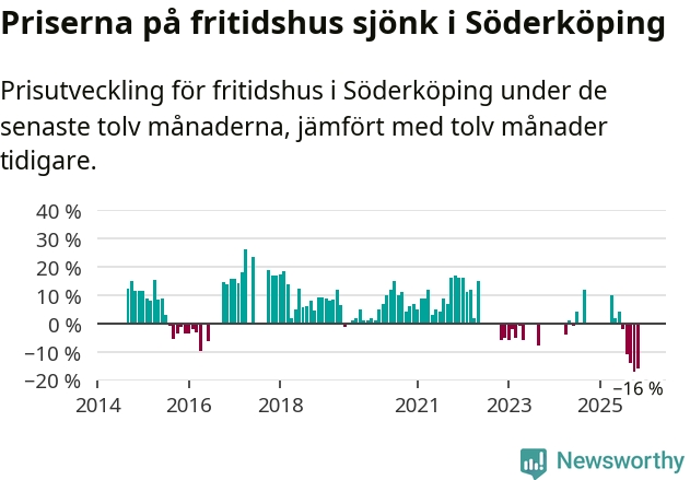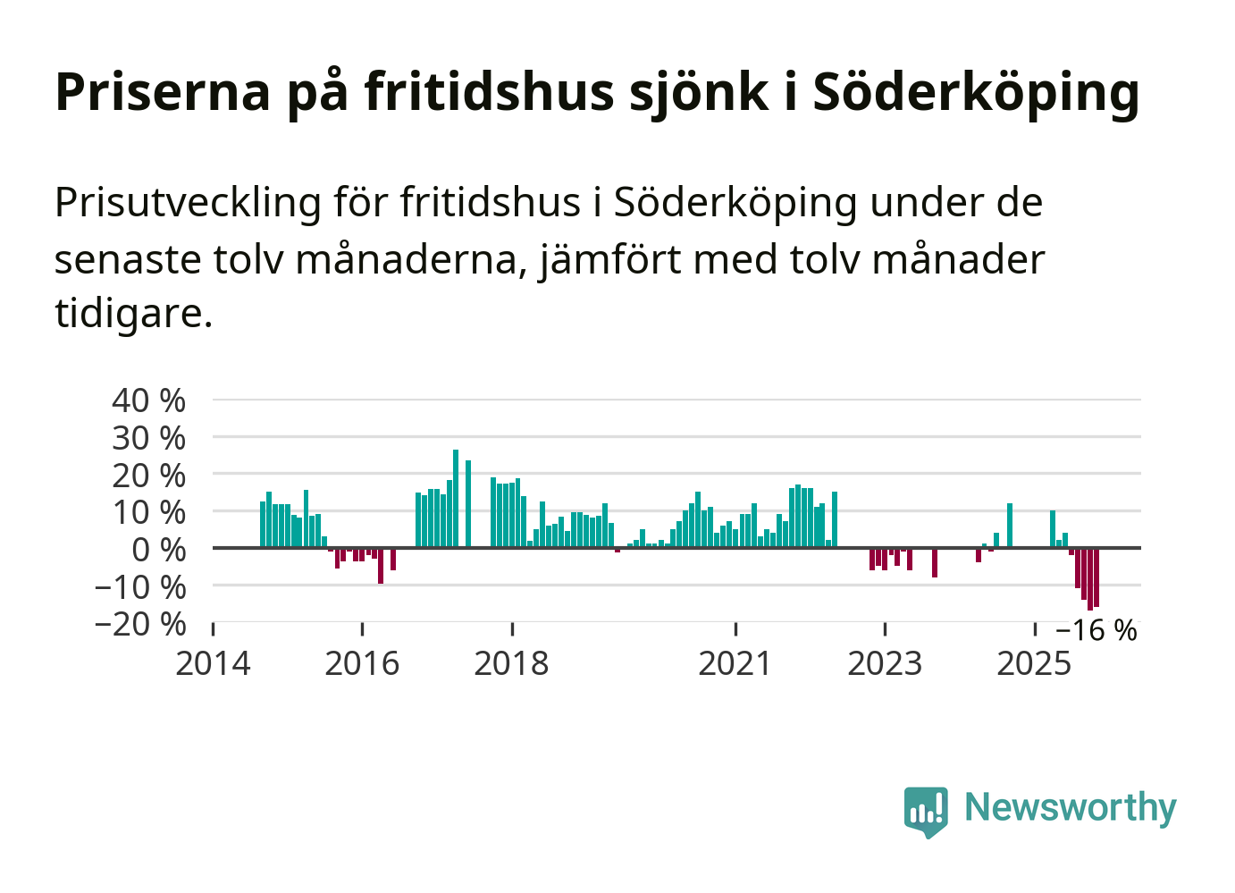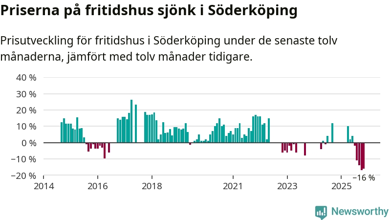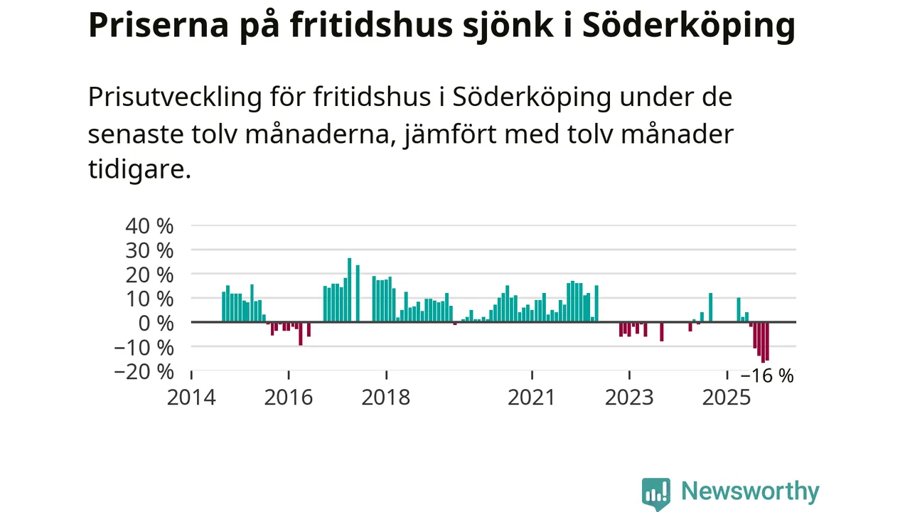 Priserna på fritidshus har gått ner i Söderköpings kommun. Medelpriset på försäljningarna under de senaste tolv månaderna visar på en nedgång med 16 procent.
