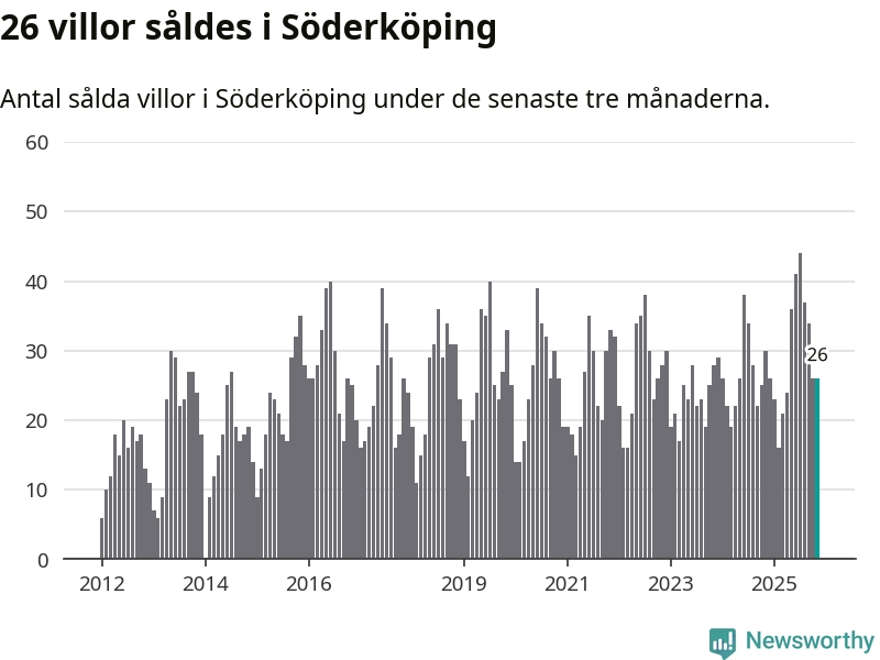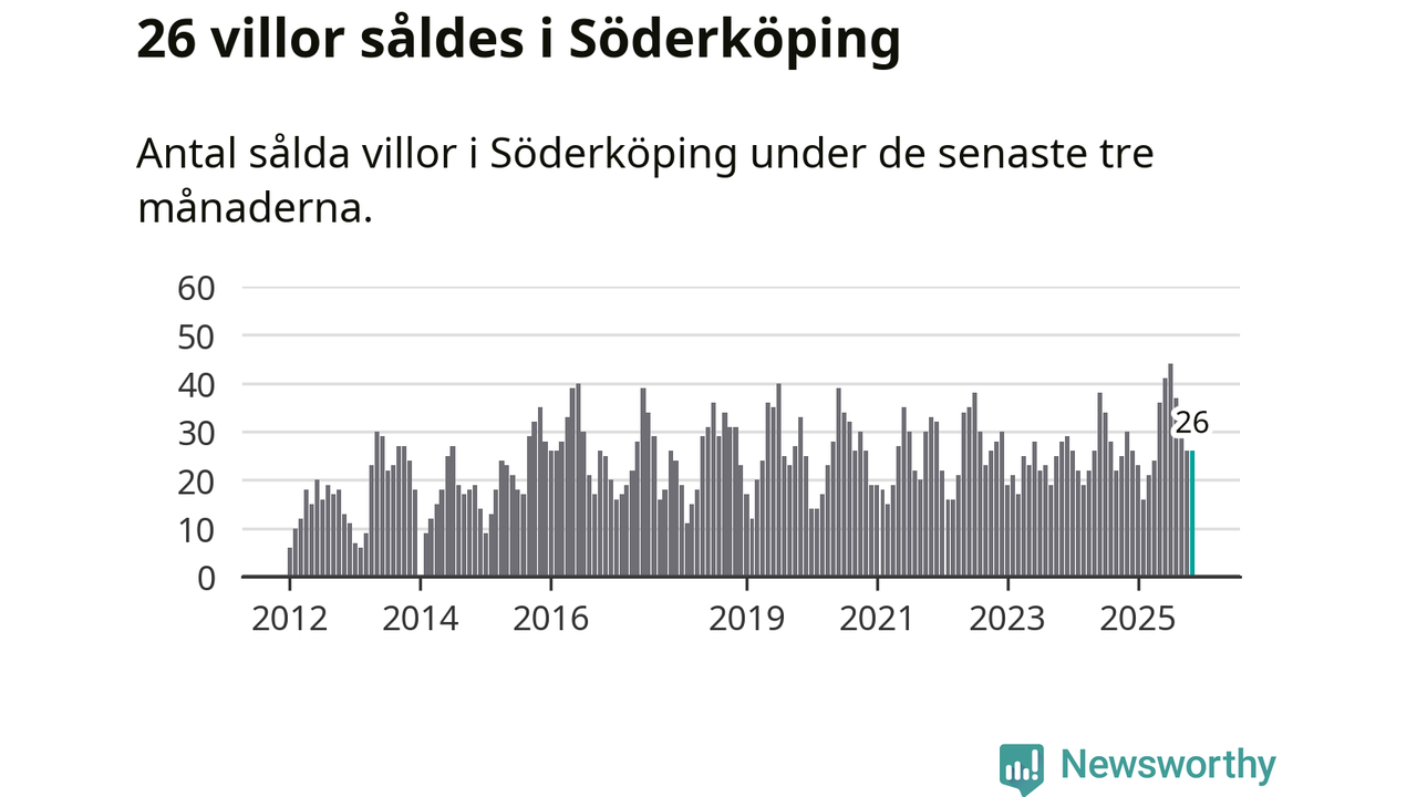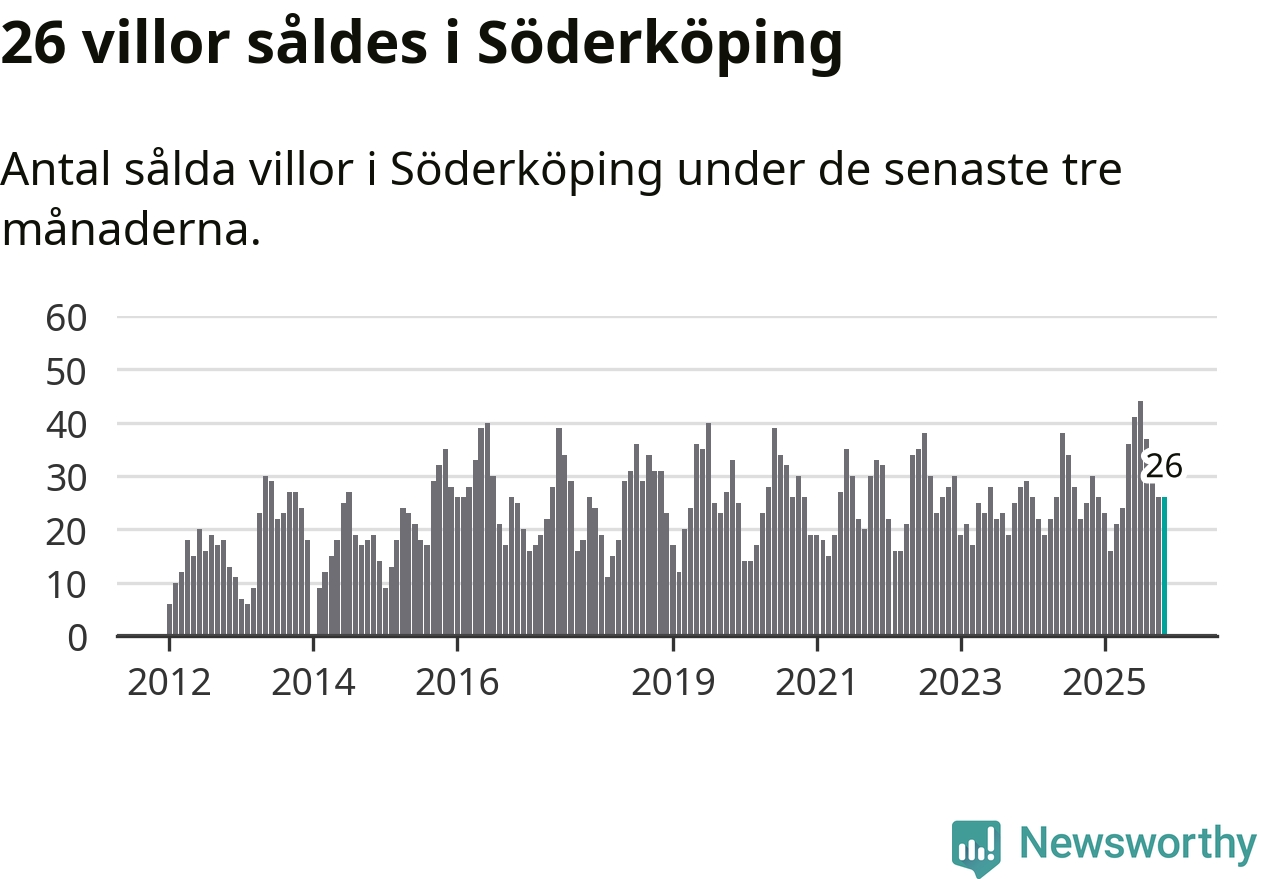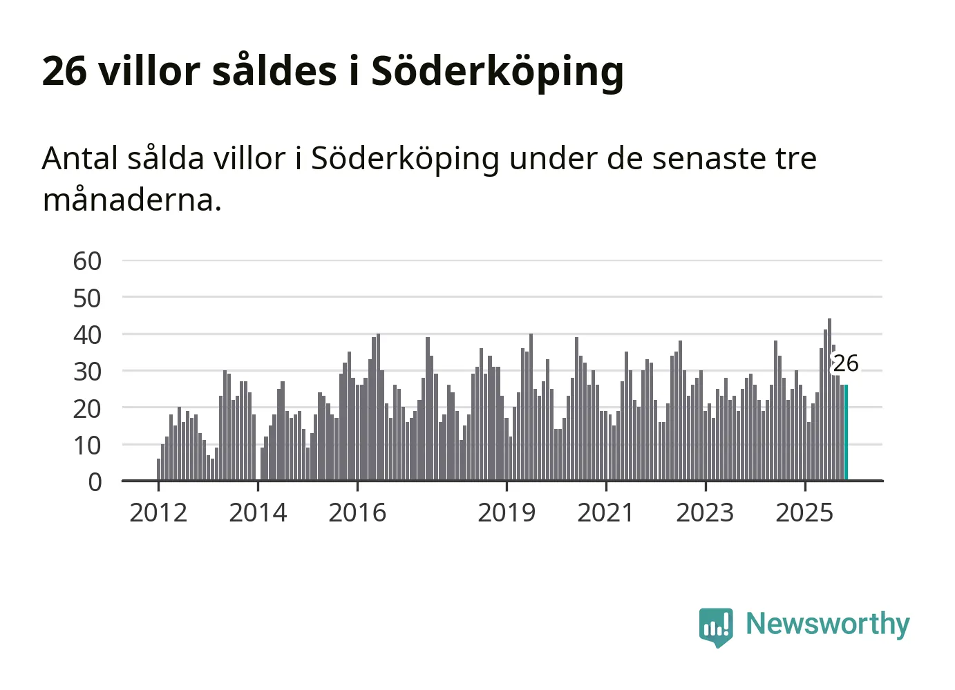 Mellan september och november såldes 26 villor i Söderköpings kommun. Det är relativt få sett till aktiviteten på bostadsmarknaden i kommunen under de senaste tolv månaderna, samt det historiska snittet för den här tiden på året.