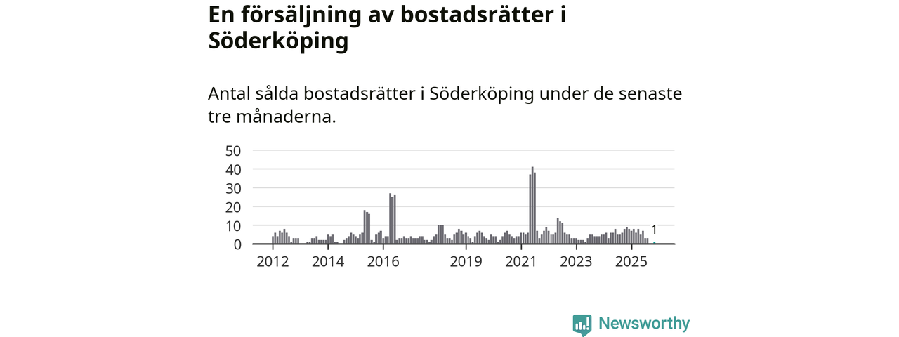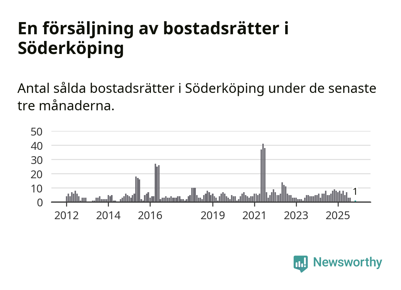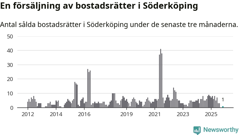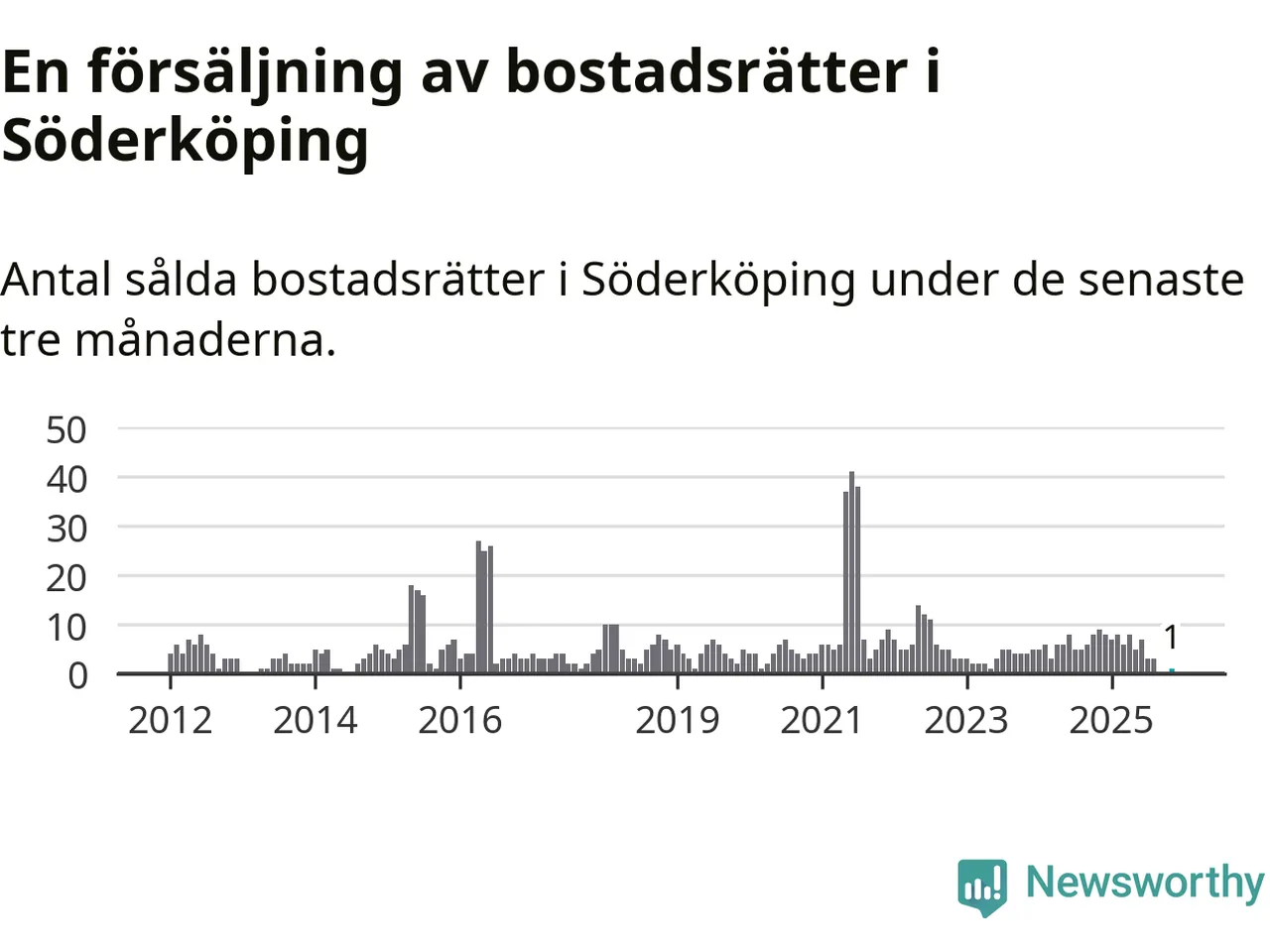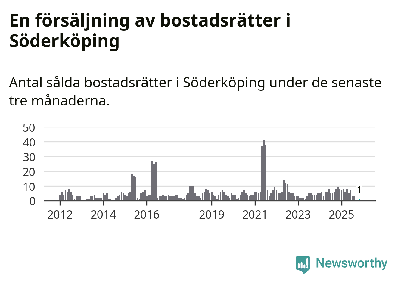 Mellan september och november gjordes sammanlagt en affär med bostadsrätter i Söderköpings kommun. Det kan jämföras med nio vid motsvarande tid i fjol.
