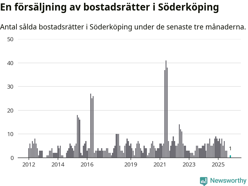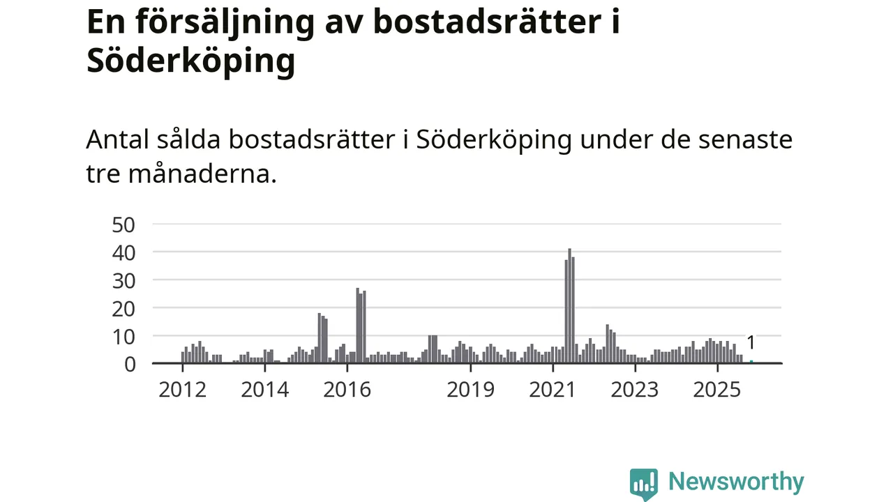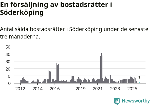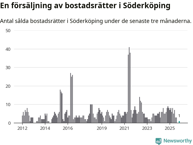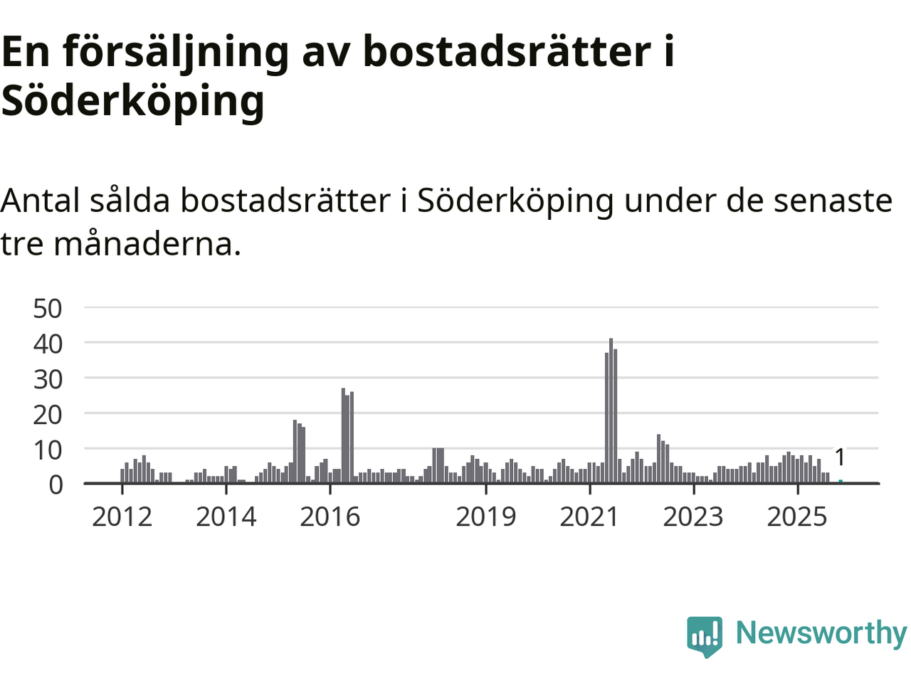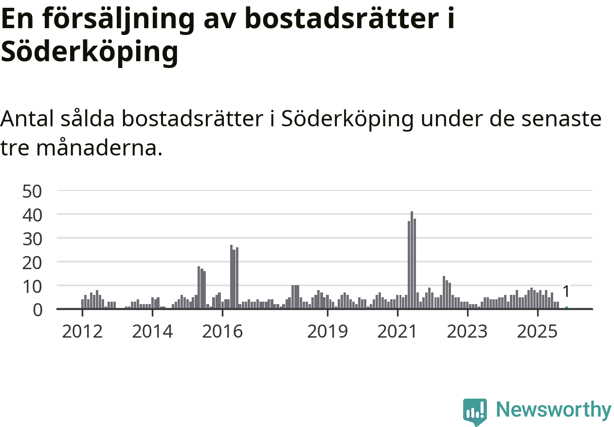 Mellan september och november gjordes sammanlagt en affär med bostadsrätter i Söderköpings kommun. Det kan jämföras med nio vid motsvarande tid i fjol.