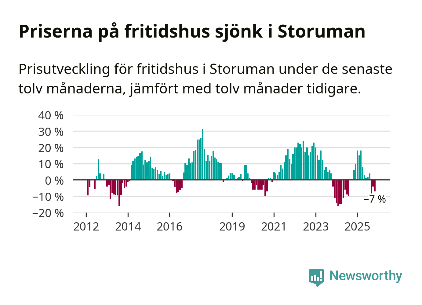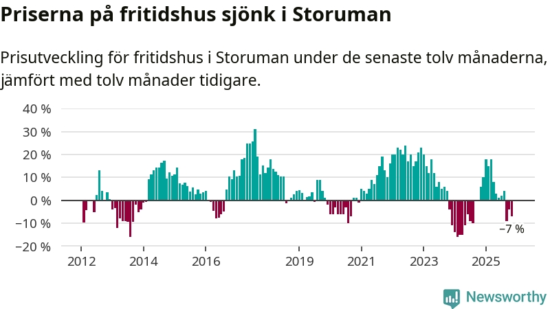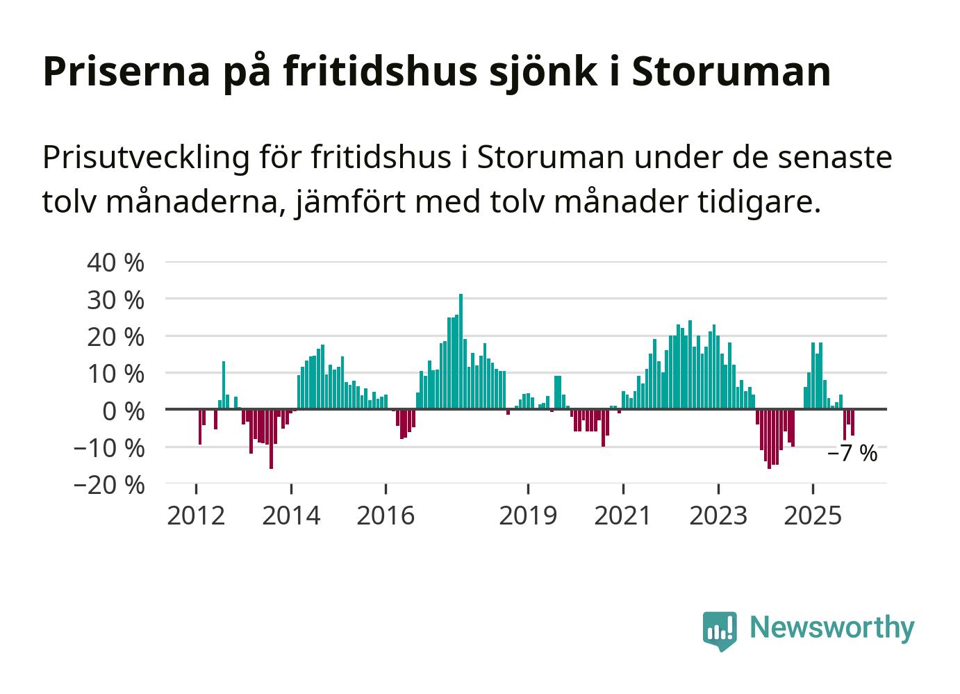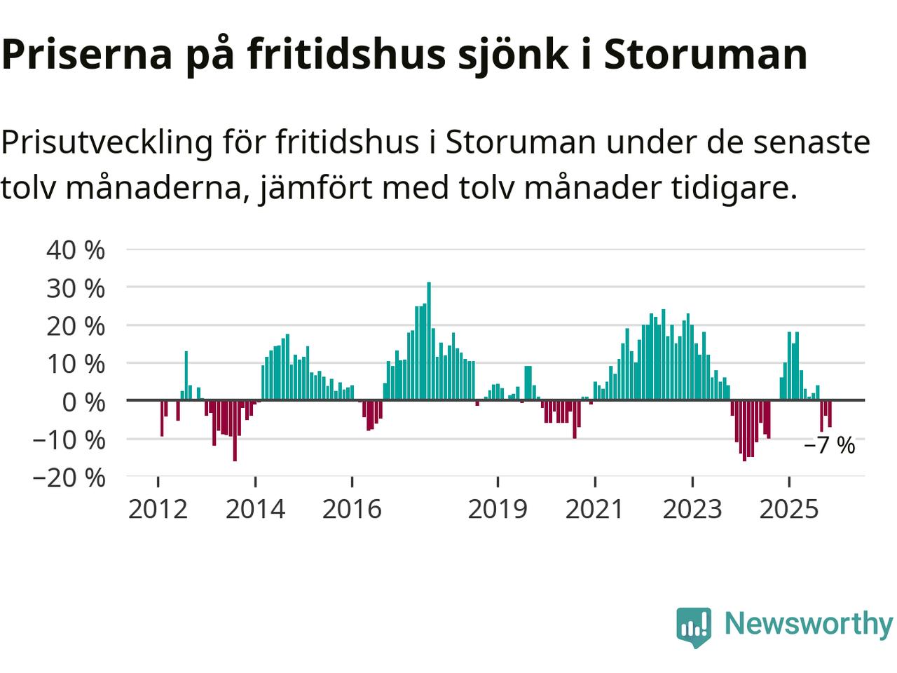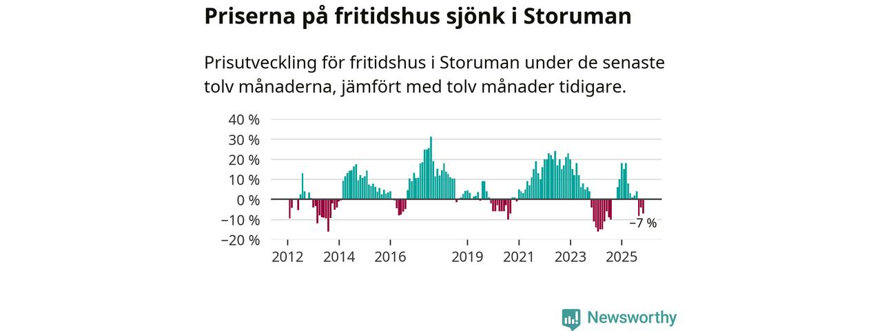 Priserna på fritidshus har gått ner i Storumans kommun. Medelpriset på försäljningarna under de senaste tolv månaderna visar på en nedgång med 7 procent.
