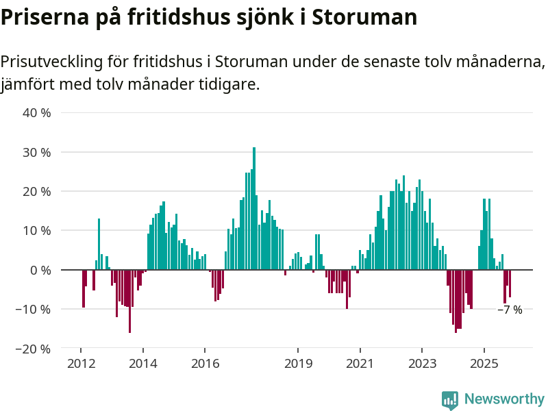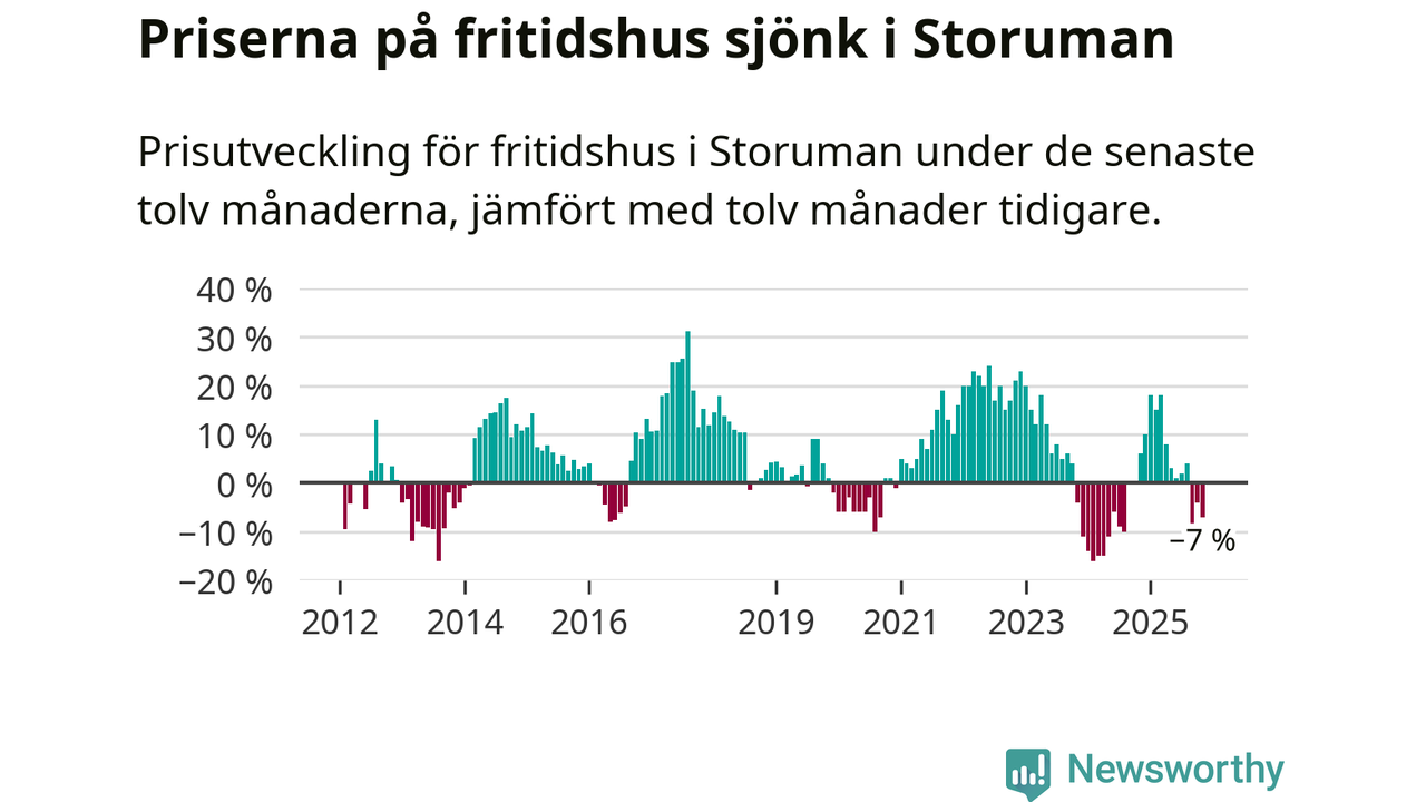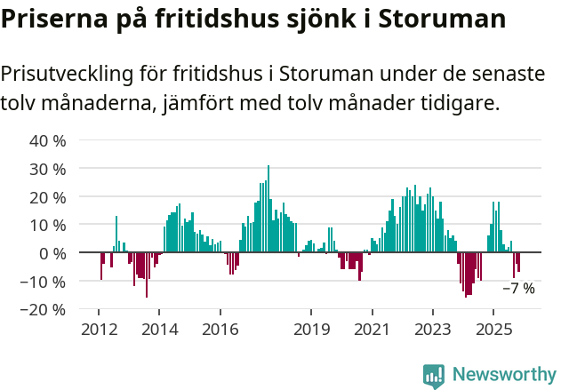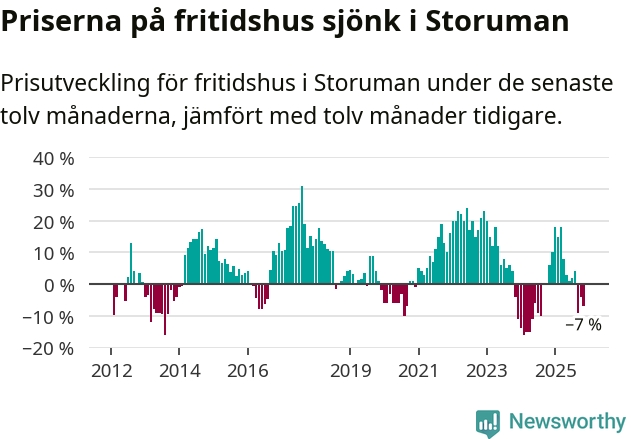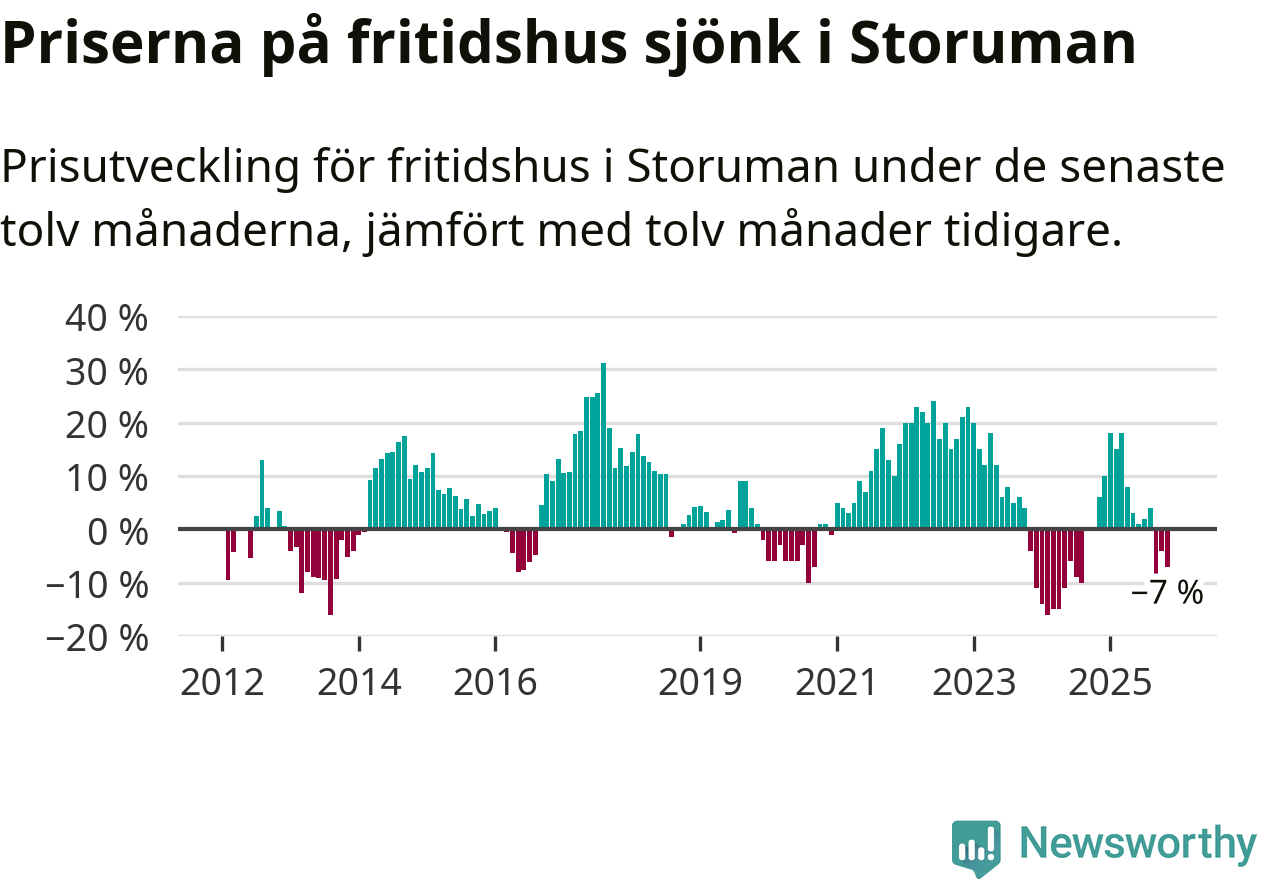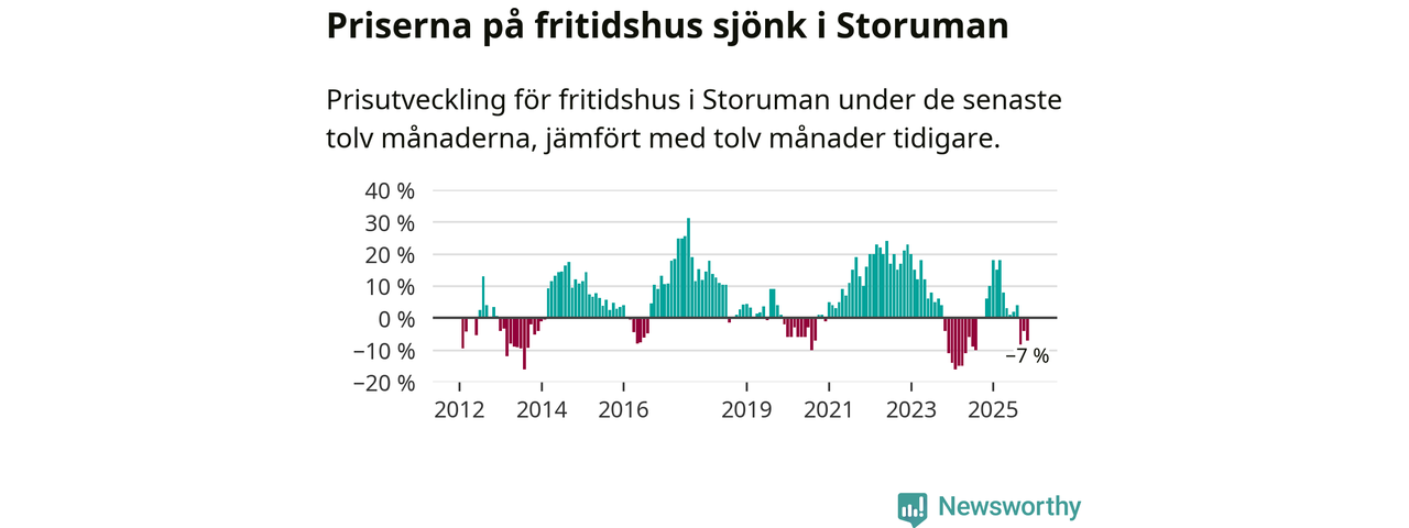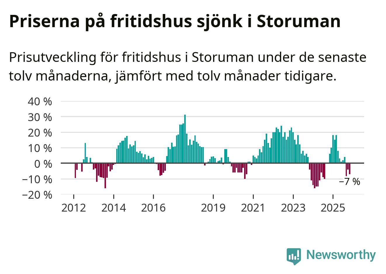 Priserna på fritidshus har gått ner i Storumans kommun. Medelpriset på försäljningarna under de senaste tolv månaderna visar på en nedgång med 7 procent.