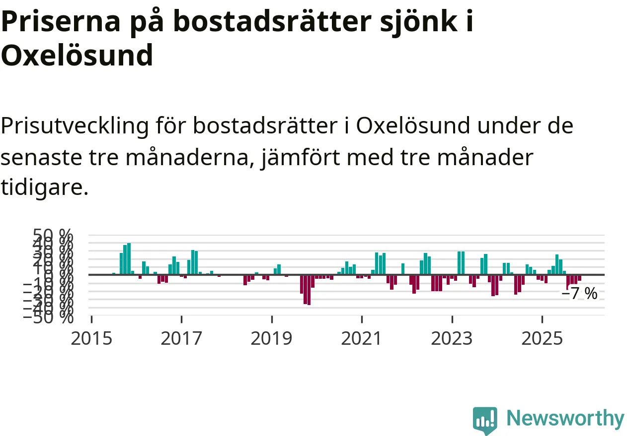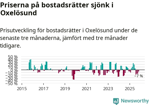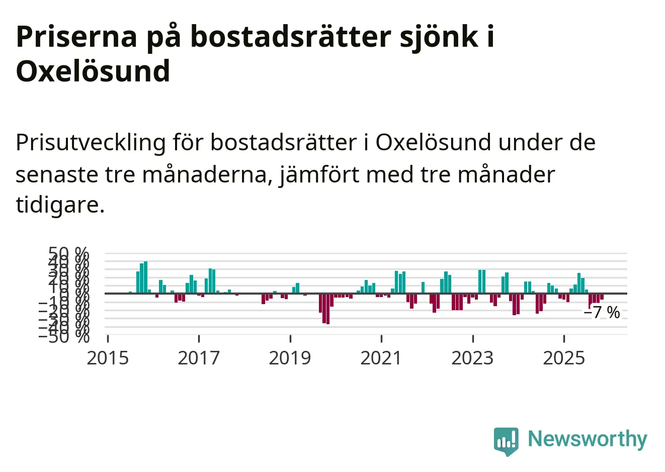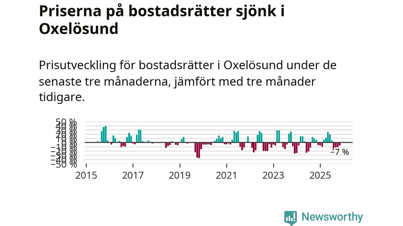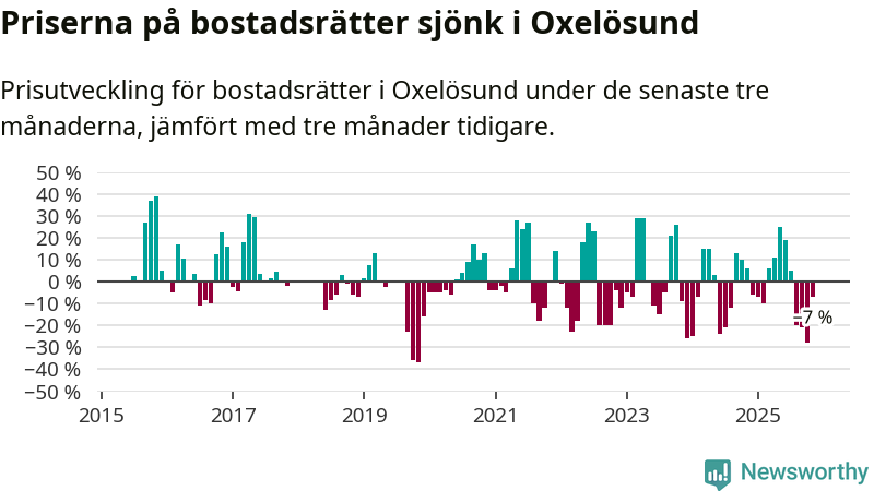Statistiken visar även på en kännbar prisnedgång i Oxelösunds kommun. Medelpriset på försäljningarna av bostadsrätter i kommunen var 7 procent lägre än för tre månader sedan. I hela Södermanland däremot ökar priserna på bostadsrätter. I hela länet noterades en prisuppgång på 4 procent.