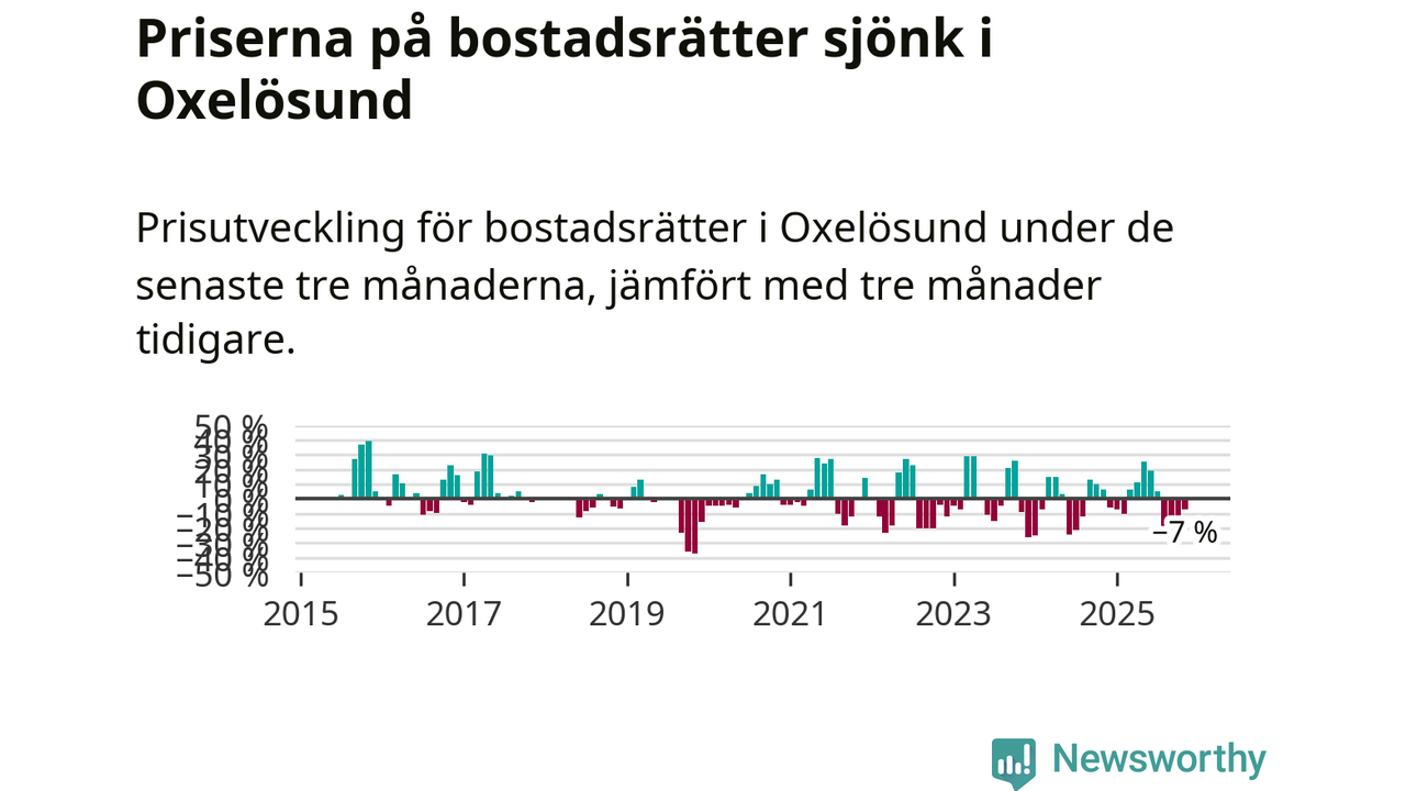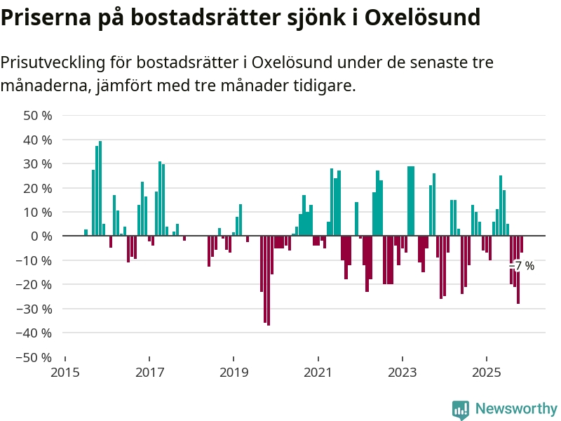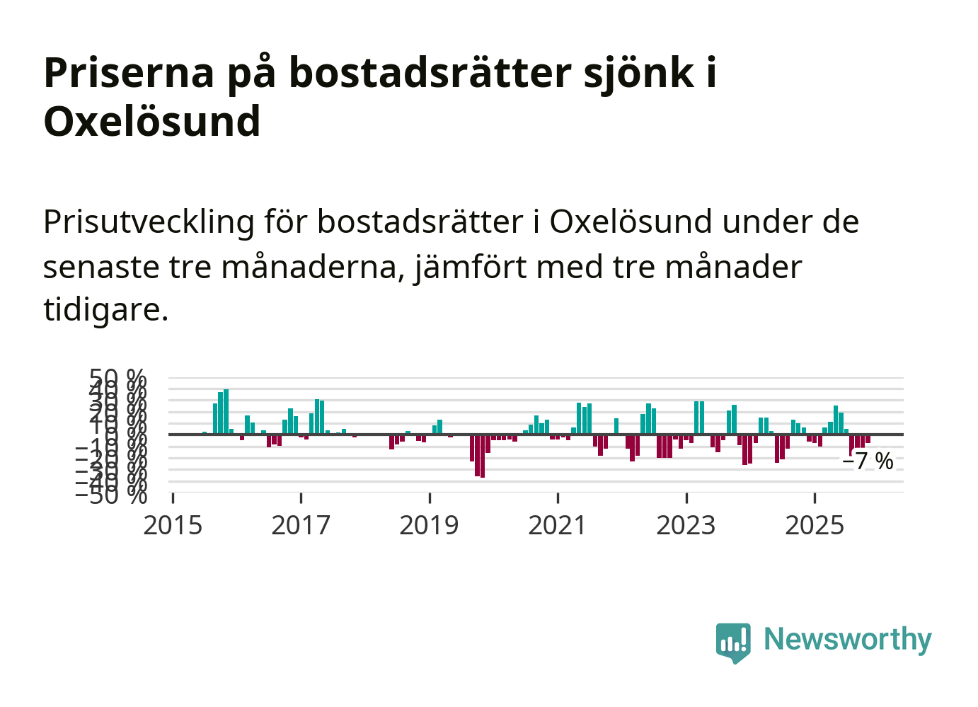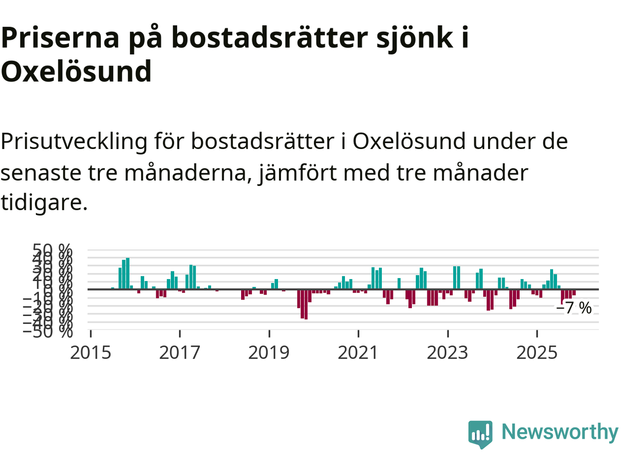Statistiken visar även på en kännbar prisnedgång i Oxelösunds kommun. Medelpriset på försäljningarna av bostadsrätter i kommunen var 7 procent lägre än för tre månader sedan. I hela Södermanland däremot ökar priserna på bostadsrätter. I hela länet noterades en prisuppgång på 4 procent.