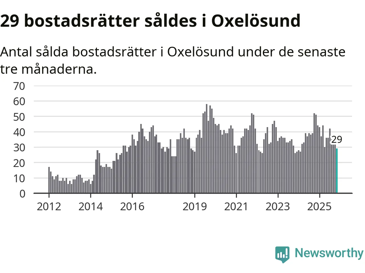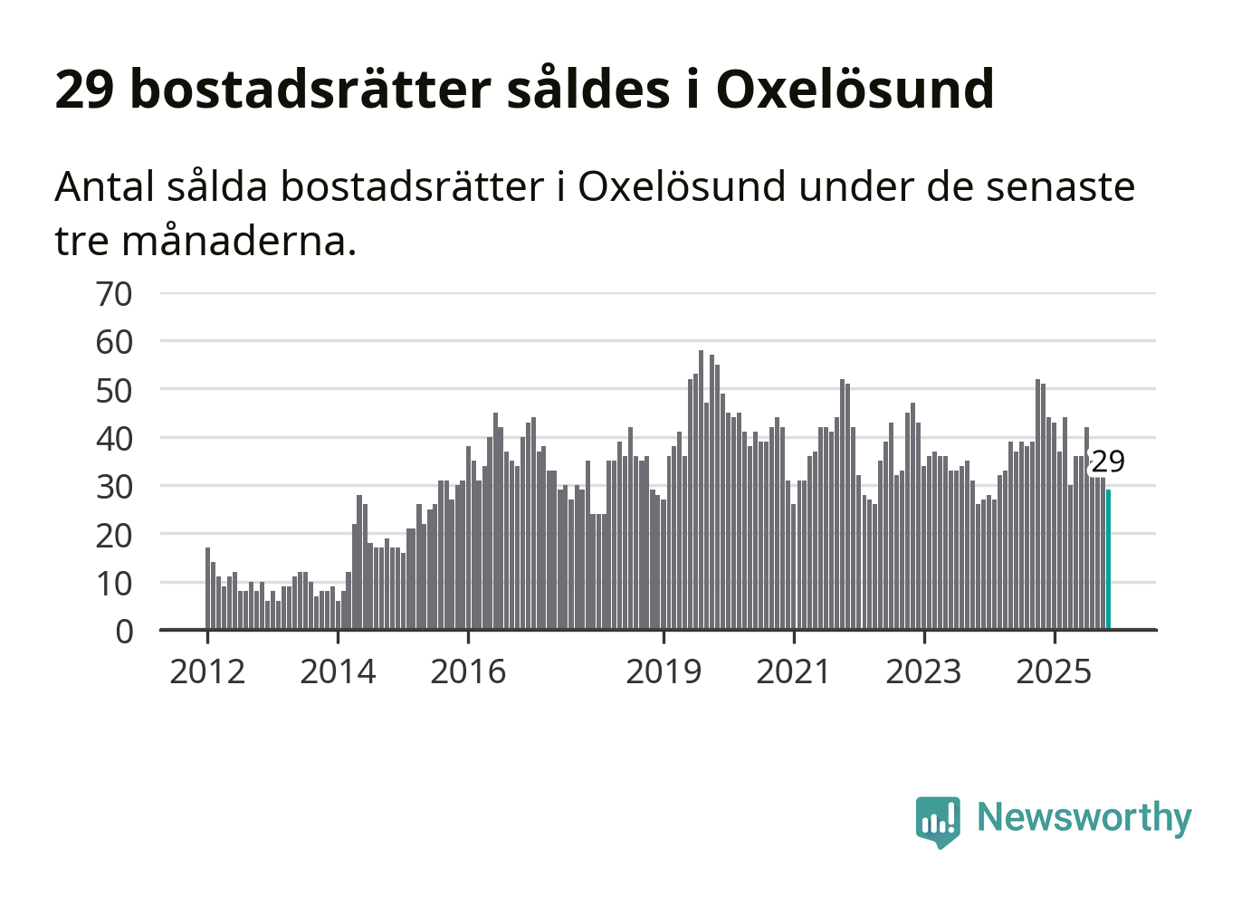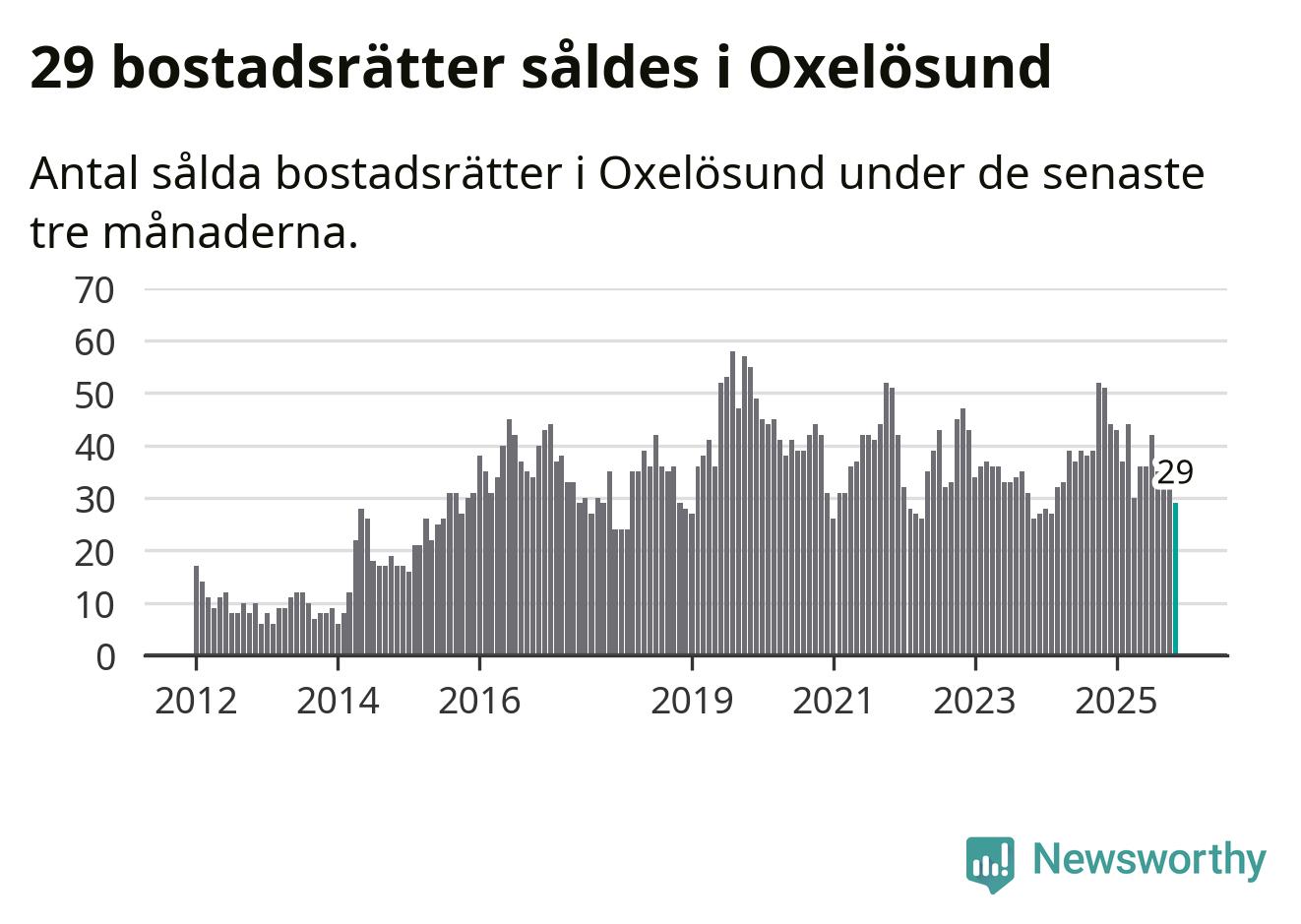 Mellan september och november såldes 29 bostadsrätter i Oxelösunds kommun. Det är relativt få sett till aktiviteten på bostadsmarknaden i kommunen under de senaste tolv månaderna, samt det historiska snittet för den här tiden på året.