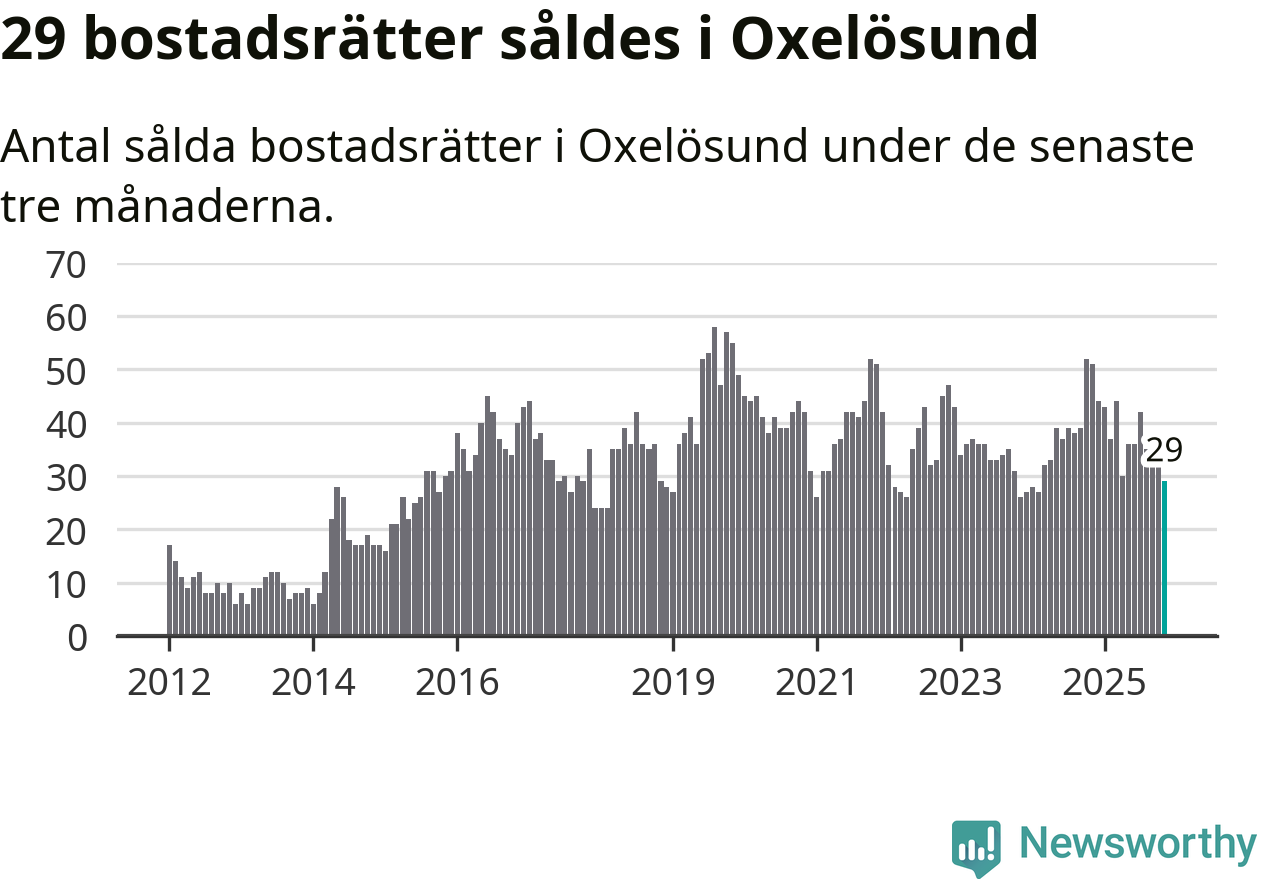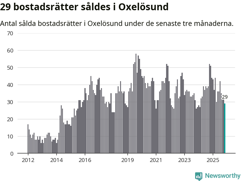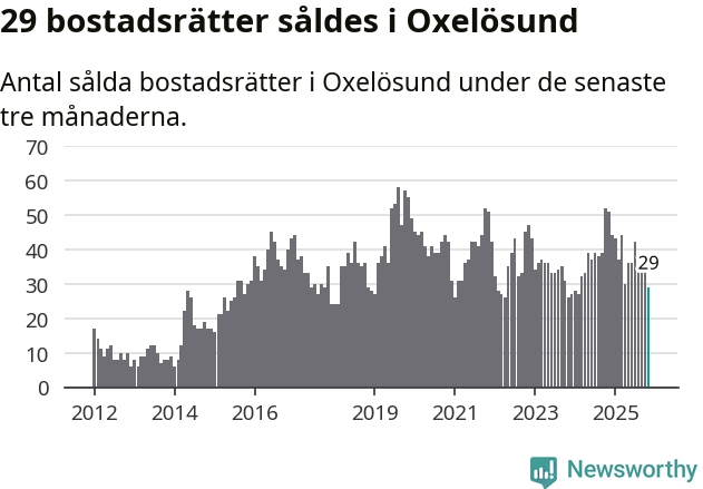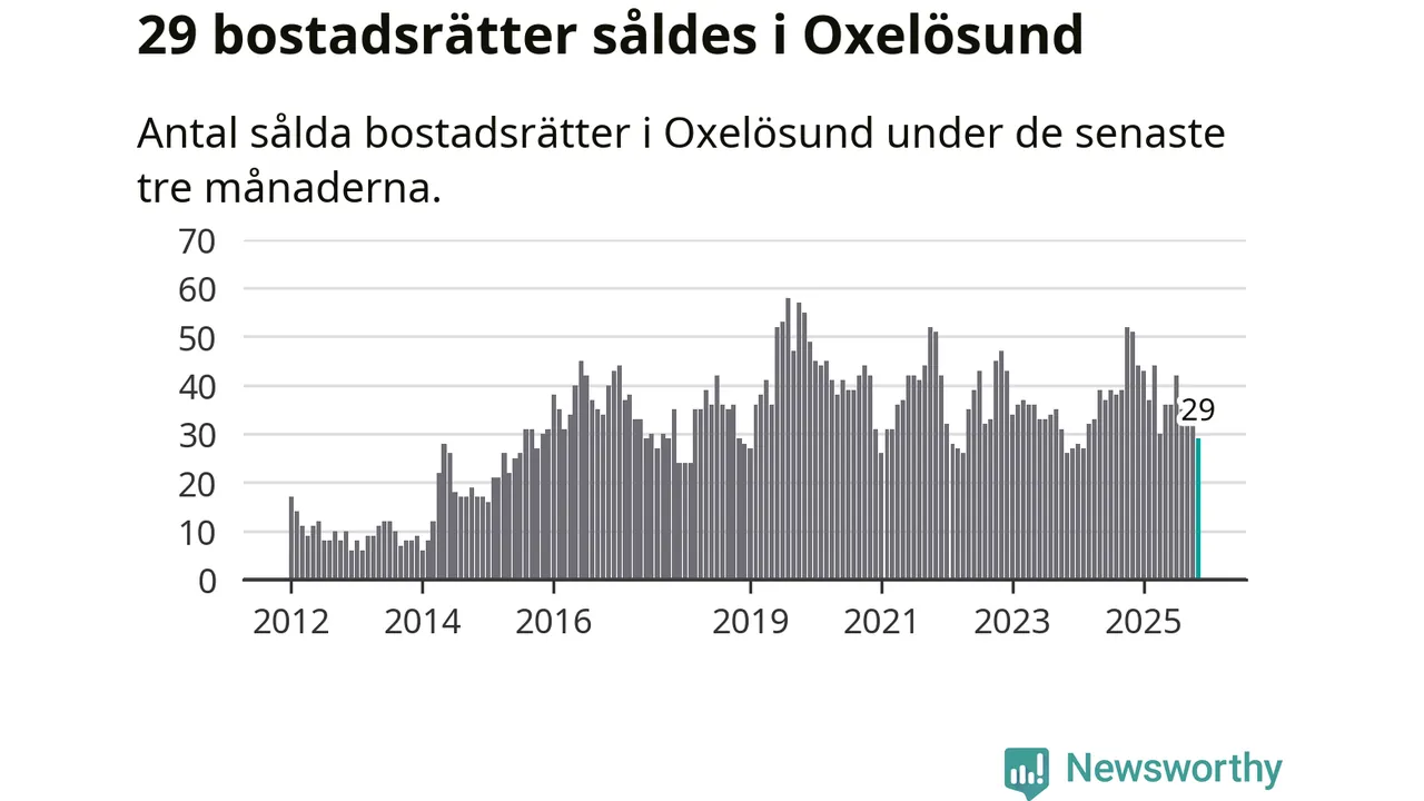 Mellan september och november såldes 29 bostadsrätter i Oxelösunds kommun. Det är relativt få sett till aktiviteten på bostadsmarknaden i kommunen under de senaste tolv månaderna, samt det historiska snittet för den här tiden på året.