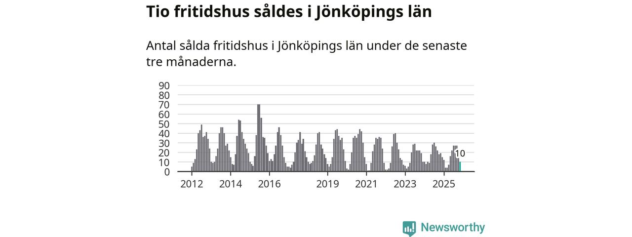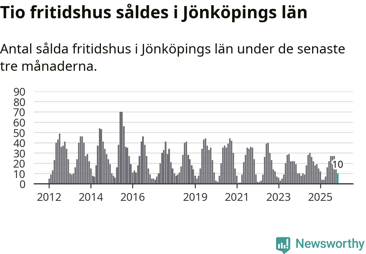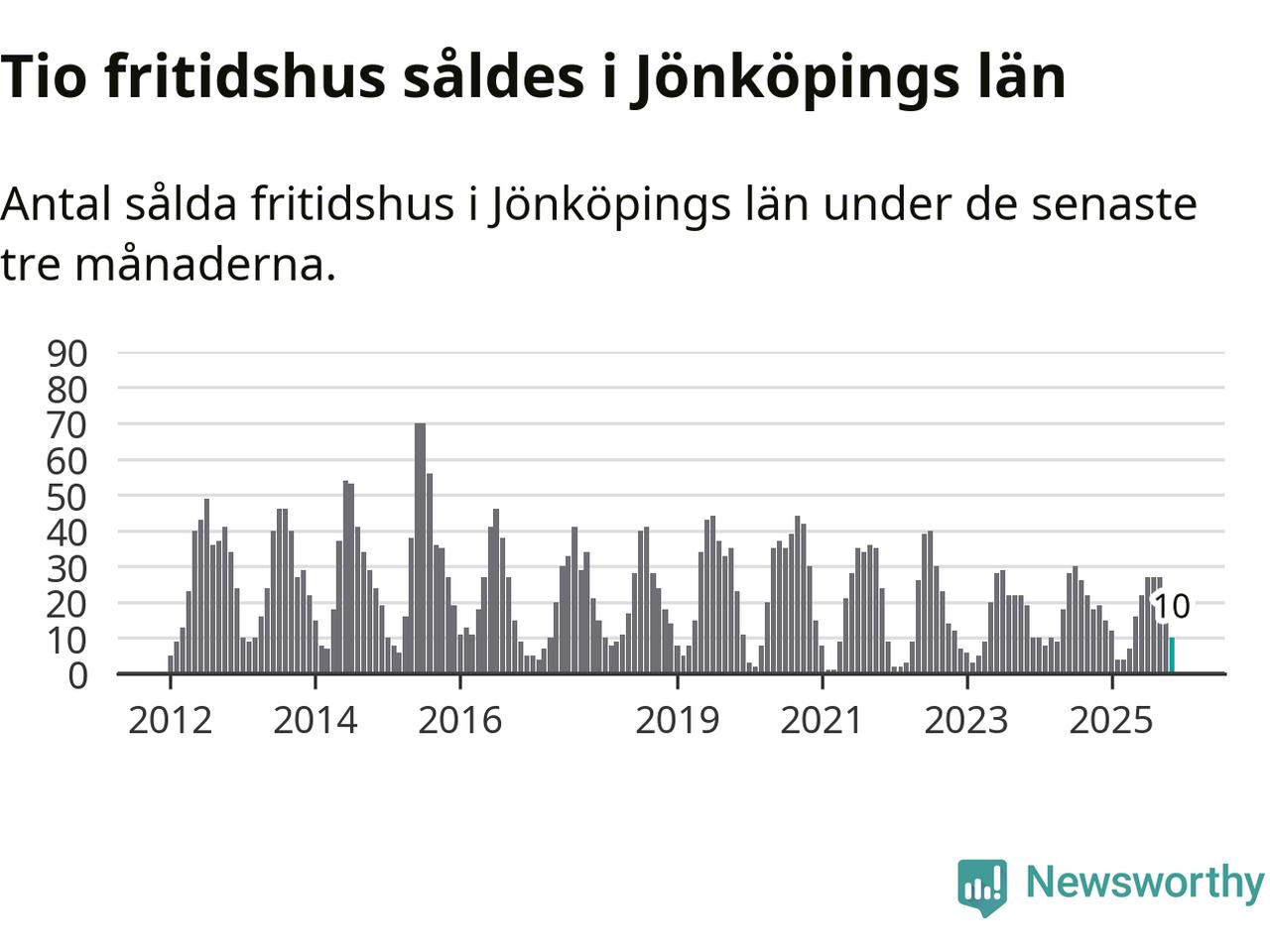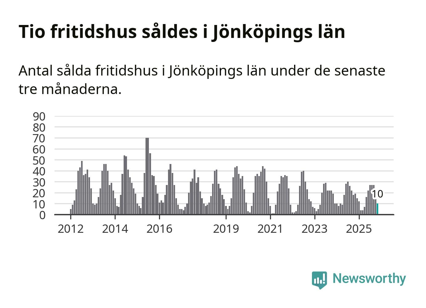 Sammanlagt såldes tio fritidshus i Jönköpings län mellan september och november till ett genomsnittligt pris på 1,7 miljoner kronor. I fjol gjordes 19 affärer vid den här tiden på året.