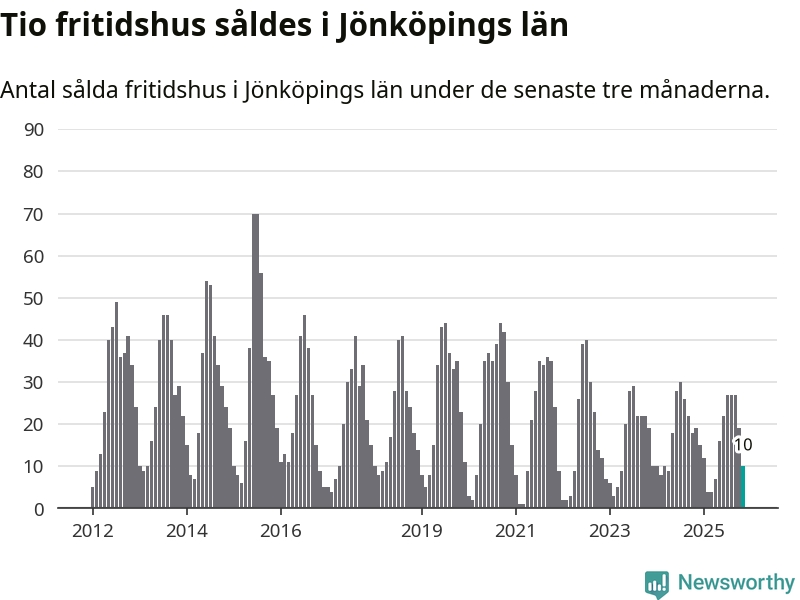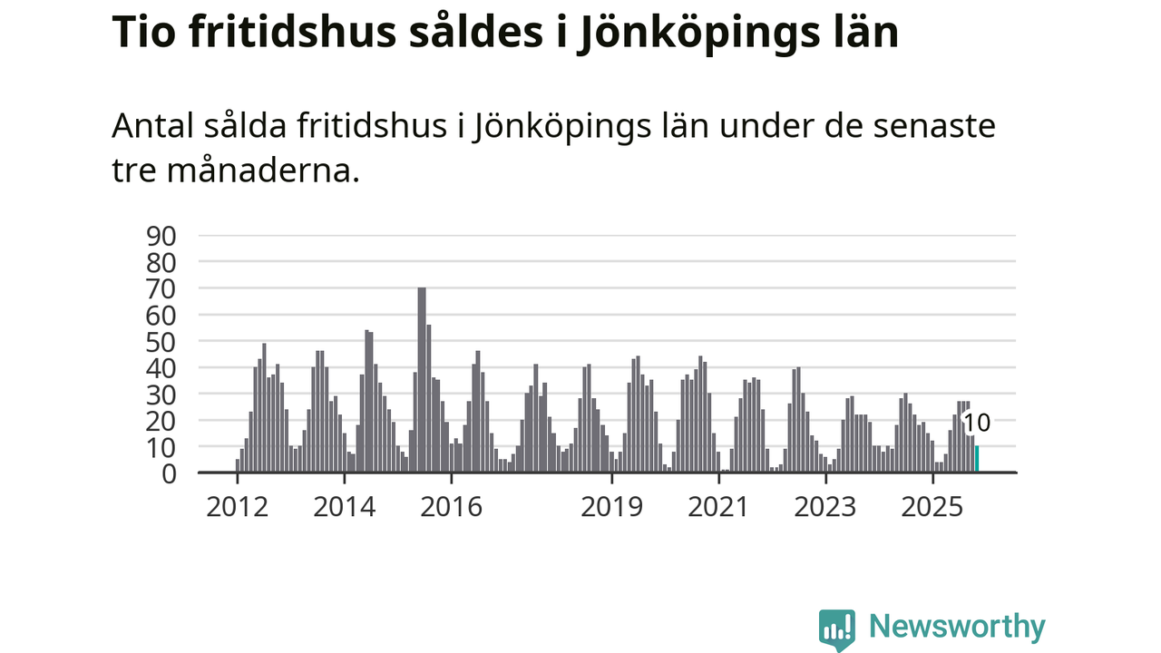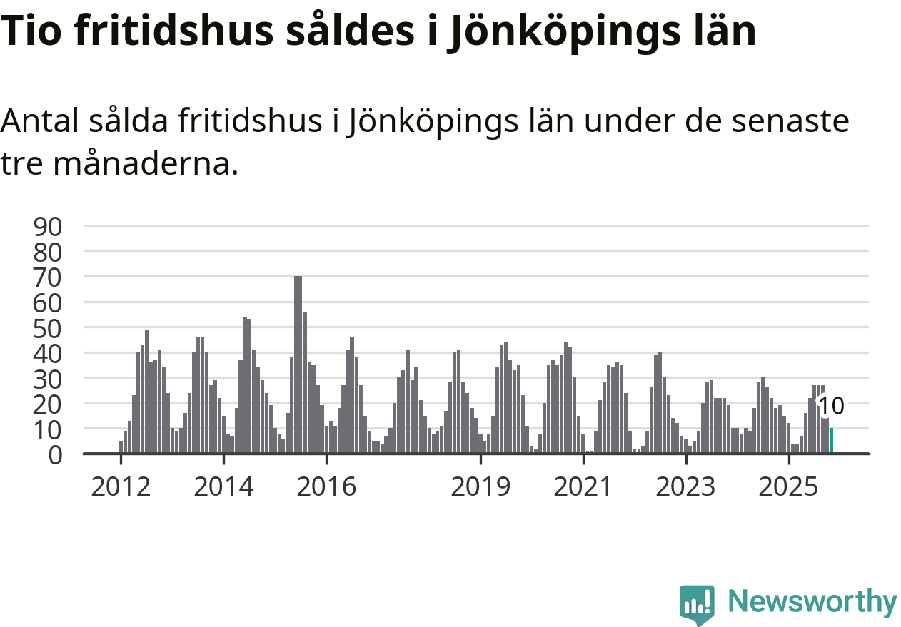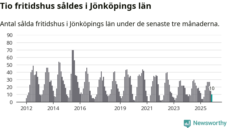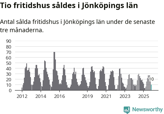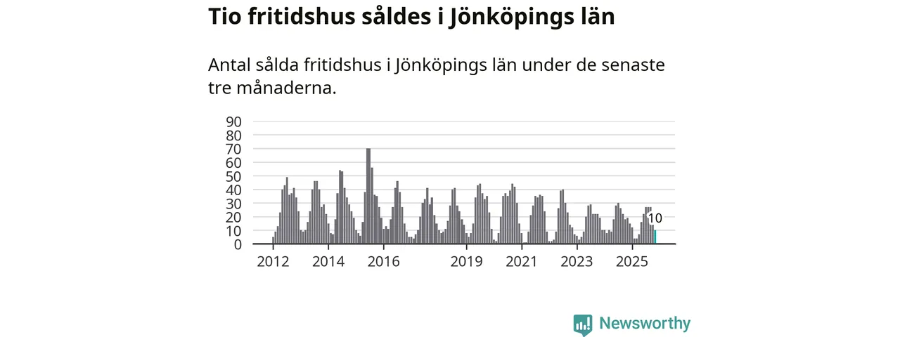 Sammanlagt såldes tio fritidshus i Jönköpings län mellan september och november till ett genomsnittligt pris på 1,7 miljoner kronor. I fjol gjordes 19 affärer vid den här tiden på året.