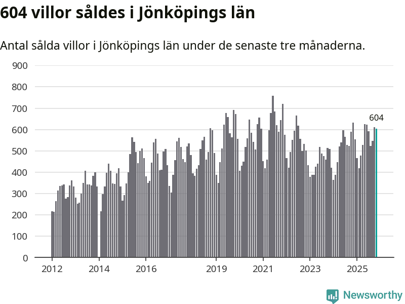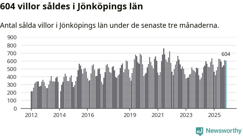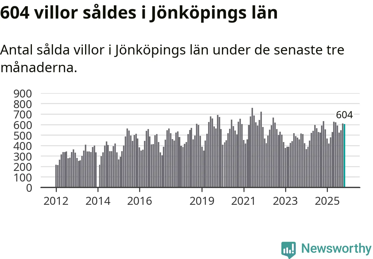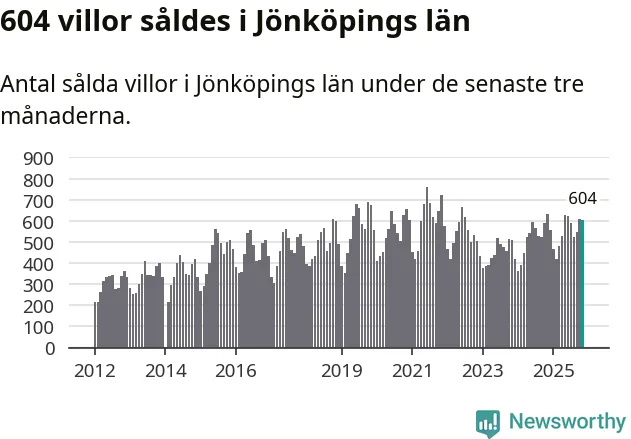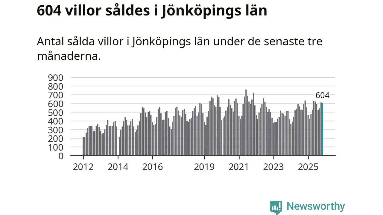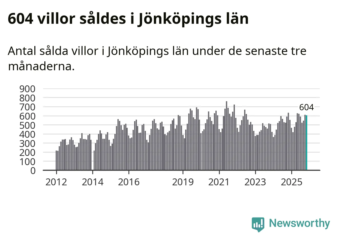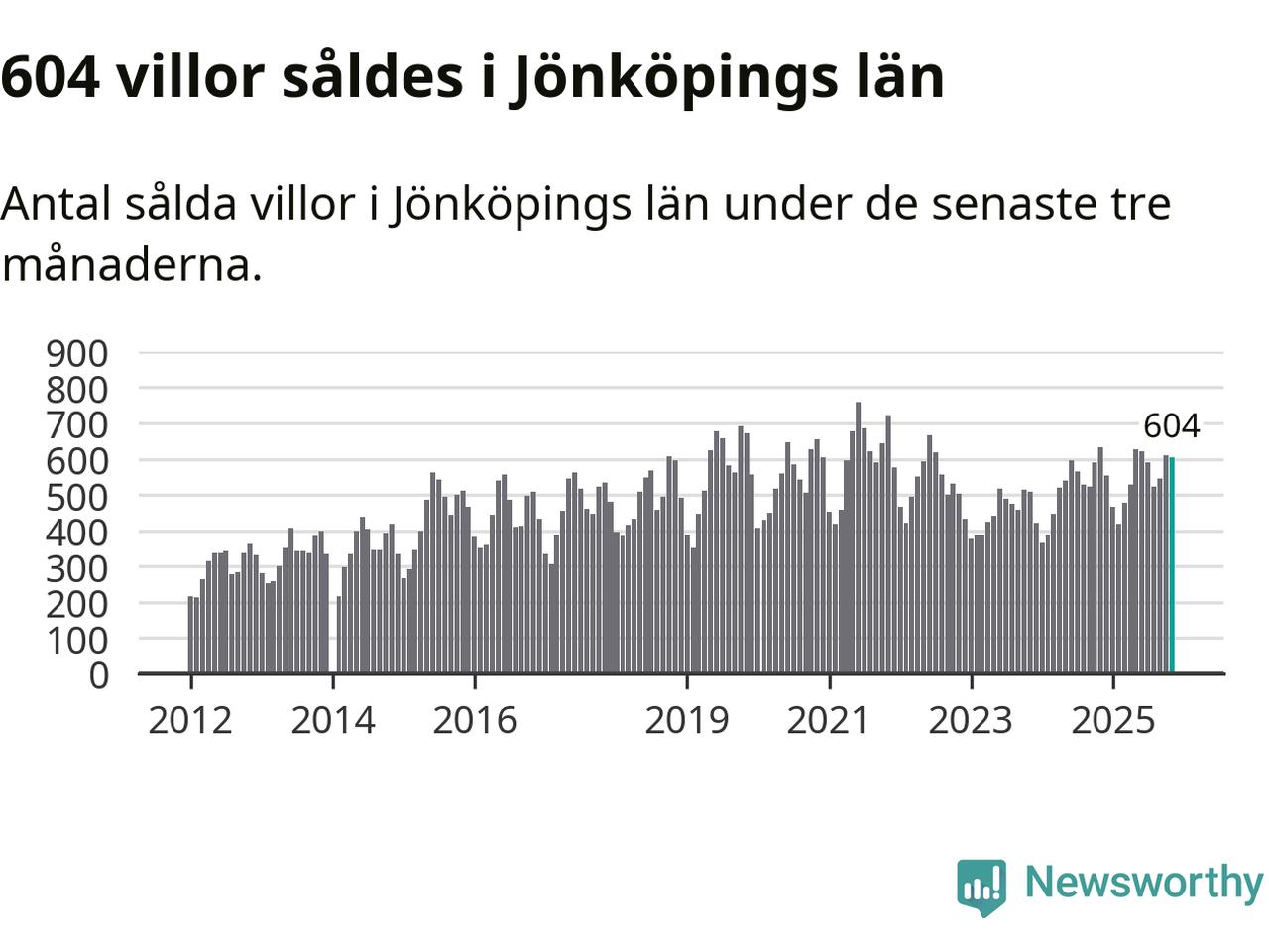Sammanlagt såldes 604 villor i Jönköpings län mellan september och november till ett genomsnittligt pris på 2,9 miljoner kronor. I fjol gjordes 632 affärer vid den här tiden på året.