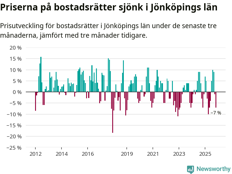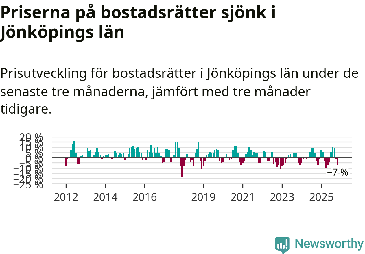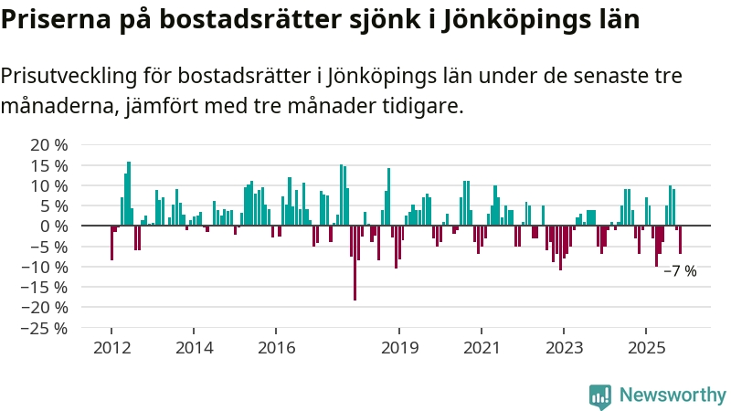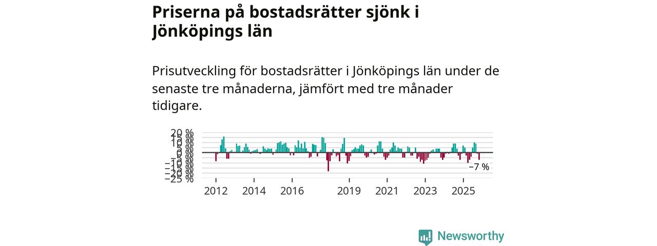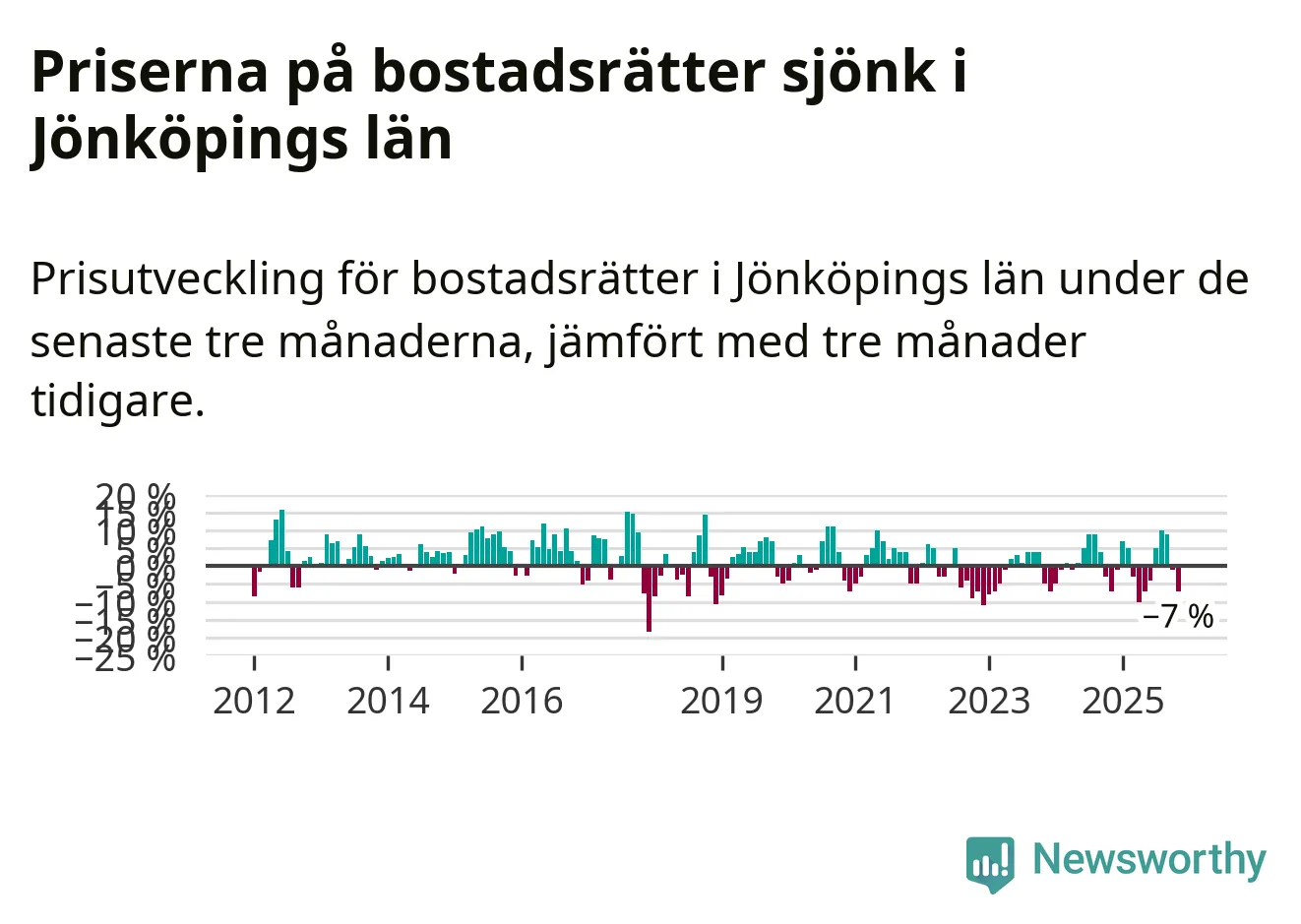 Priserna på bostadsrätter har gått ner i Jönköpings län. Medelpriset på försäljningarna under de senaste tre månaderna visar på en nedgång med 7 procent.