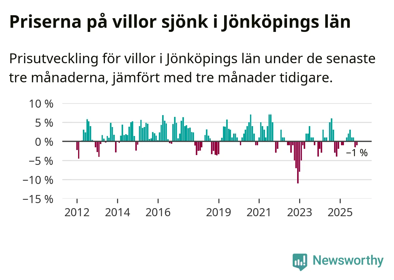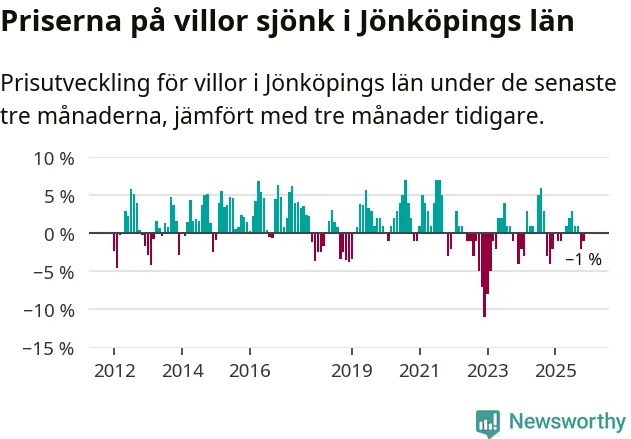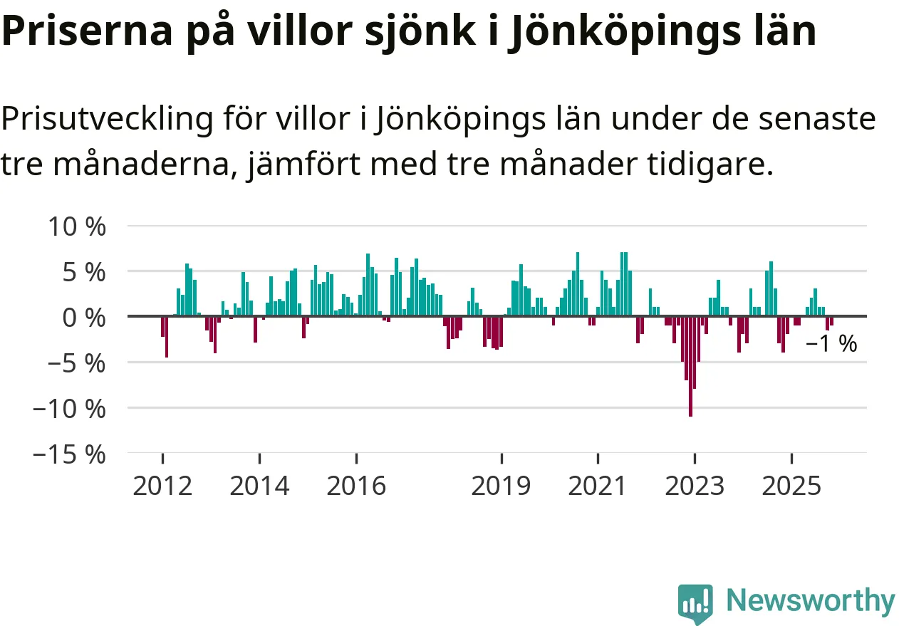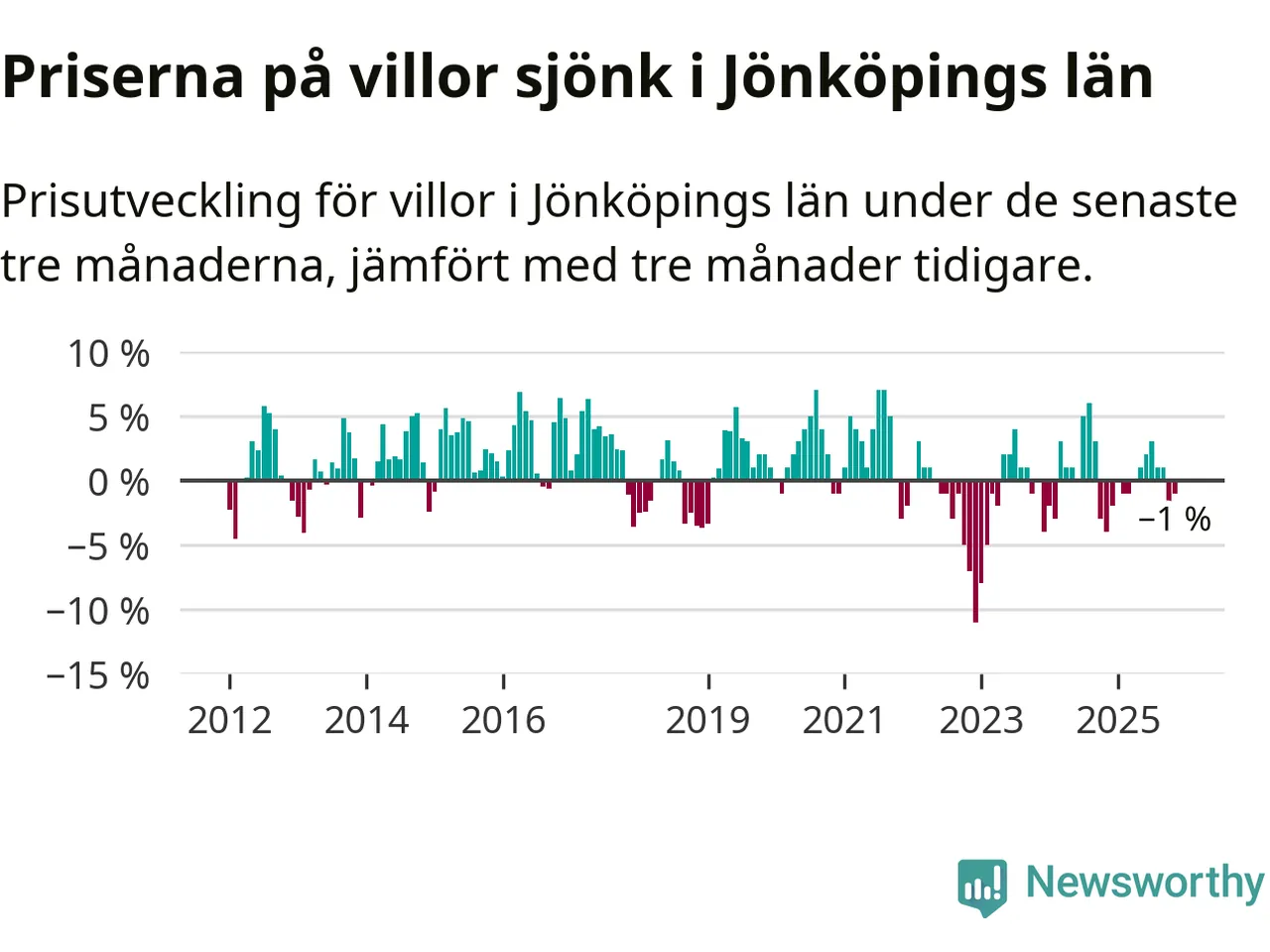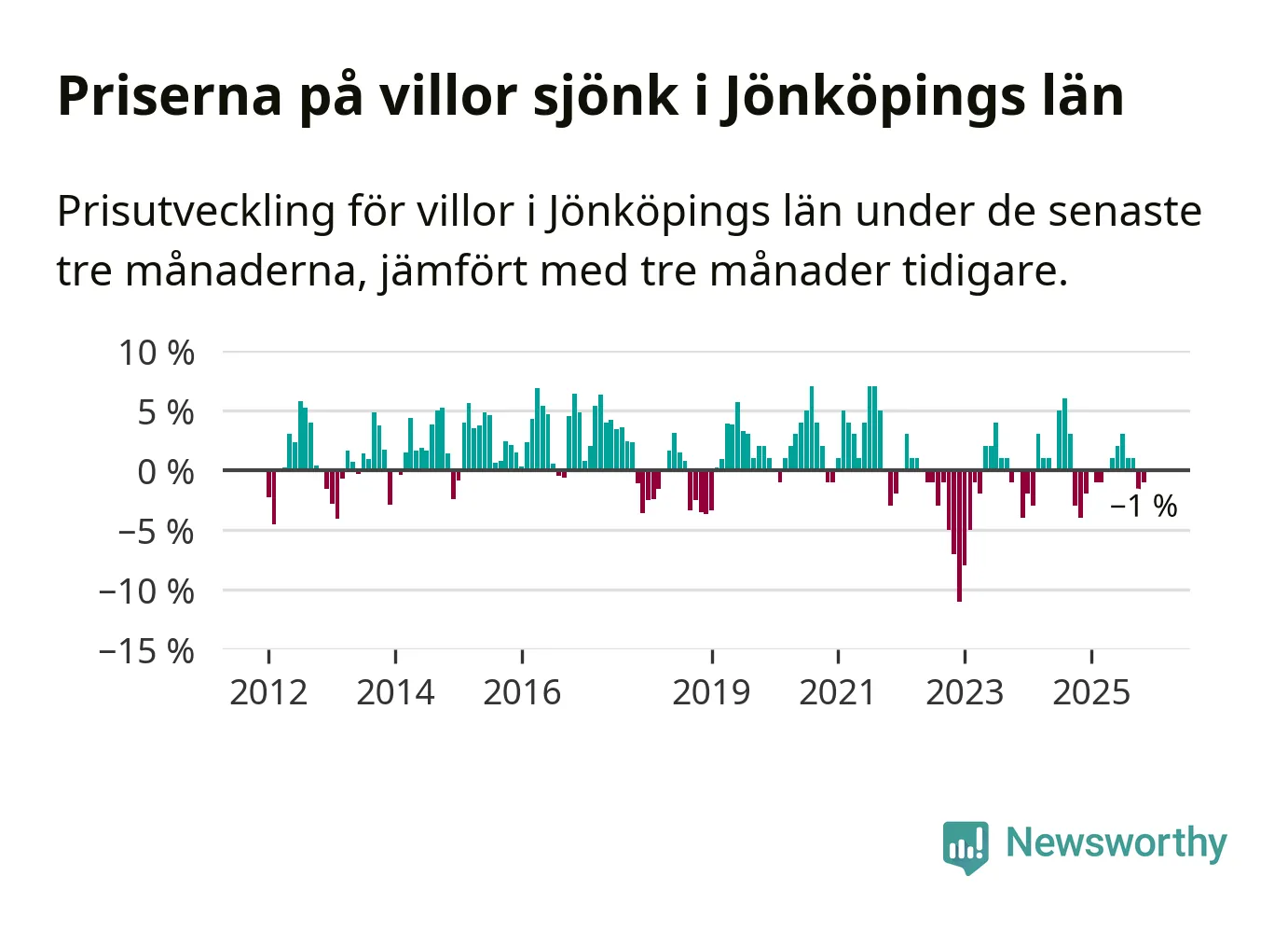 Villapriserna har gått ner i Jönköpings län. Medelpriset på försäljningarna under de senaste tre månaderna visar på en nedgång med 1 procent.