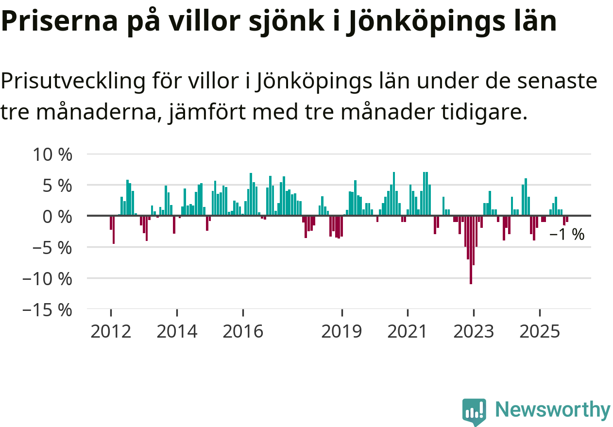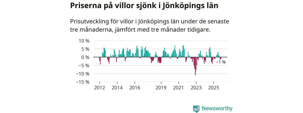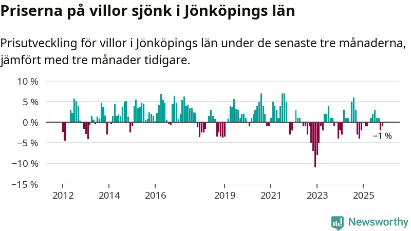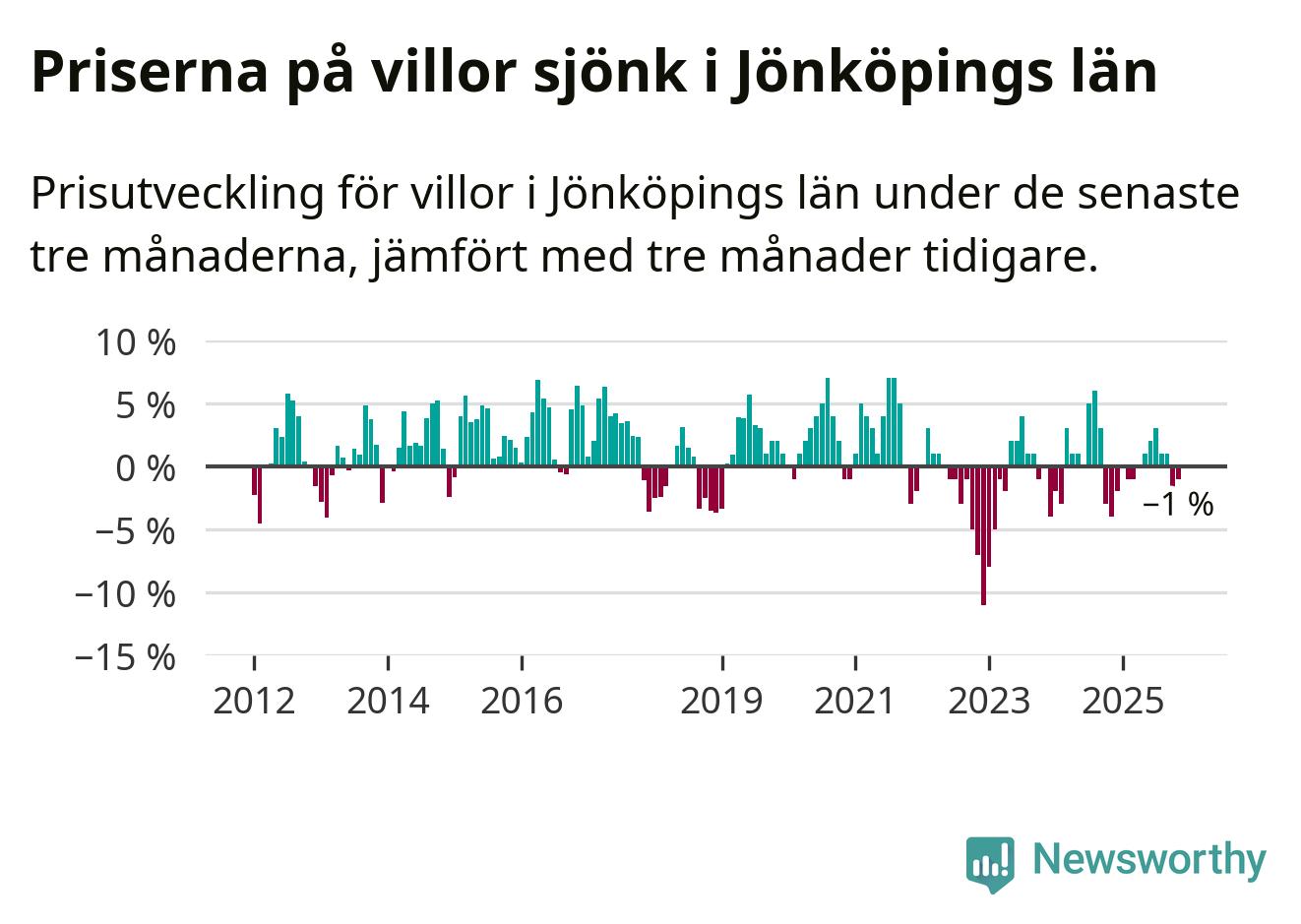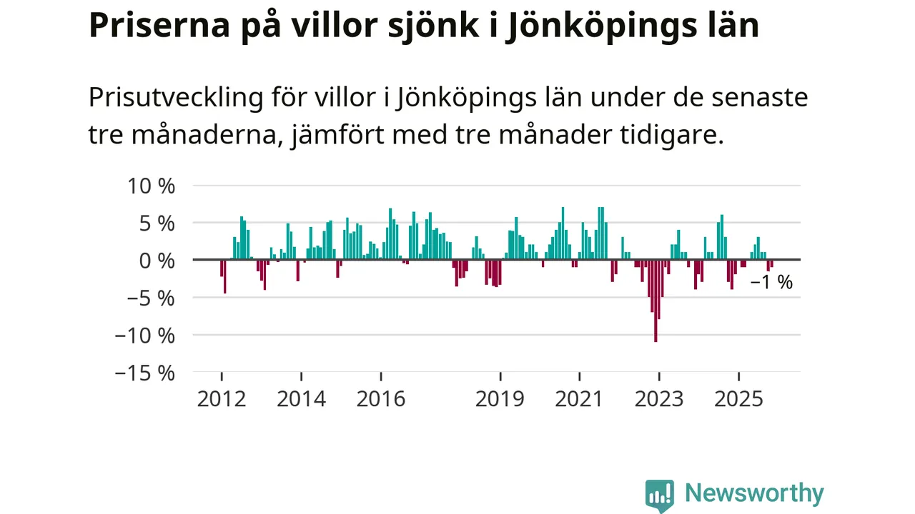Villapriserna har gått ner i Jönköpings län. Medelpriset på försäljningarna under de senaste tre månaderna visar på en nedgång med 1 procent.