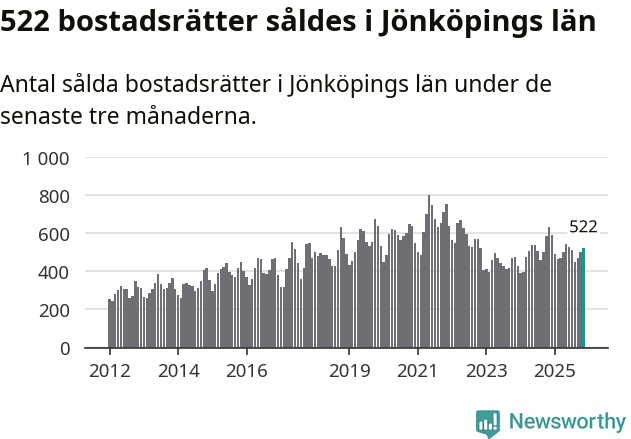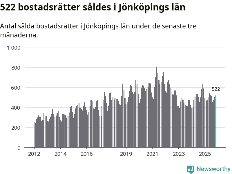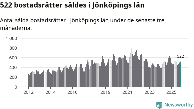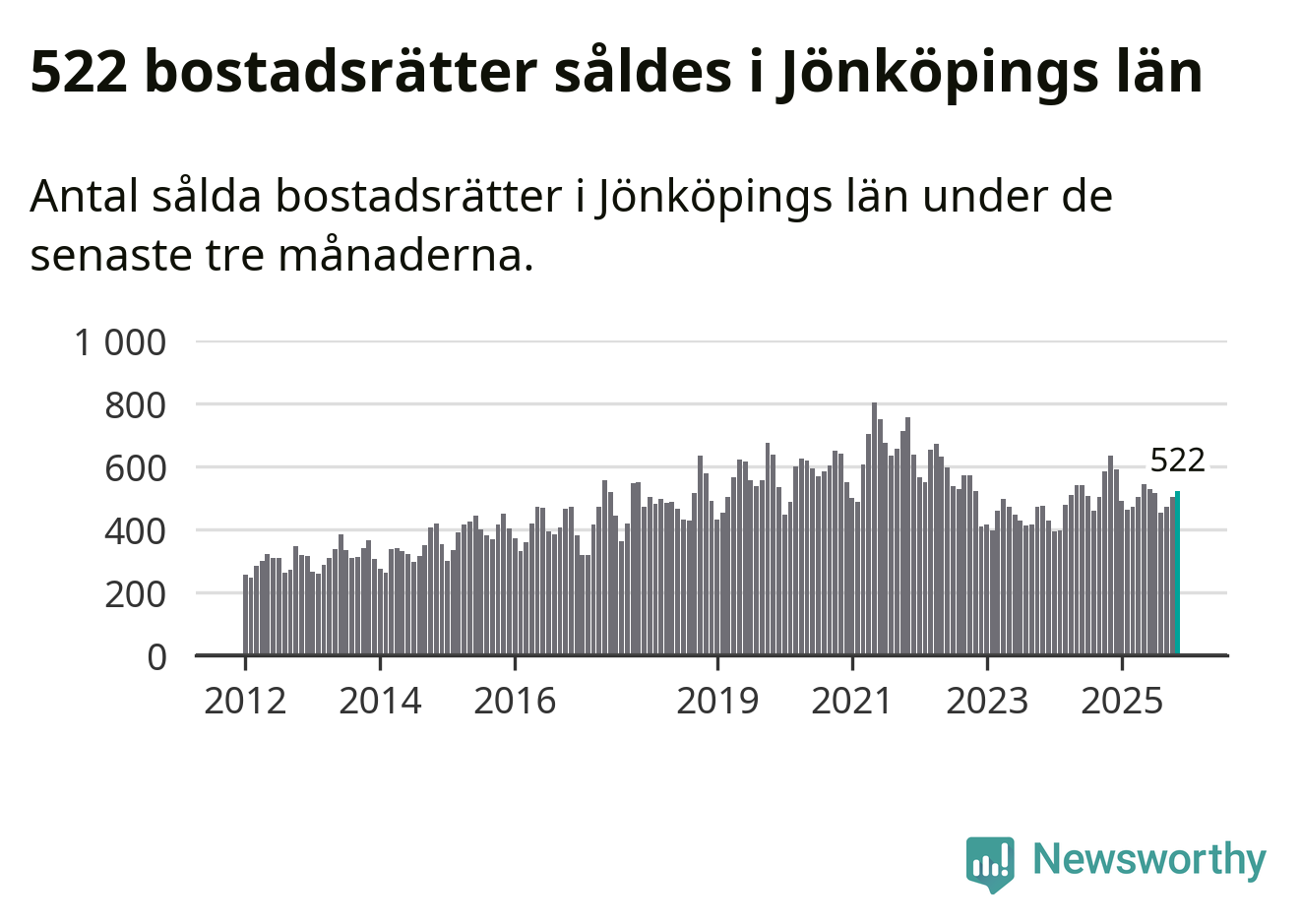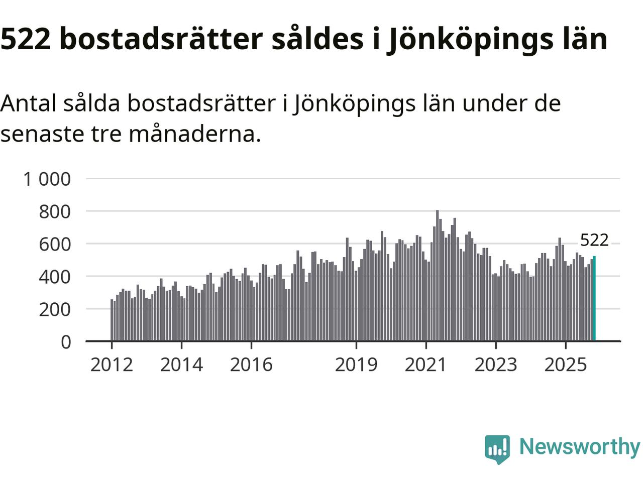 Sammanlagt såldes 522 bostadsrätter i Jönköpings län mellan september och november till ett genomsnittligt pris på 1,8 miljoner kronor. I fjol gjordes 634 affärer vid den här tiden på året.