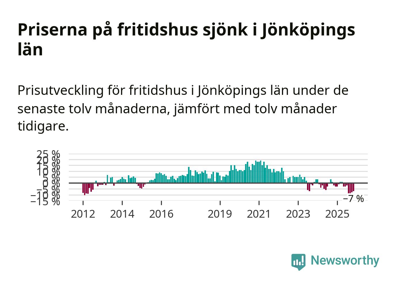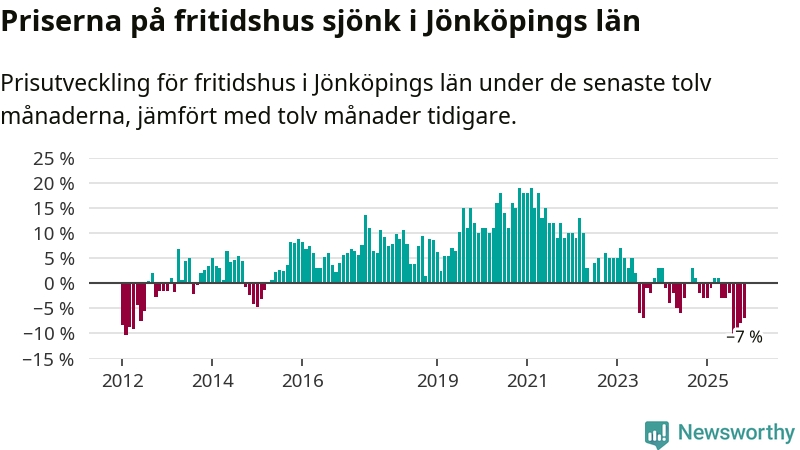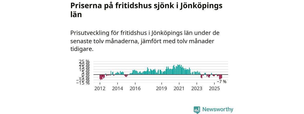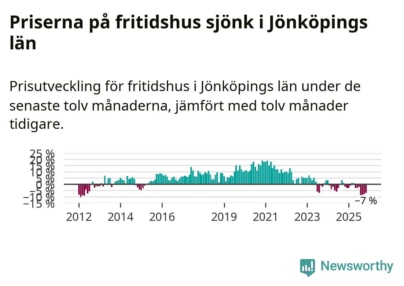Priserna på fritidshus har gått ner i Jönköpings län. Medelpriset på försäljningarna under de senaste tolv månaderna visar på en nedgång med 7 procent.